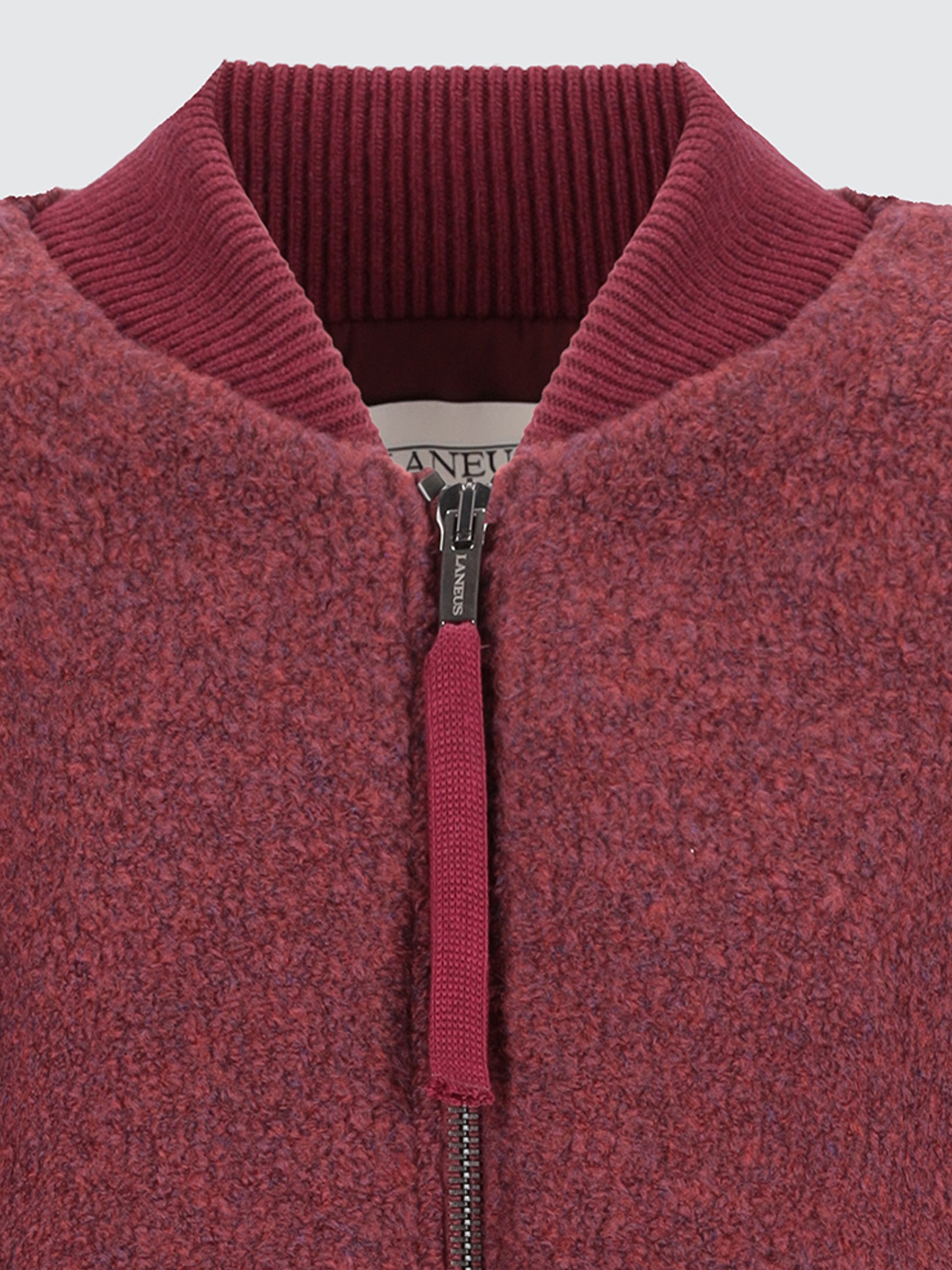 Oversized lines and a cozy texture define this bouclé knit bomber by Laneus. Made from a blend of merino wool and technical fibers, it features a front zip closure, welt pockets at the sides, and a military-style pocket on the sleeve with zip and knit pull tab. A soft-structured outerwear piece with a clean design, perfect for completing both casual and minimal looks. Made in Italy.