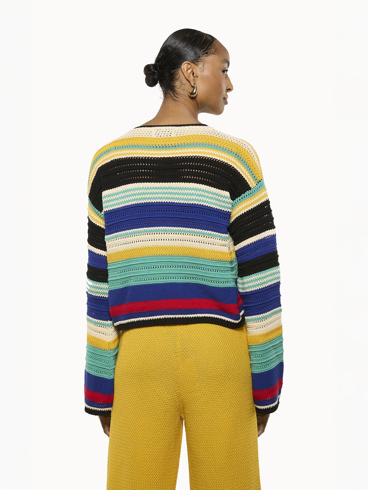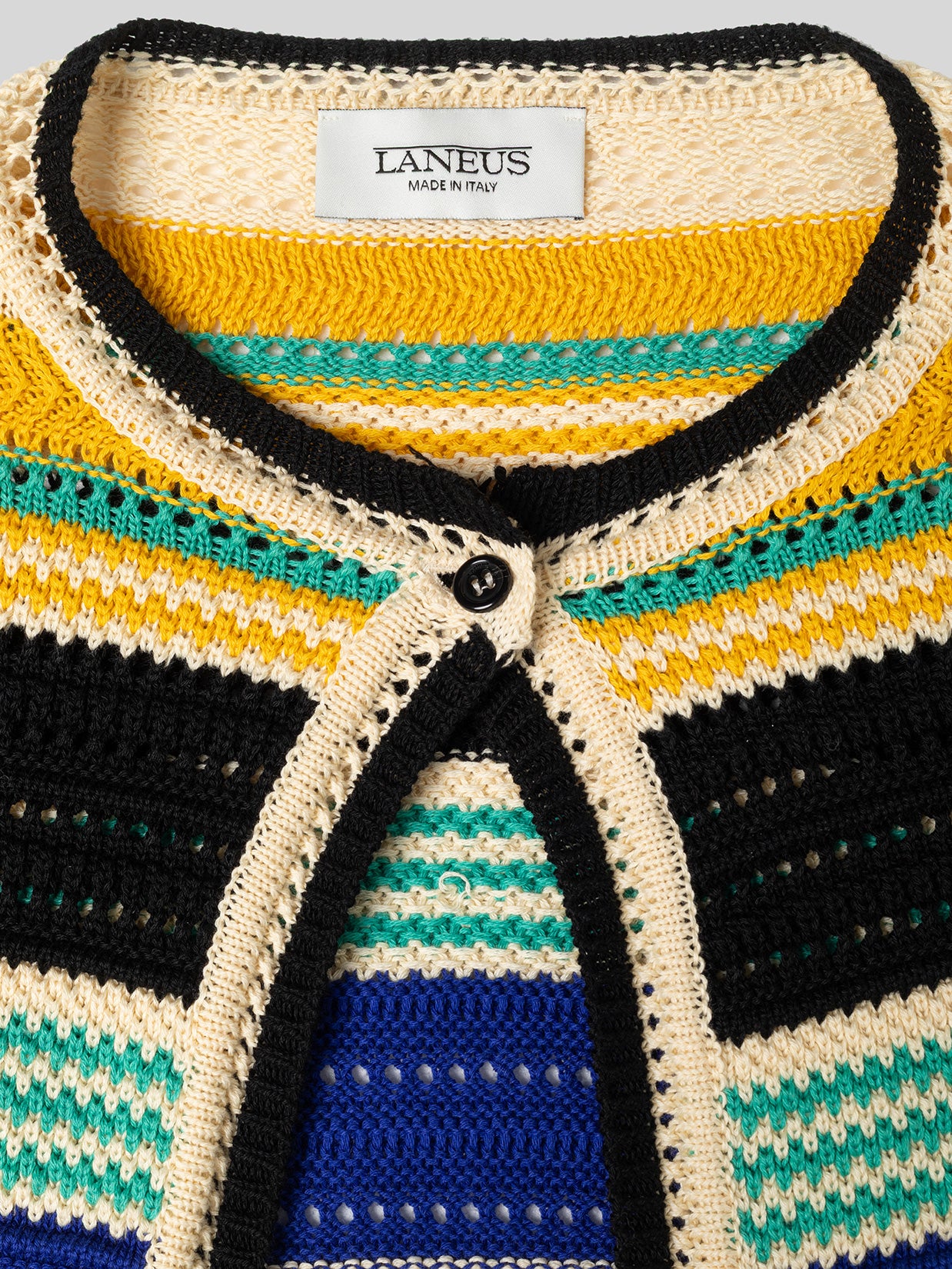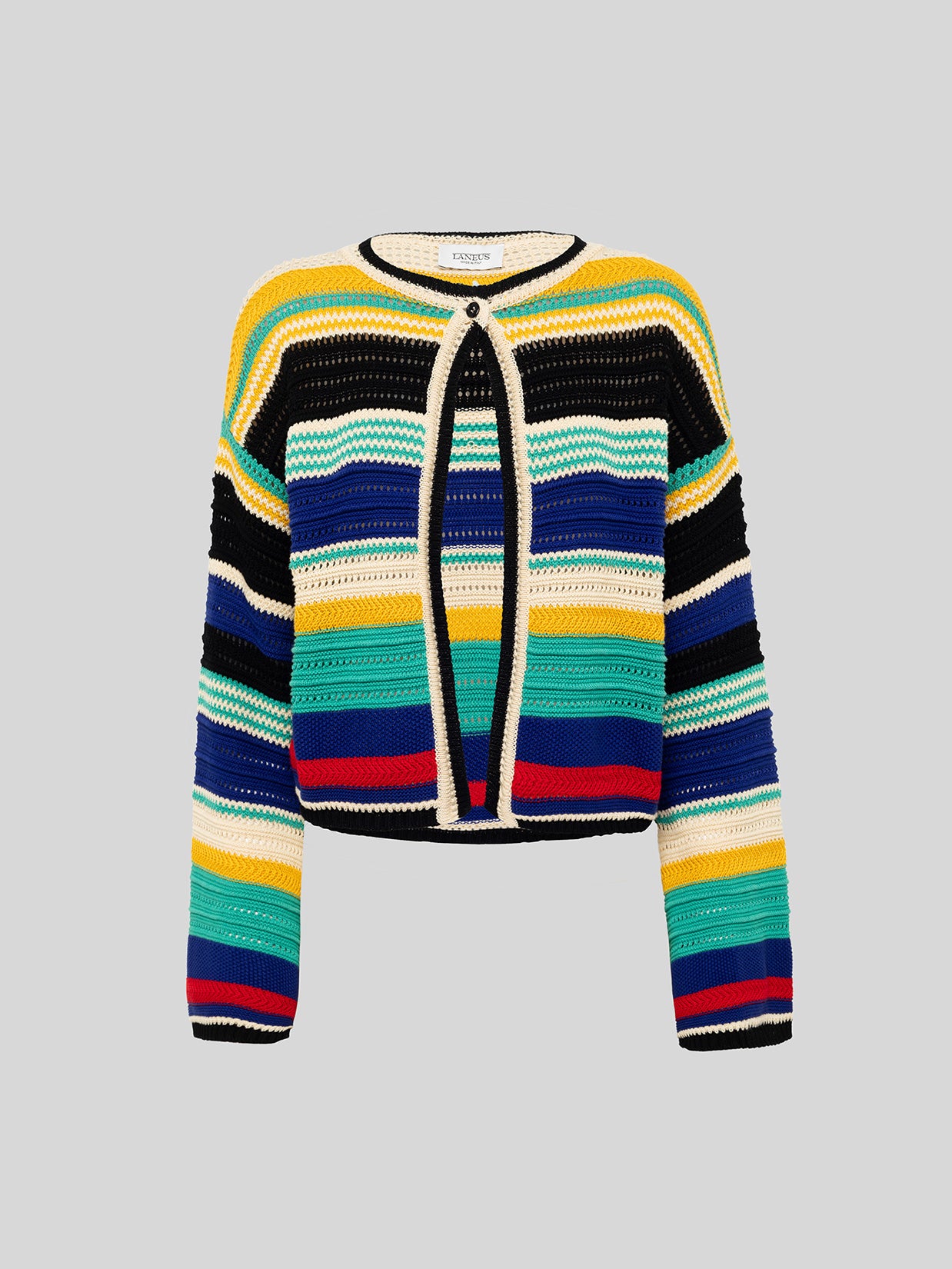 This Laneus cardigan is crafted from a cotton knit featuring a mesh stitch. It features a cropped silhouette with a small front button closure. Made in Italy.