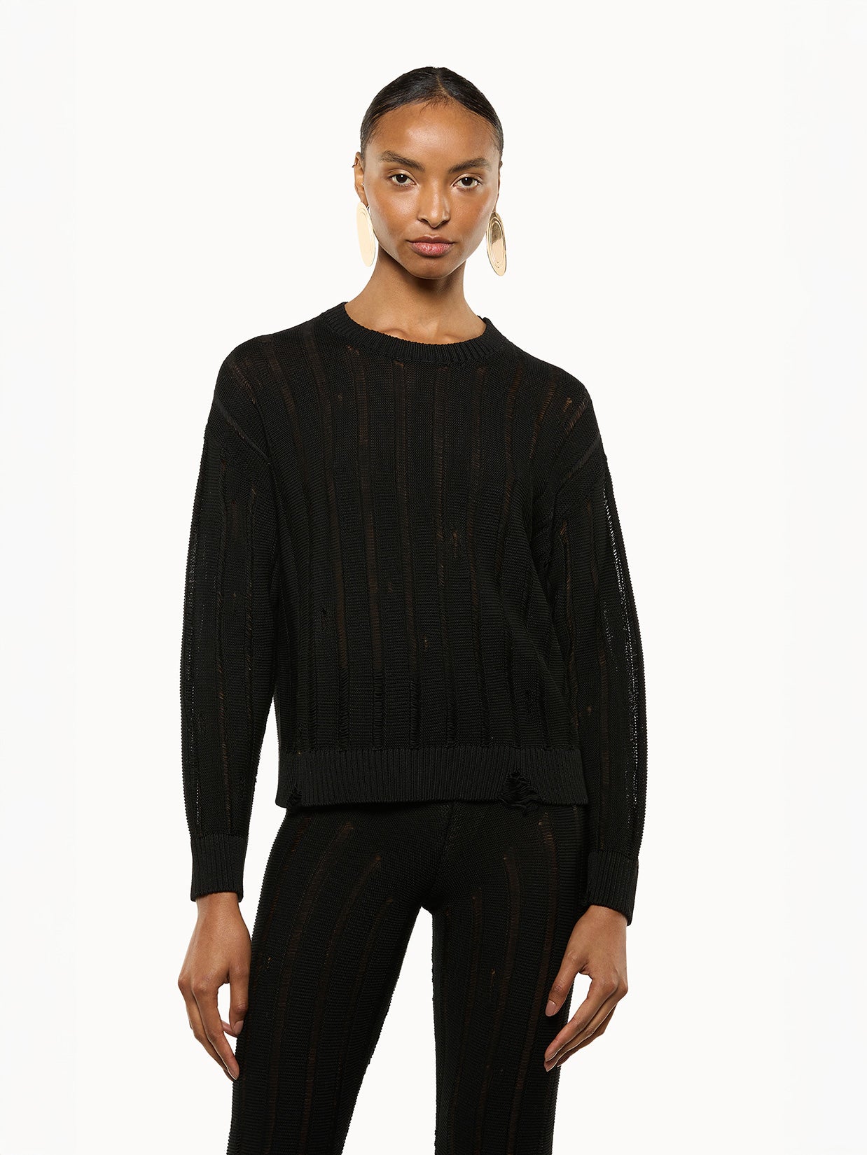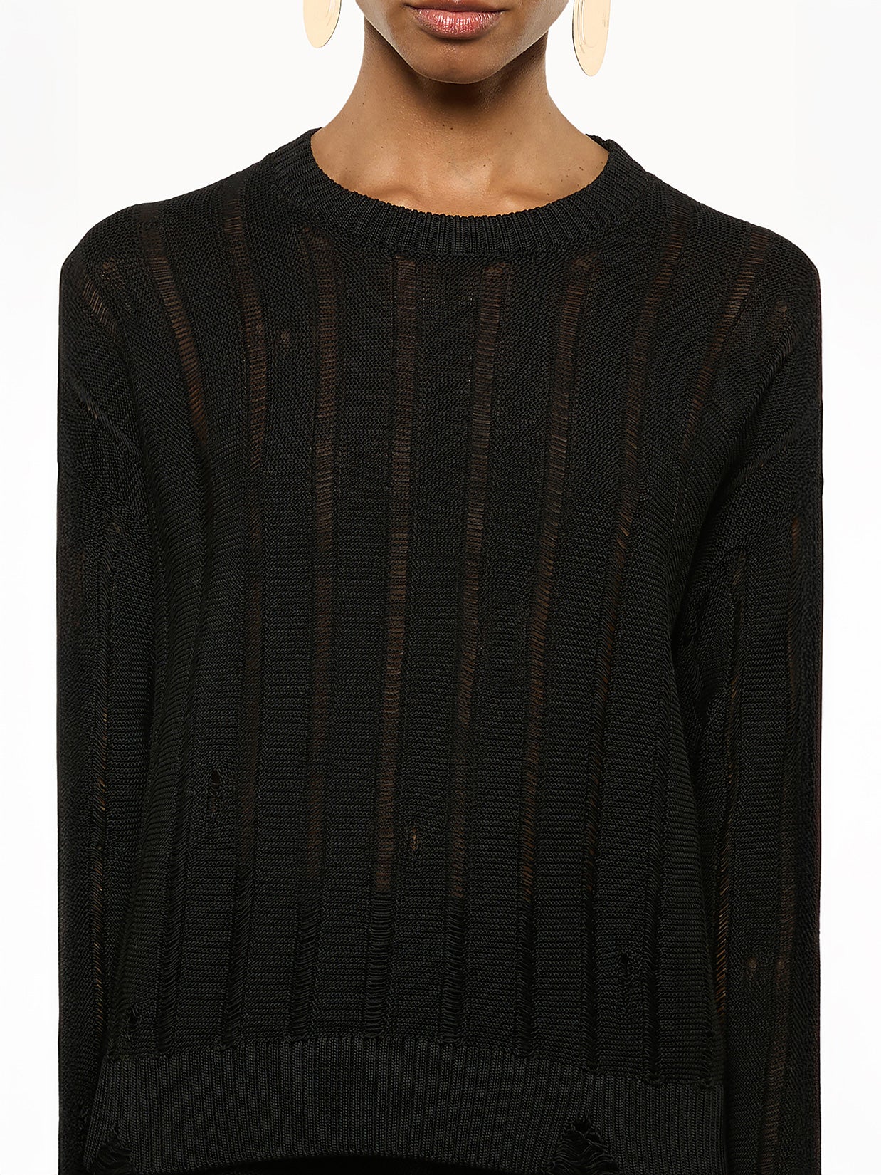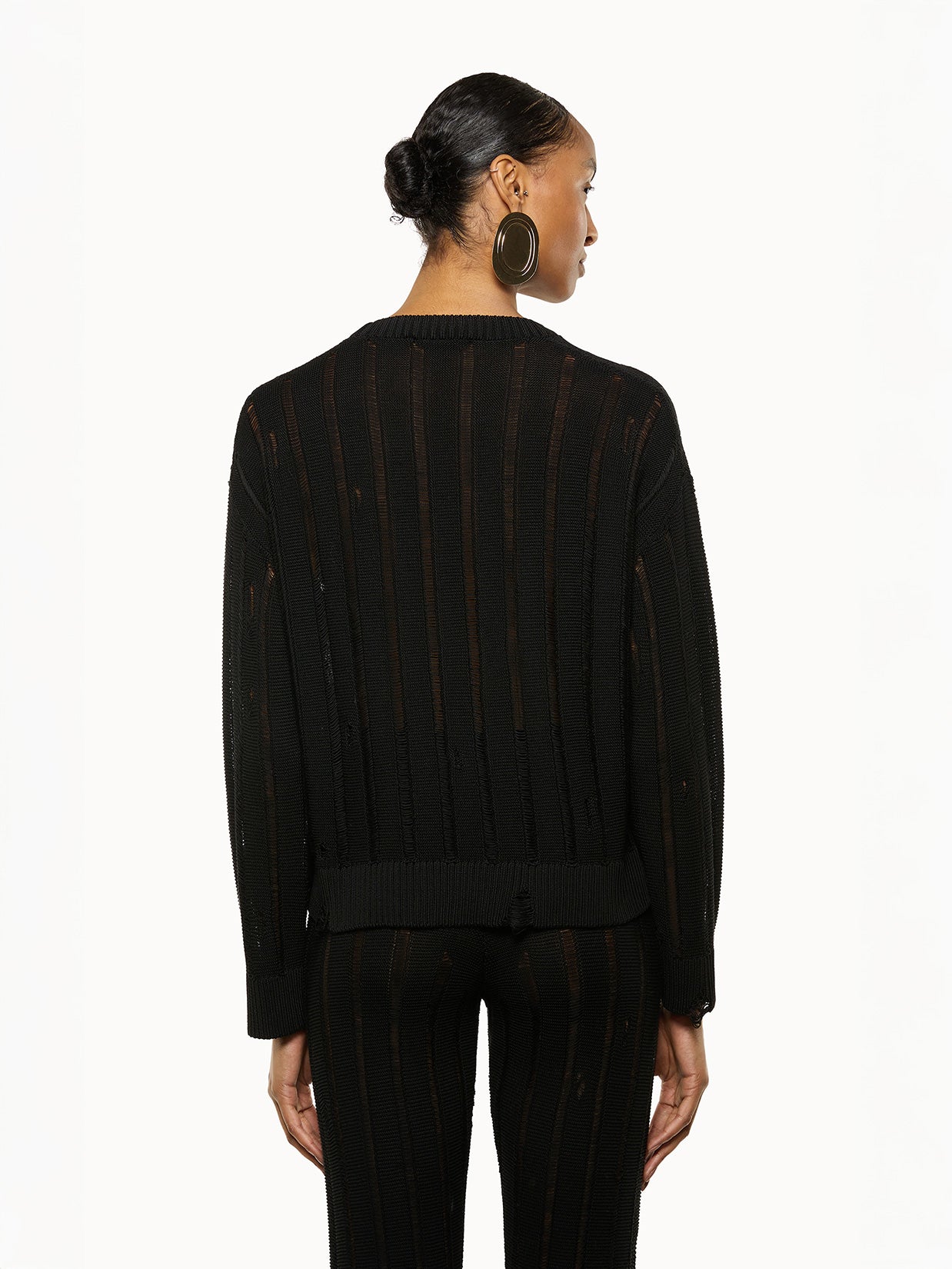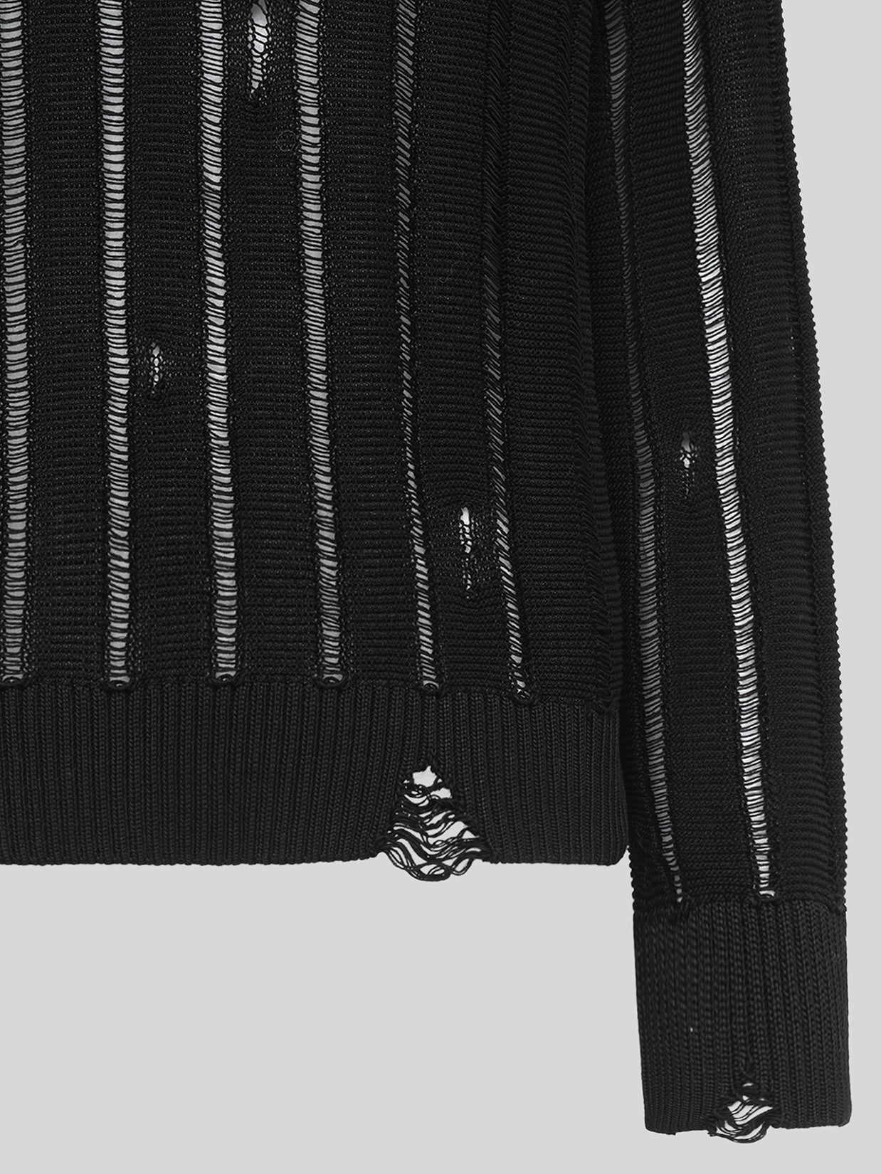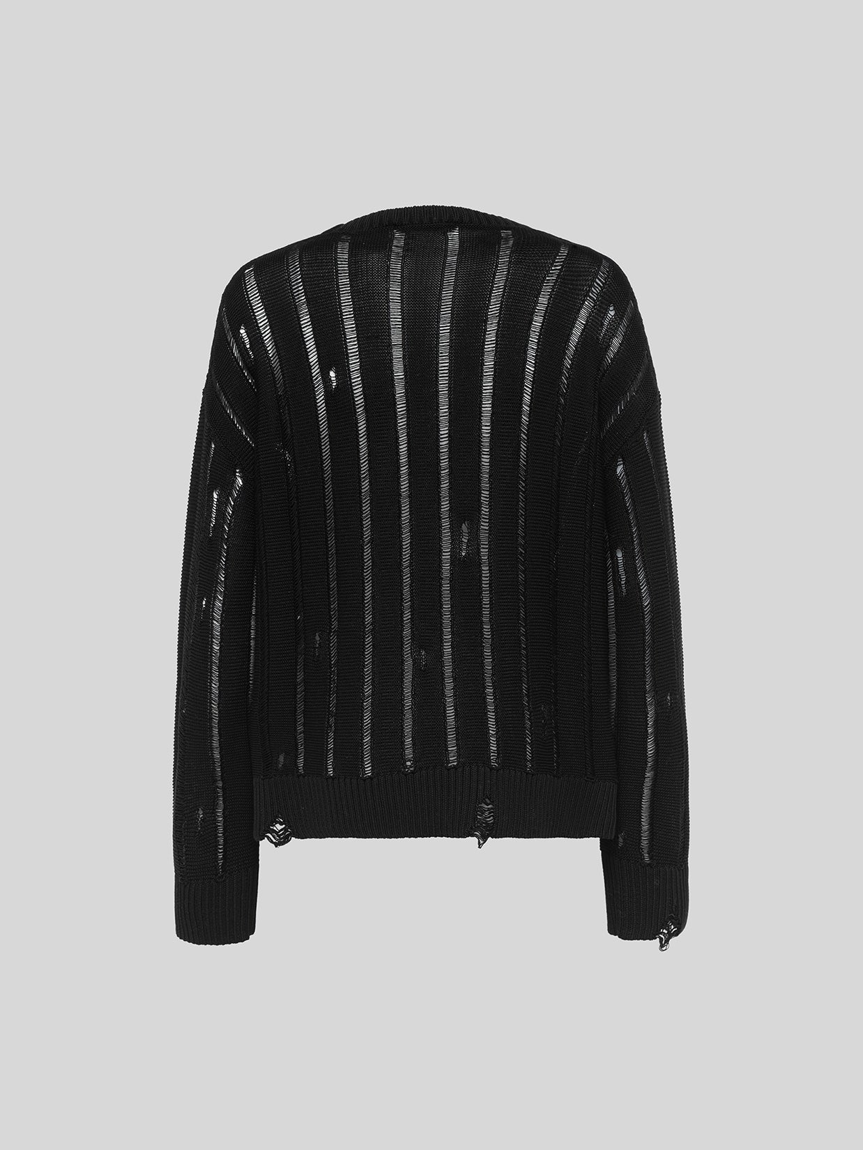 Long-sleeved sweater made of 100% cotton, featuring distressed effects and a destroyed finish that accentuate its worn-in aesthetic, making it a statement piece with a bold, contemporary character. Made in Italy.