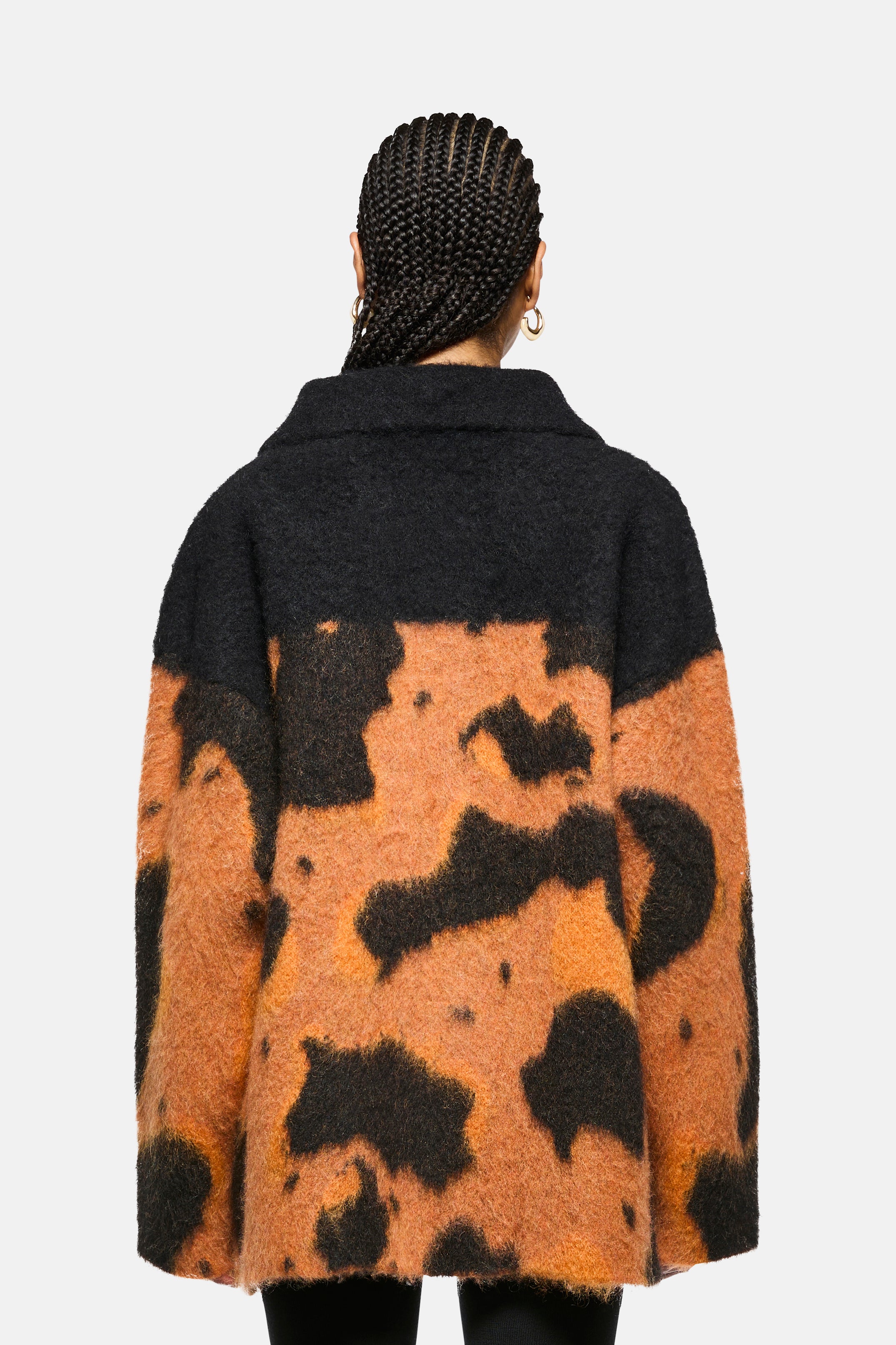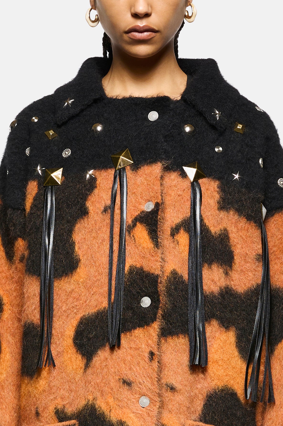 A bold aesthetic blending Texan inspiration with a contemporary edge. This oversized jacquard knit jacket features a leopard-effect pattern and is crafted from a mix of alpaca, wool, and mohair. The design is enriched with decorative studs and leather ties applied to the yoke, creating a striking graphic impact. Finished with snap-button closures and two front patch pockets, it’s a true statement piece designed to stand out. Made in Italy.