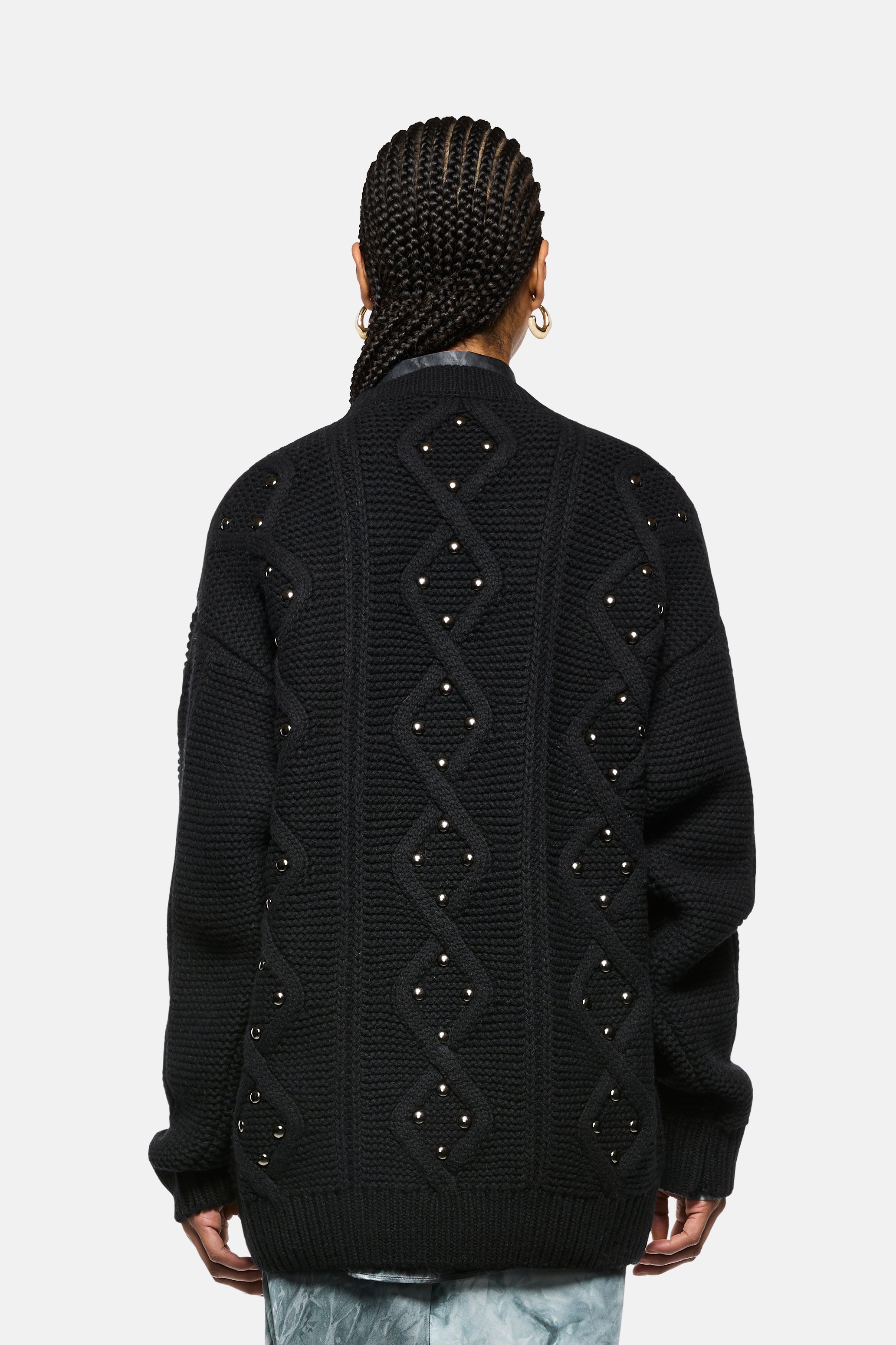 Laneus reimagines a classic with a bold twist. This oversized Laneus crewneck jumper is crafted from a virgin wool, featuring a cable knit design enhanced by studs that follow the pattern. The result is a perfect mix of texture, volume, and edgy detailing for a contemporary look with strong character. Made in Italy.