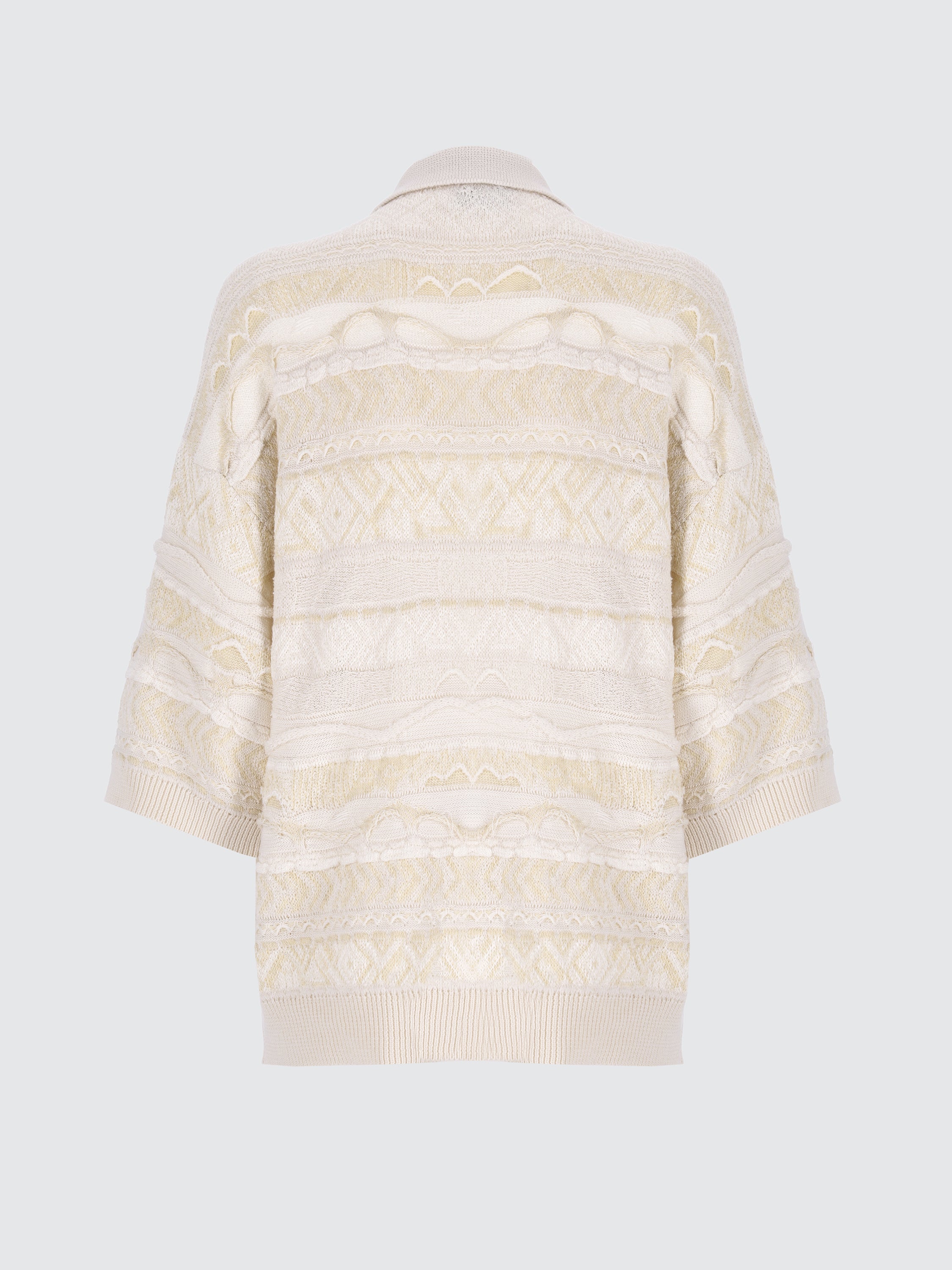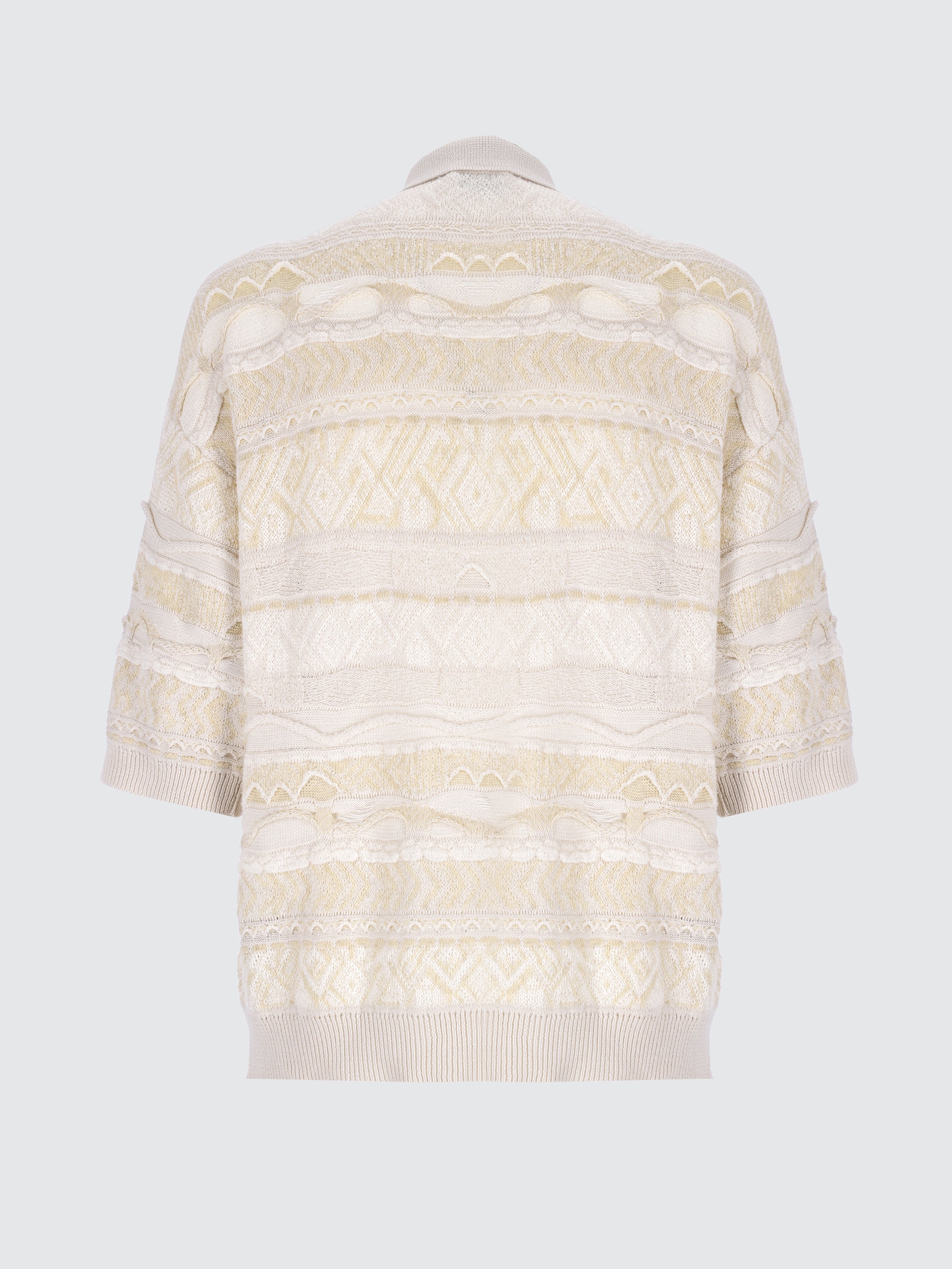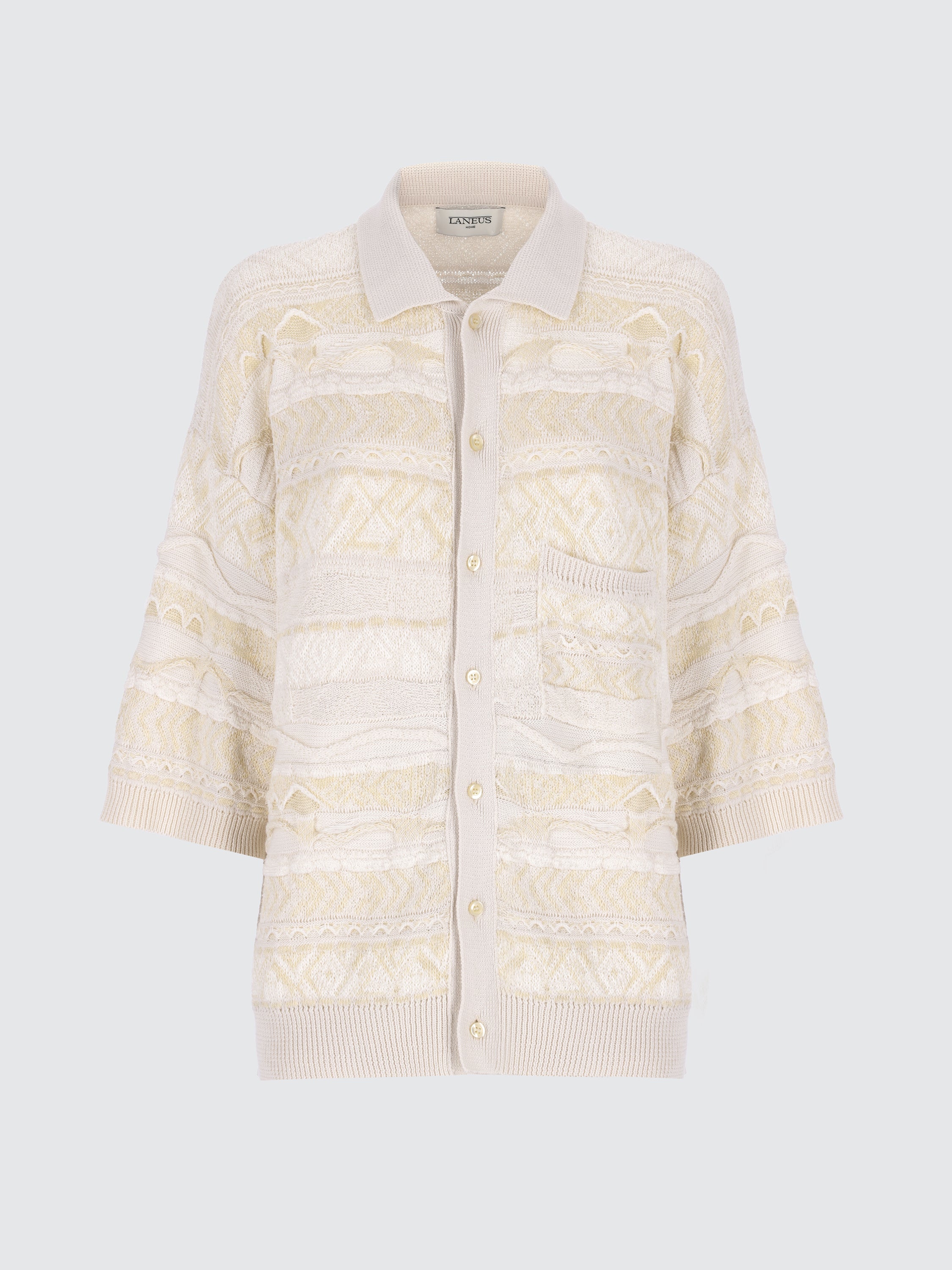 Laneus presenta un'inedita capsule collection di homewear. Questa polo reinterpreta l’iconico jacquard del brand attraverso tonalità neutra. Il design multi-bottone, con tasca frontale e colletto all'italiana si arricchisce di dettagli piquet e cordonetti a rilievo, creando profondità ed effetti tridimensionali. Il mix di filati in cotone, con contrasti tra finiture lucide e opache e l’aggiunta di un morbido filo bouclé, conferisce un equilibrio armonioso tra fascino rustico ed eleganza sofisticata.