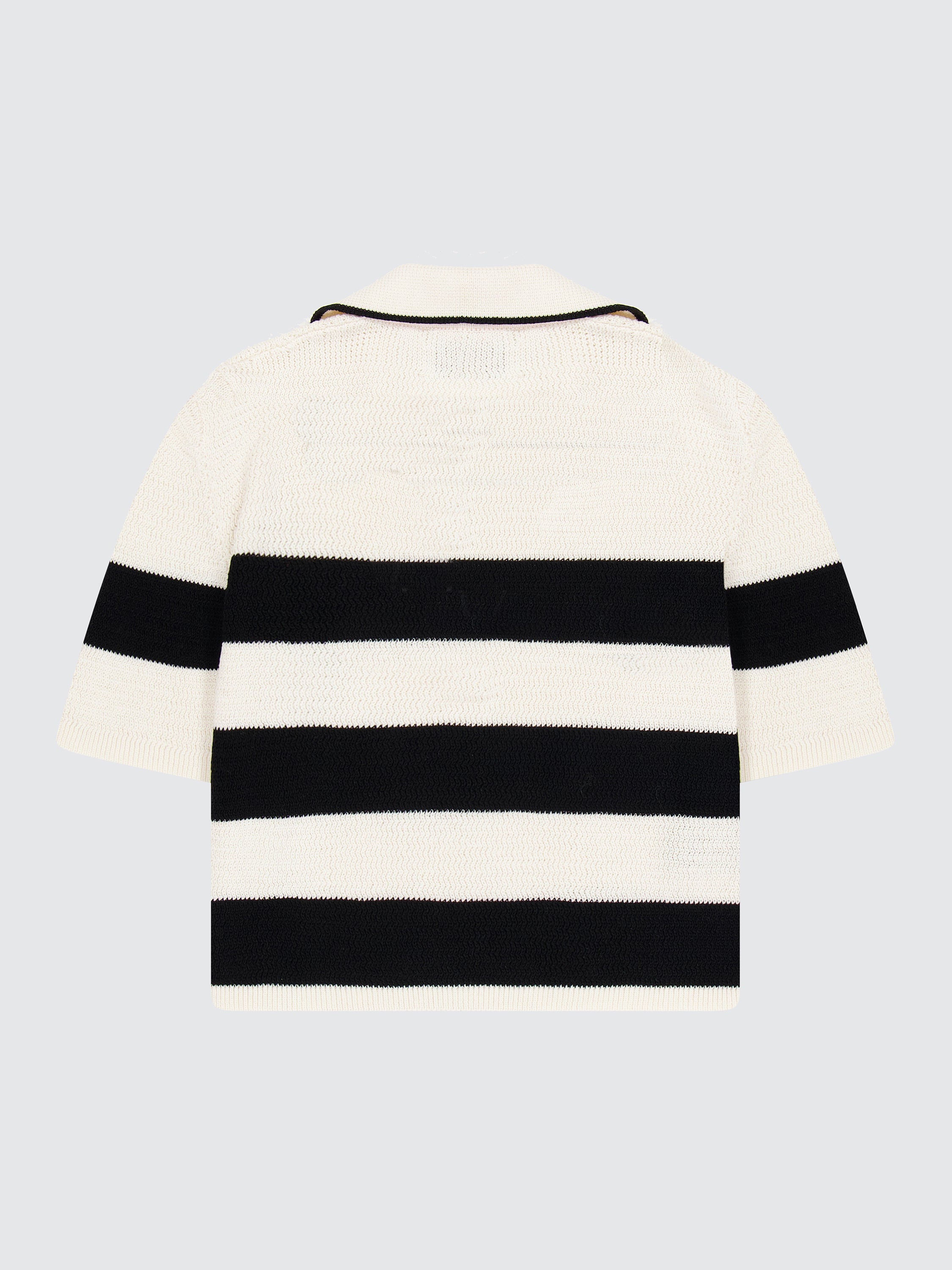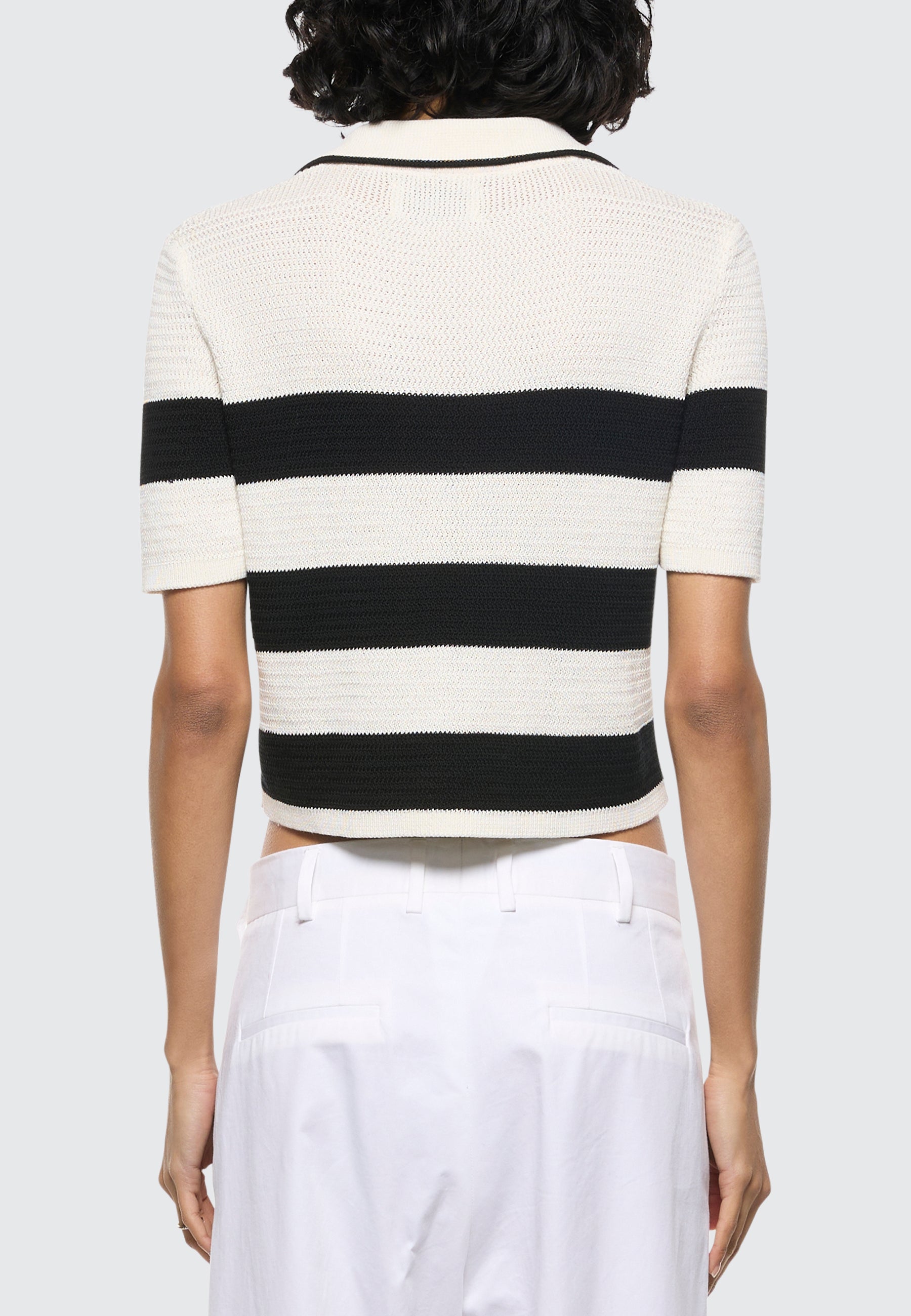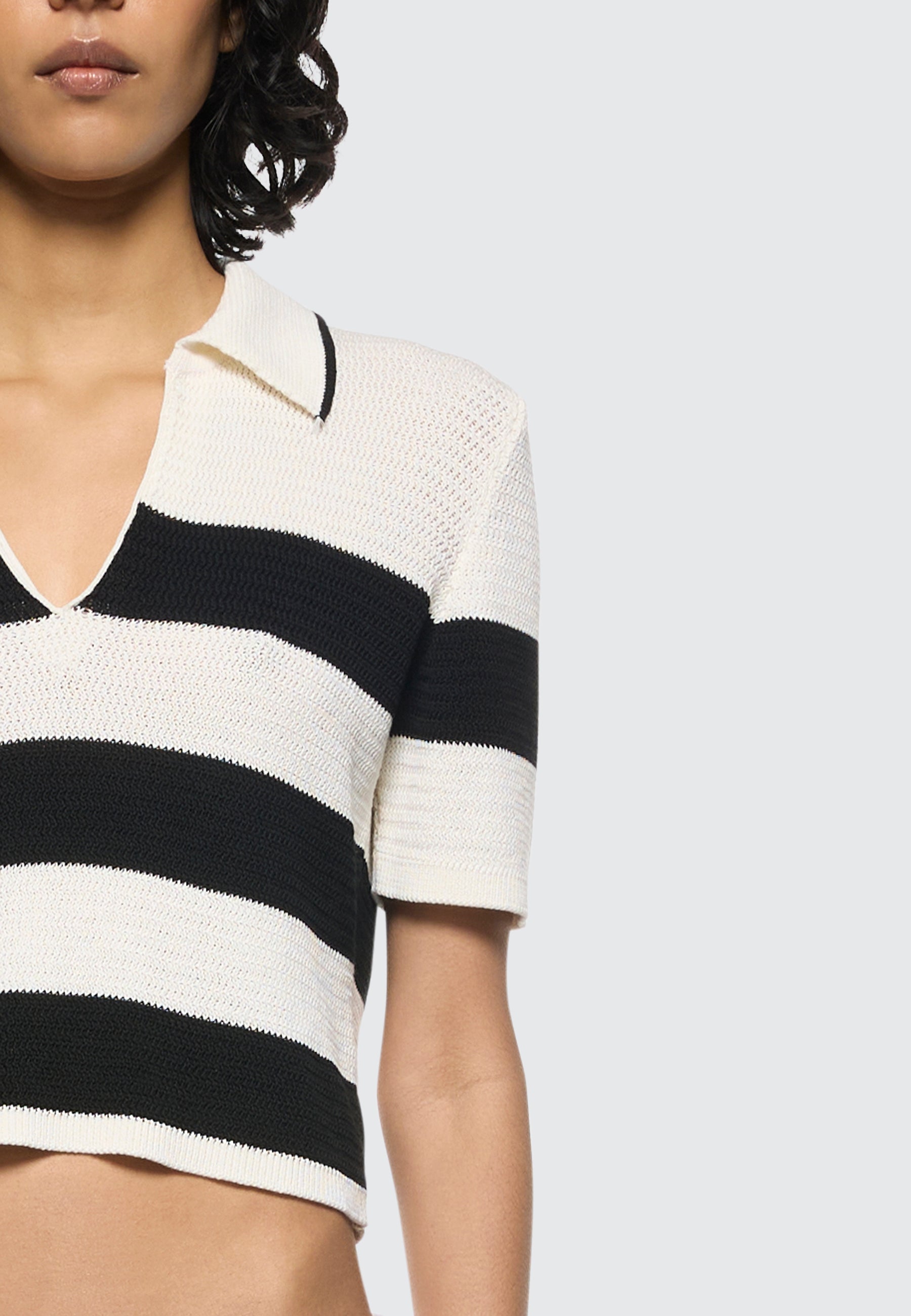The Laneus cropped polo is crafted from premium cotton yarn with a striped pattern and features a boxy silhouette with short sleeves, an Italian collar and a deep V-neck. Made in Italy.