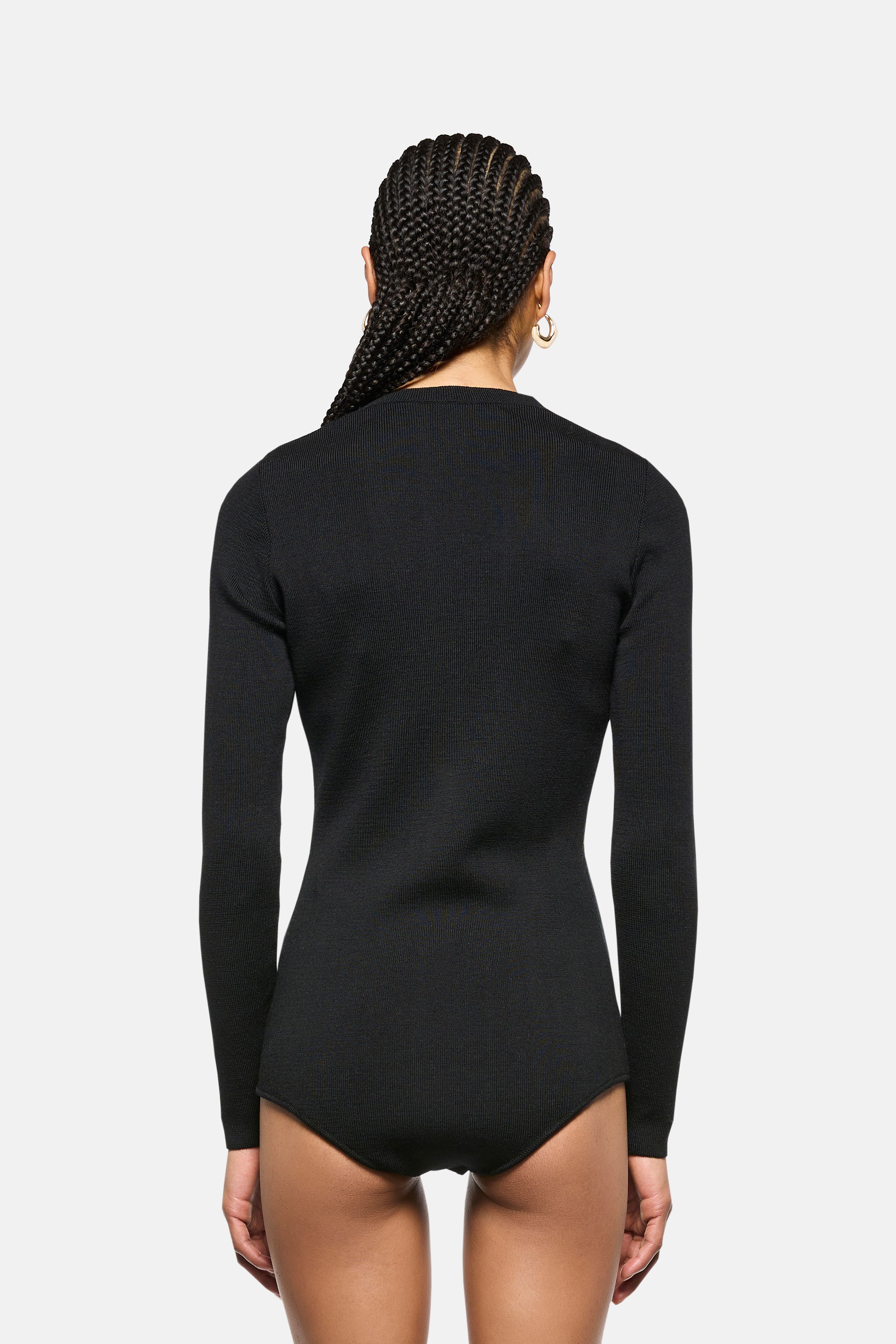 Essential and feminine, this bodysuit by Laneus is crafted from ultra-fine ribbed 100% extrafine merino wool. The slim fit hugs the silhouette, while the front button opening adds a functional and refined touch. A versatile piece, perfect worn on its own or layered under jackets and cardigans. Made in Italy.