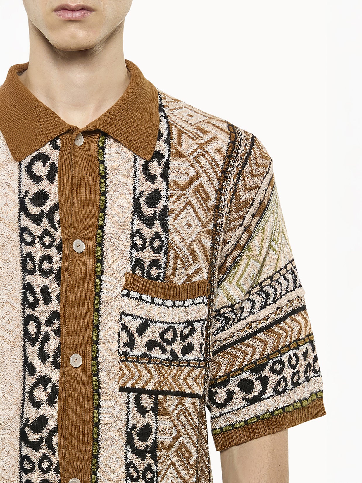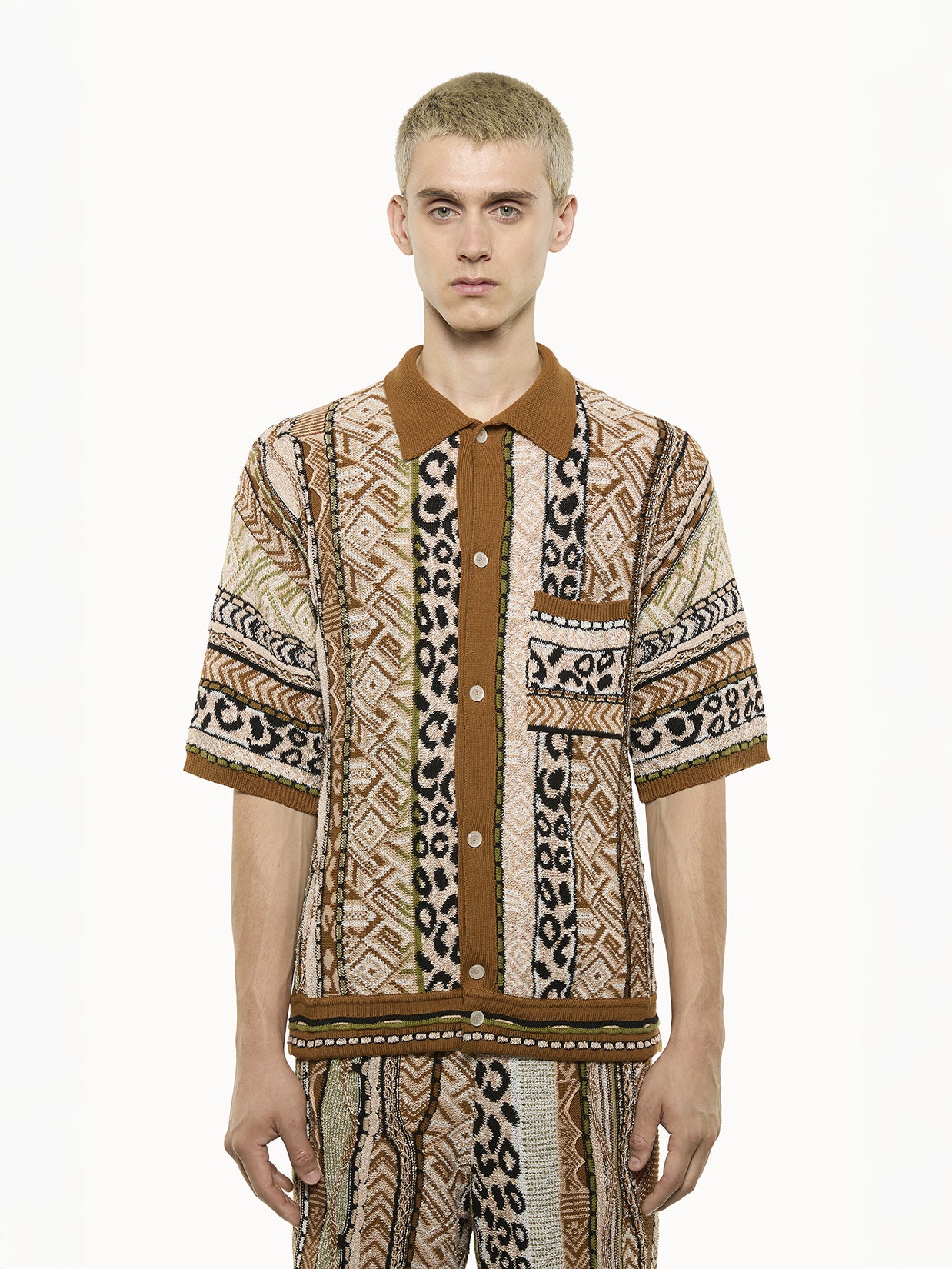 Knit shirt made from iconic multi-thread jacquard cotton. It features a regular fit with short sleeves and a button-up front. A tone-on-tone flat chest pocket. Made in Italy.