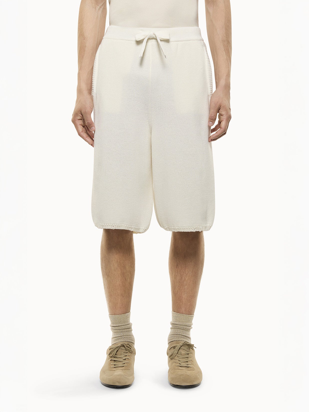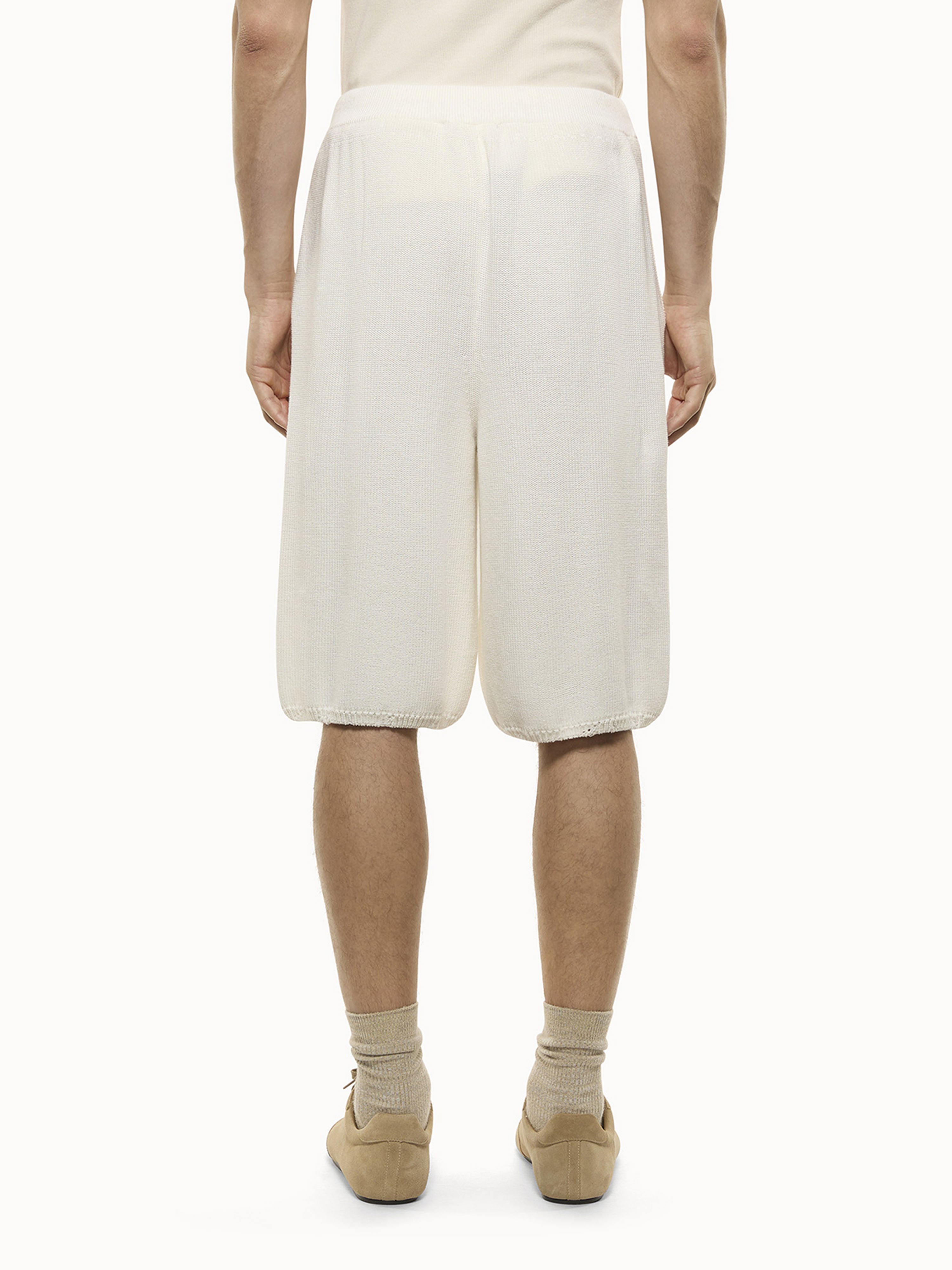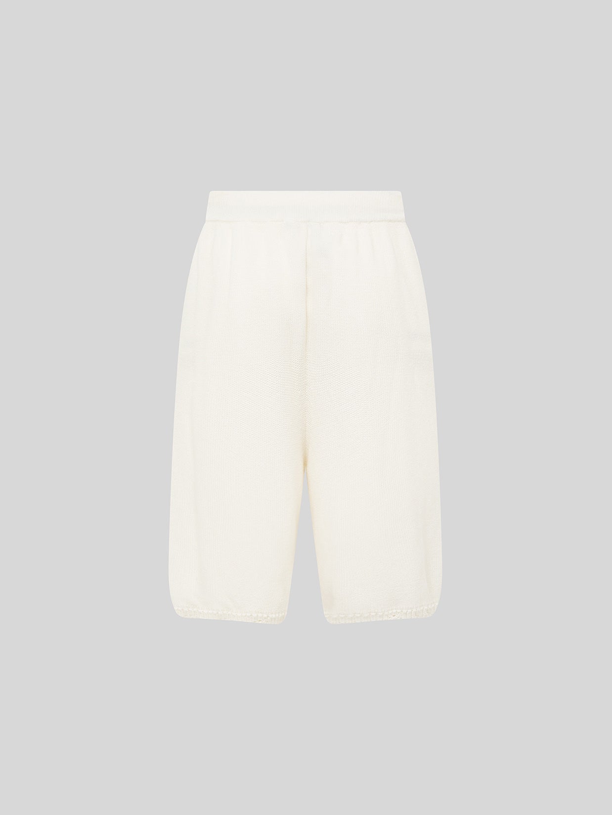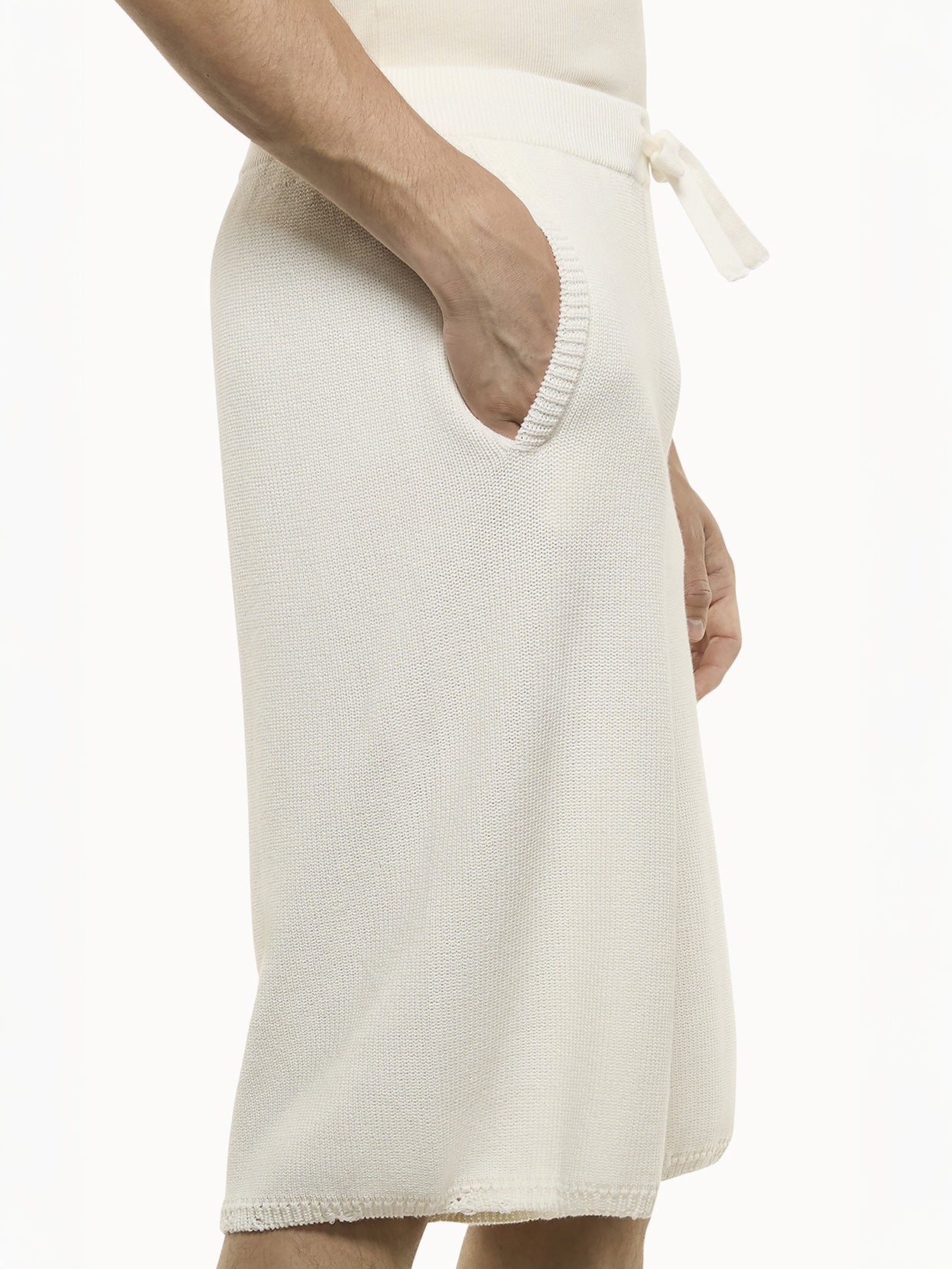 Regular-fit cotton knit shorts made from solid-color cotton. The waist is adjustable with a drawstring. The design features a woven knit. The wide hem and side pockets complete the piece. Made in Italy.