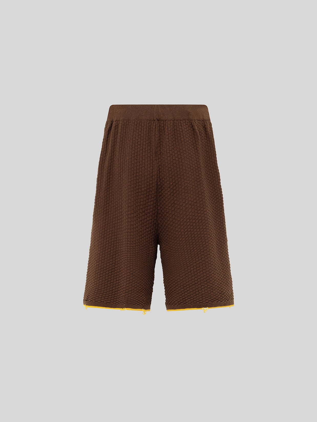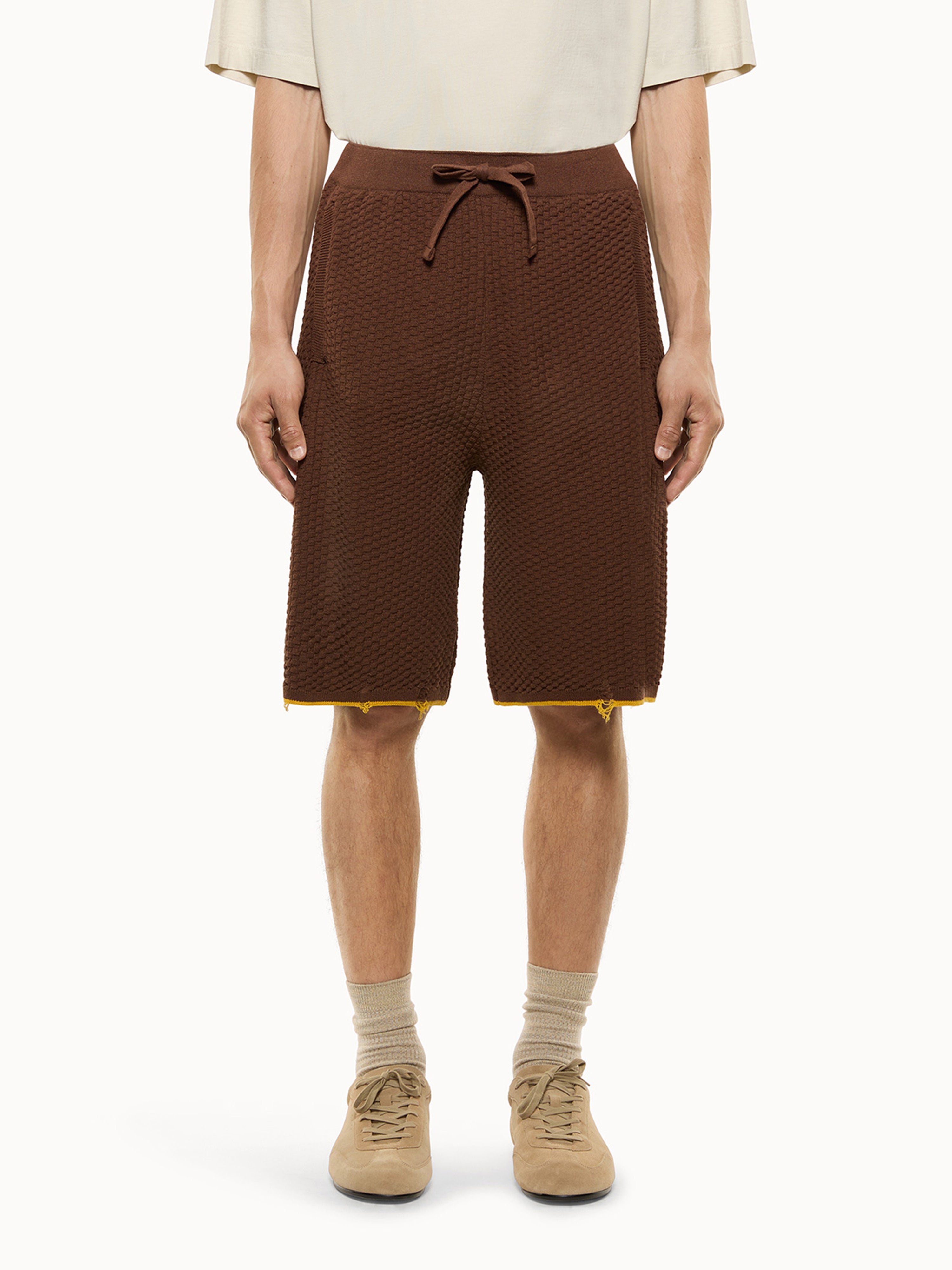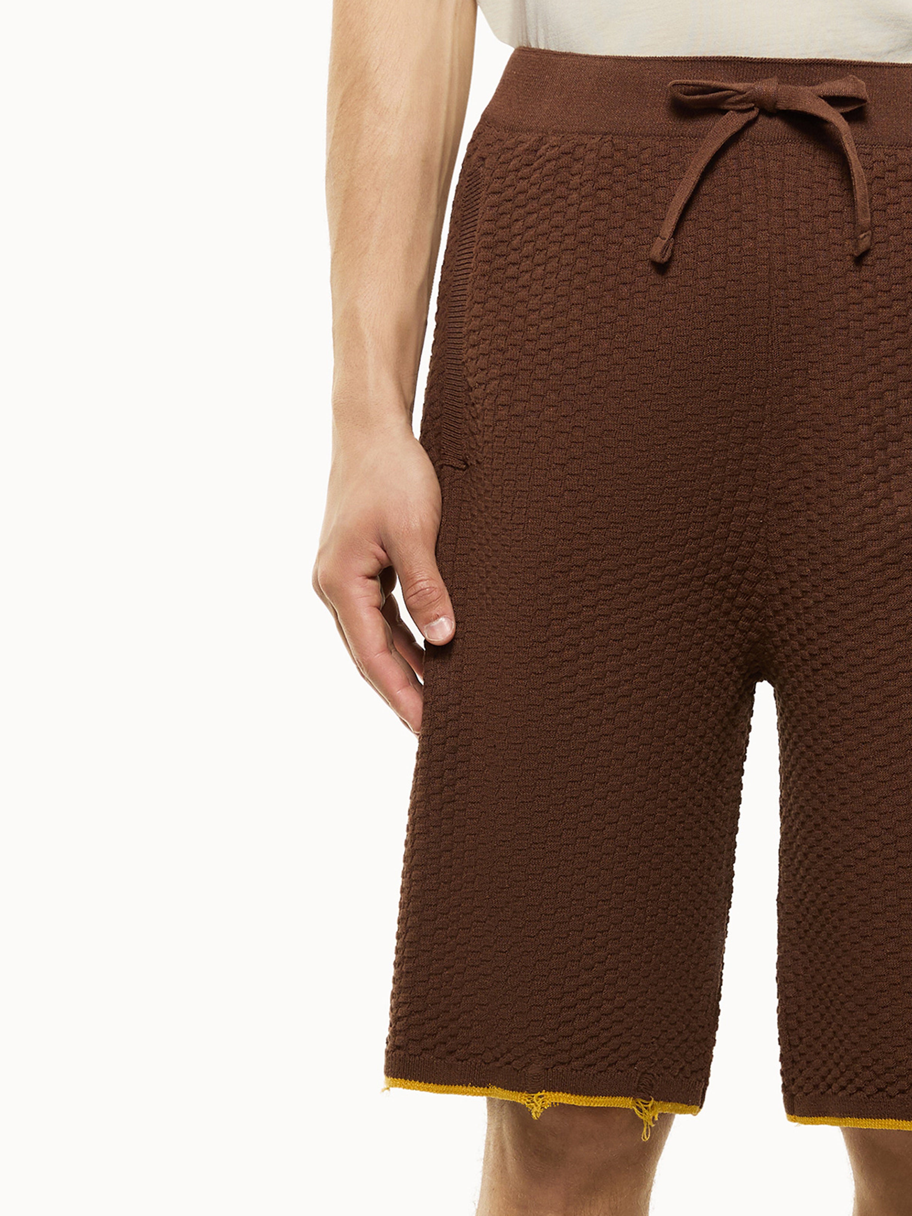 Regular-fit cotton knit shorts, crafted from multicolored cotton. The waist is adjustable with a drawstring. The design features a woven knit and ripped hems, accentuating the deconstructed aesthetic. Wide hems and side pockets complete the piece. Made in Italy.