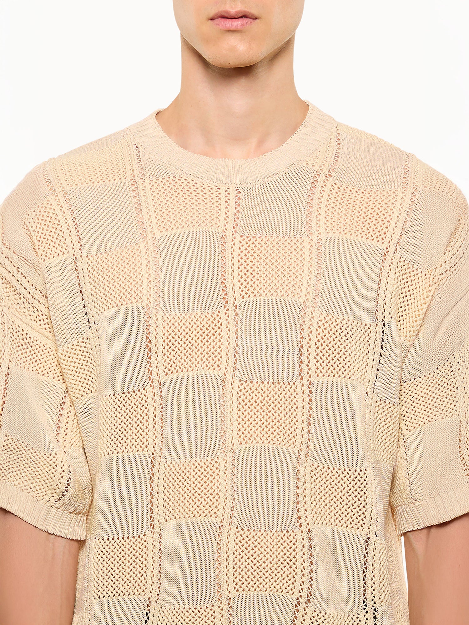 Cotton knit T-shirt by Laneus, crafted from solid-color yarn with a check pattern. The comfortable fit features slightly dropped shoulders and ribbed cuffs, hem, and collar. Made in Italy.
