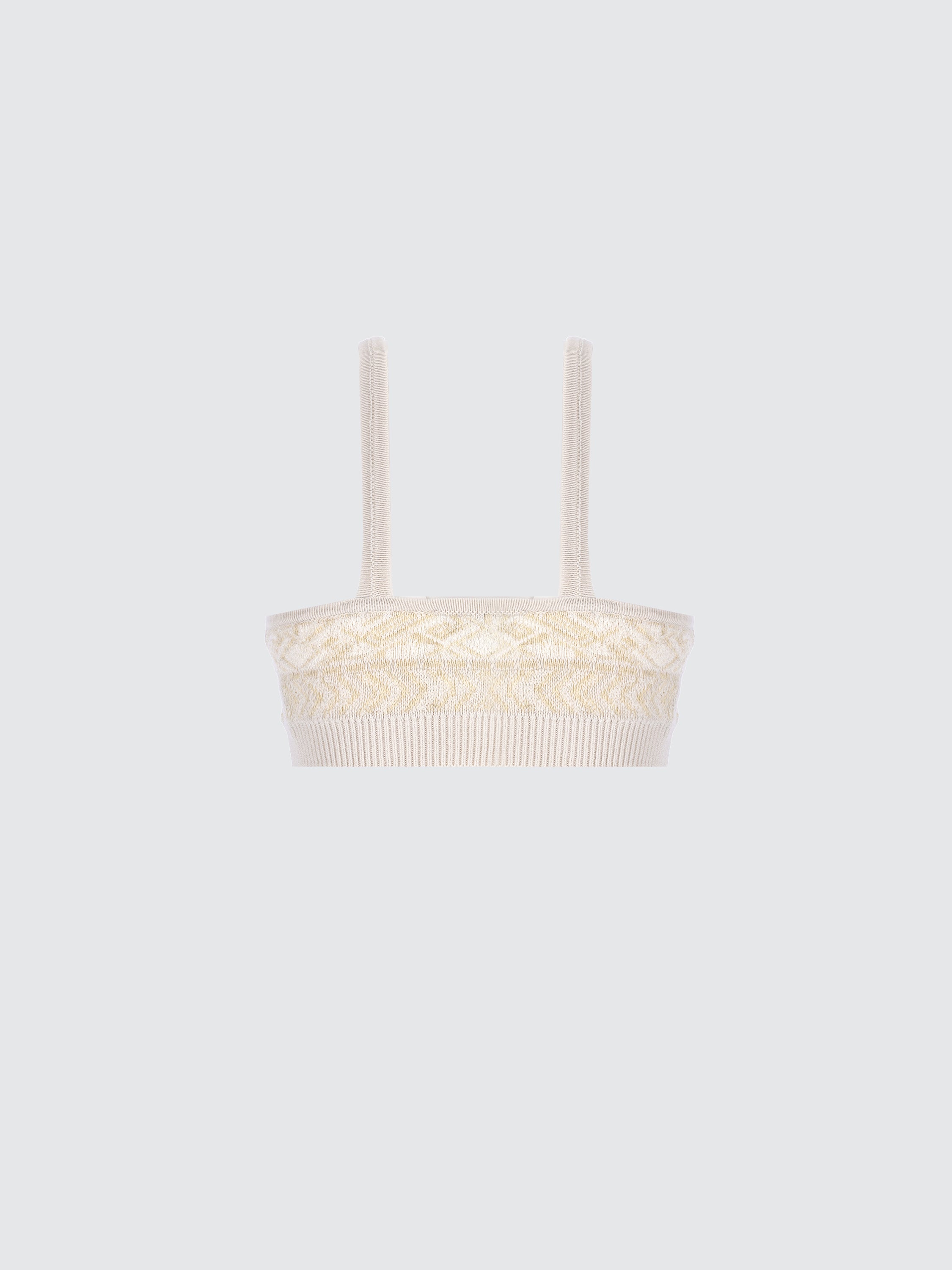 Laneus presenta un'inedita capsule collection di homewear. Questo top reinterpreta l’iconico jacquard del brand attraverso tonalità neutra. Il design con spalline sottili si arricchisce di dettagli piquet e cordonetti a rilievo, creando profondità ed effetti tridimensionali. Il mix di filati in cotone, con contrasti tra finiture lucide e opache e l’aggiunta di un morbido filo bouclé, conferisce un equilibrio armonioso tra fascino rustico ed eleganza sofisticata.