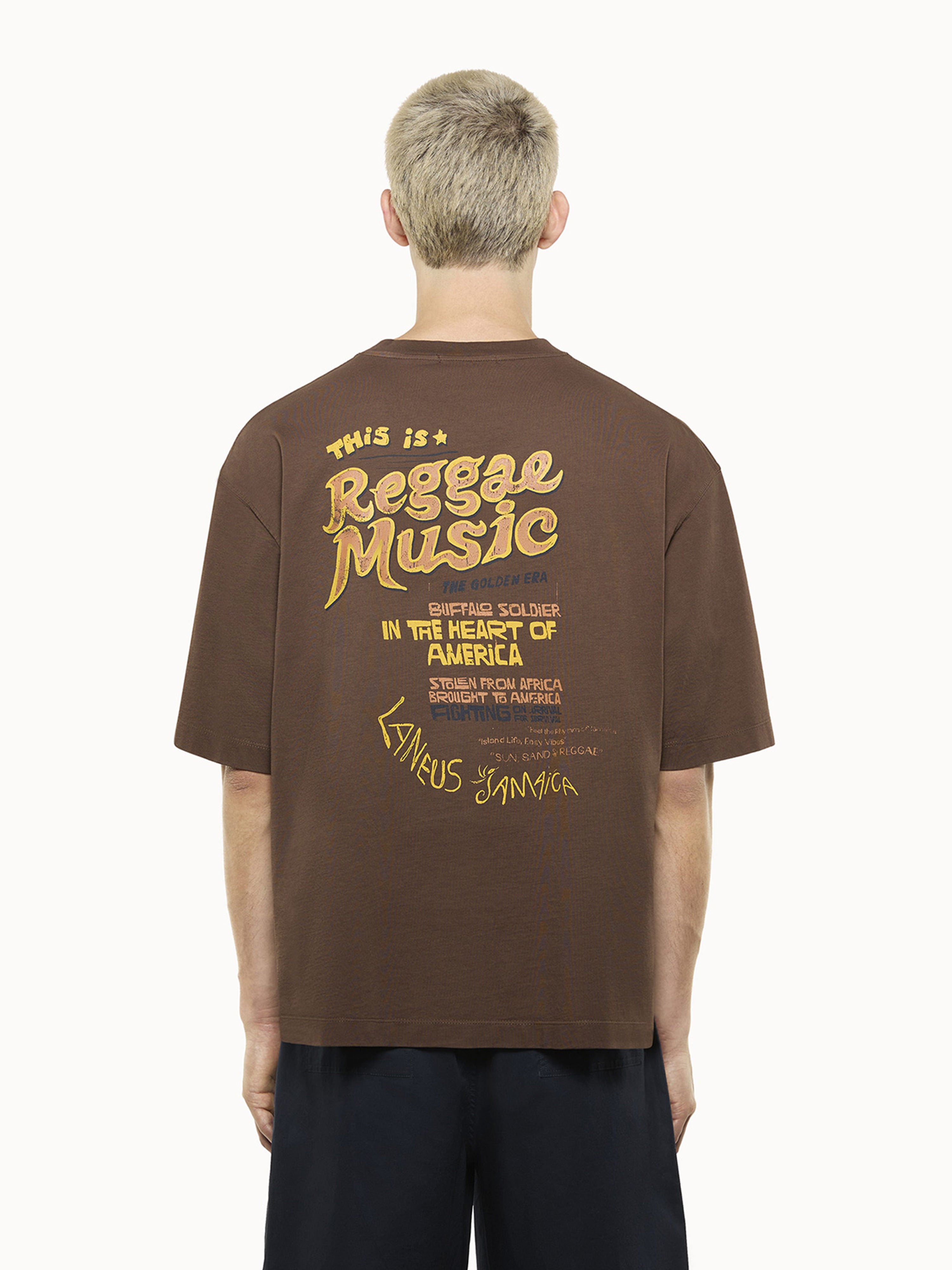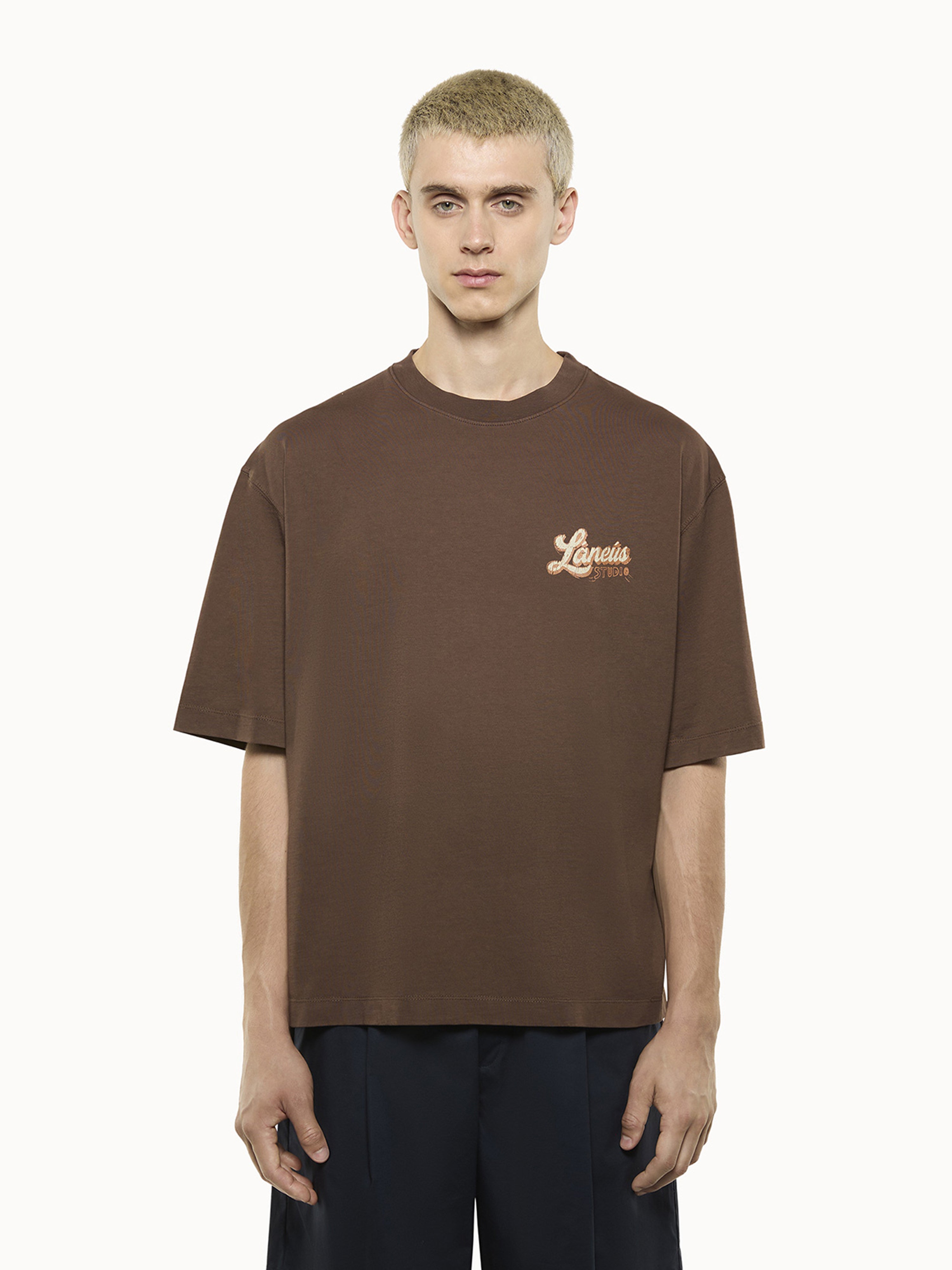 Oversized lines and a large print on the back characterize this 100% cotton T-shirt by Laneus. The style features a relaxed fit. An essential piece with a distinctive, pop style. Made in Italy.