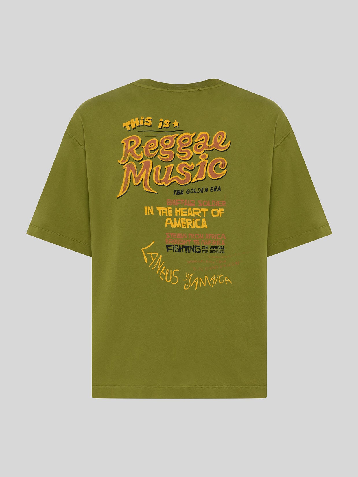 Oversized lines and a large print on the back characterize this 100% cotton T-shirt by Laneus. The style features a relaxed fit. An essential piece with a distinctive, pop style. Made in Italy.