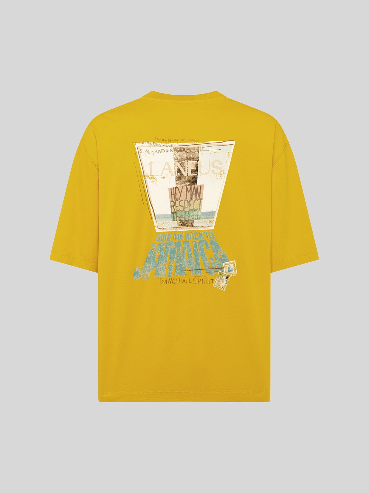 This 100% cotton T-shirt by Laneus features oversized lines and a large print on the back. The style has a relaxed fit. An essential piece with a distinctive, pop style. Made in Italy.