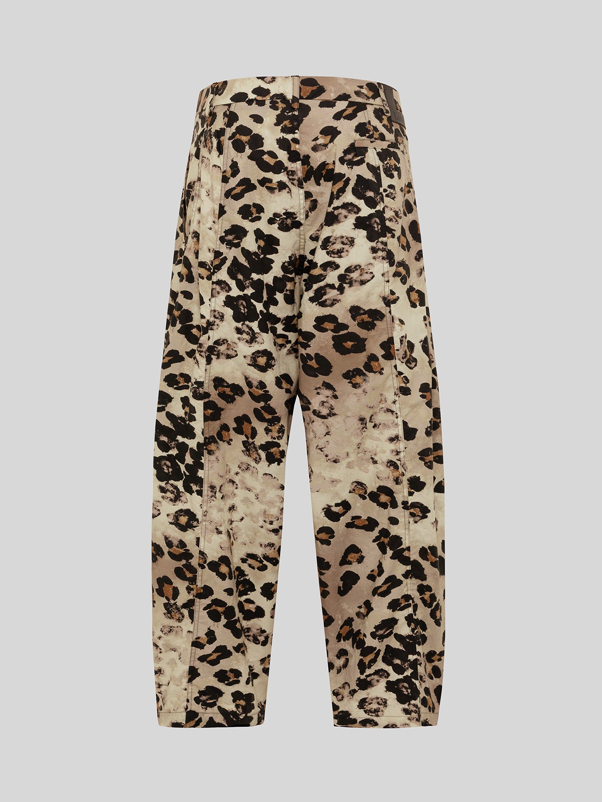 Lightweight fabric trousers with an animal print. Loose, wide leg. Regular waist with pleats and belt loops. Button and zip closure. Front slant pockets and back welt pocket. Made in Italy.