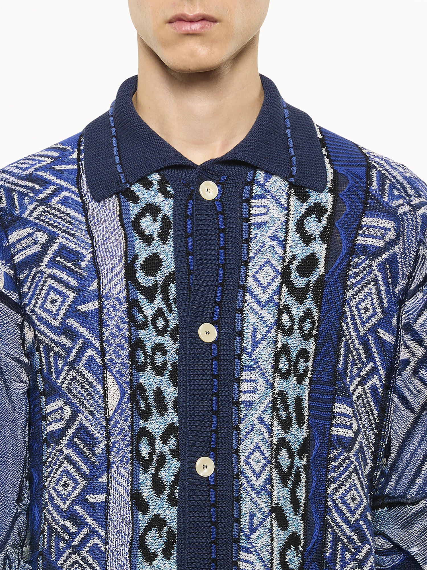 Oversized cotton knit cardigan with the iconic LANEUS motif. Oversized fit and woven construction. The piece features a front button closure, two flat pockets on the front, and ribbed trims. Made in Italy.