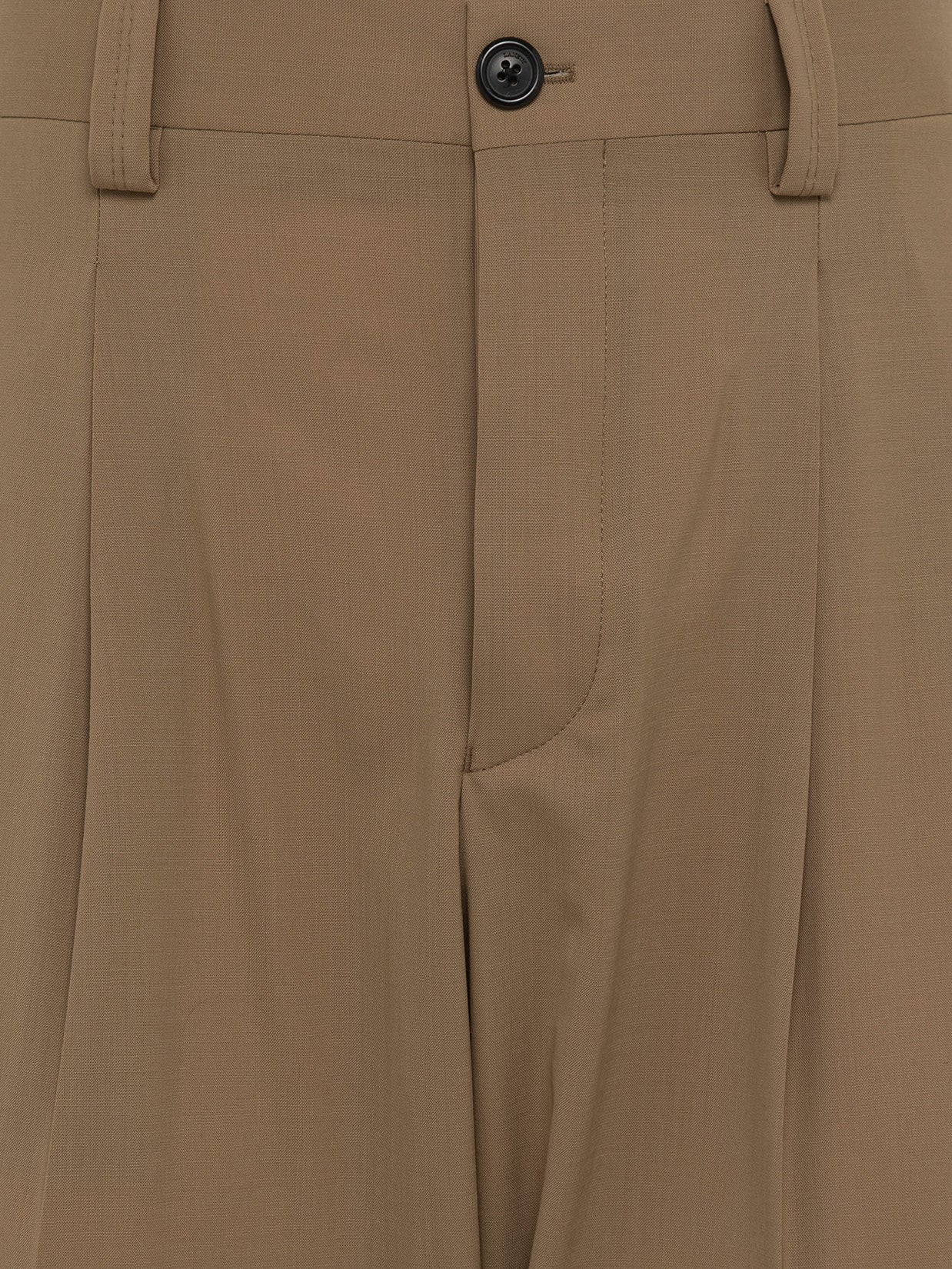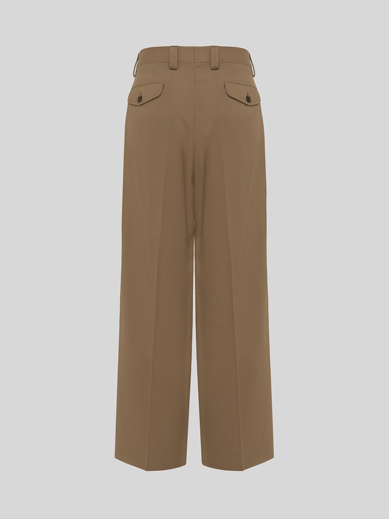 Laneus trousers crafted from crisp, solid-color wool, featuring a simple yet detailed design. They feature a button closure, darts on the front that lend structure to the line, slanted side pockets, and two flap pockets on the back. The lightweight fabric and elegant, versatile aesthetic make them suitable for both formal and informal settings. Made in Italy.