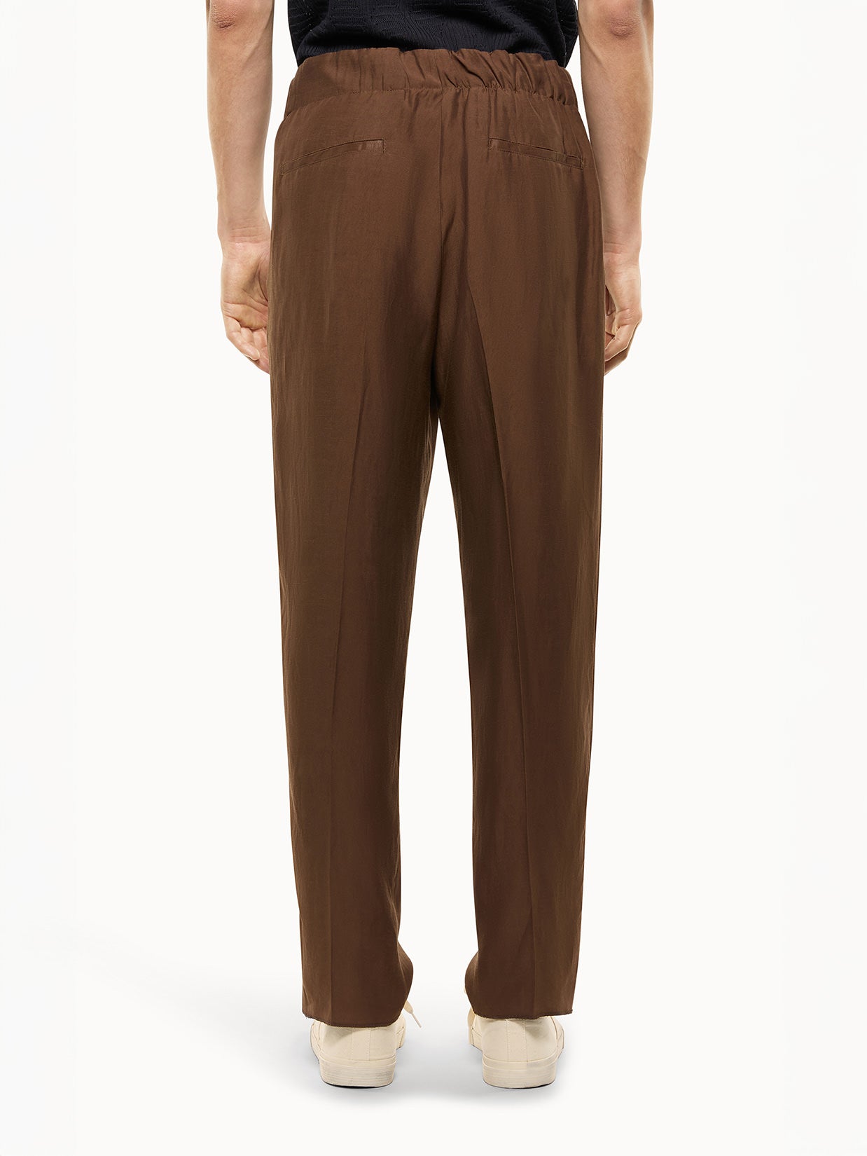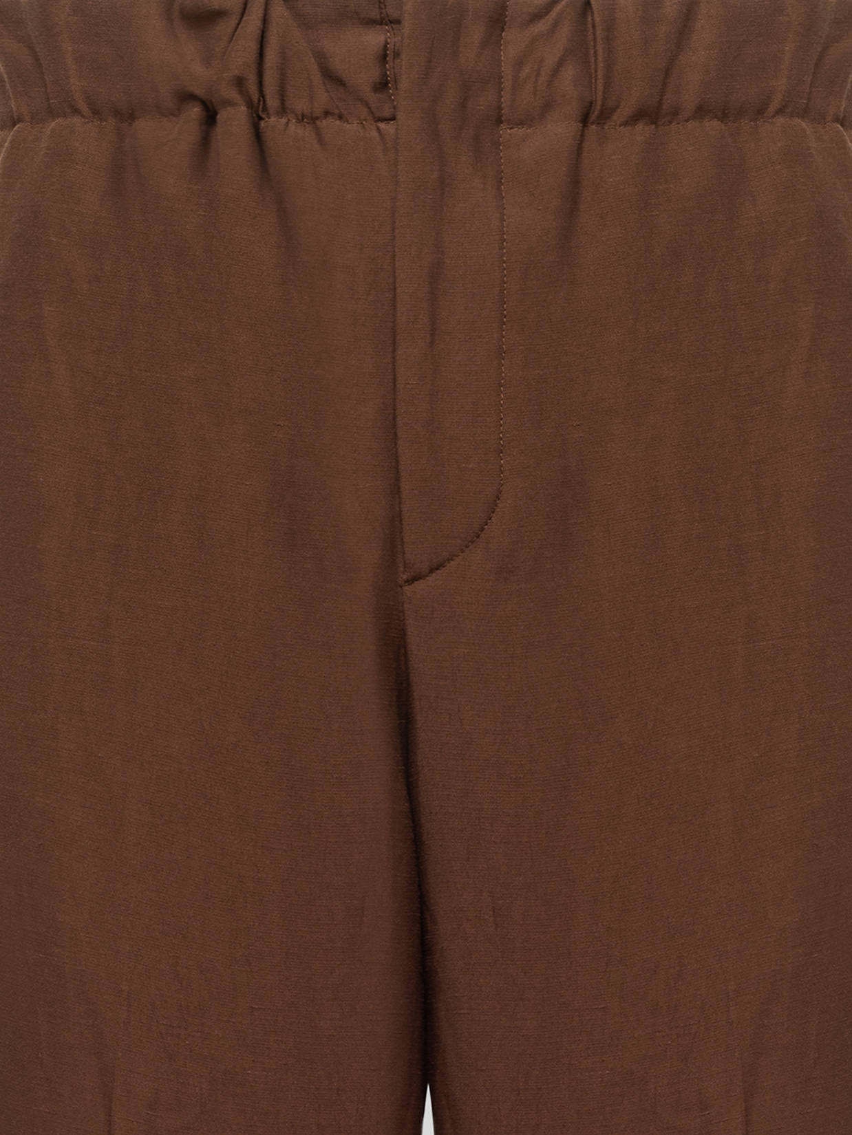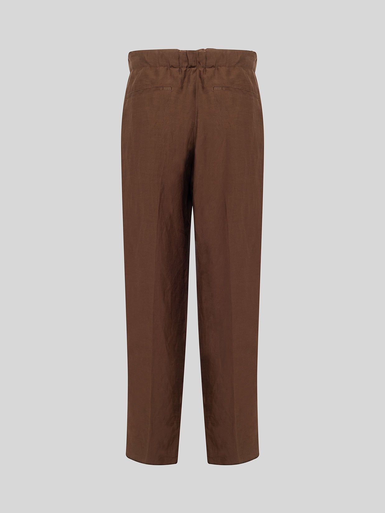 Laneus trousers in lightweight linen blend fabric, featuring a simple yet refined design. They feature a comfortable elastic waistband with a faux fly, darts at the front for structure, slanted side pockets, and two welt pockets at the back. They close with an internal hook and zip at the waist. The lightweight, breathable fabric makes them ideal for warmer weather, with an elegant and versatile look suitable for both formal and informal settings. Made in Italy.