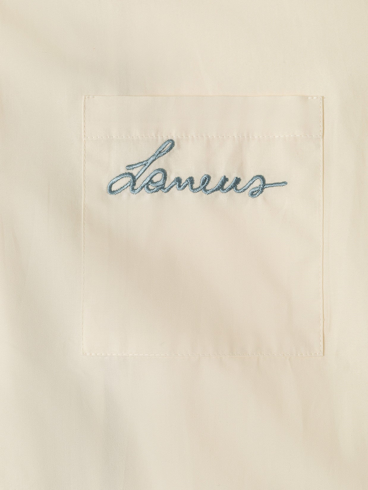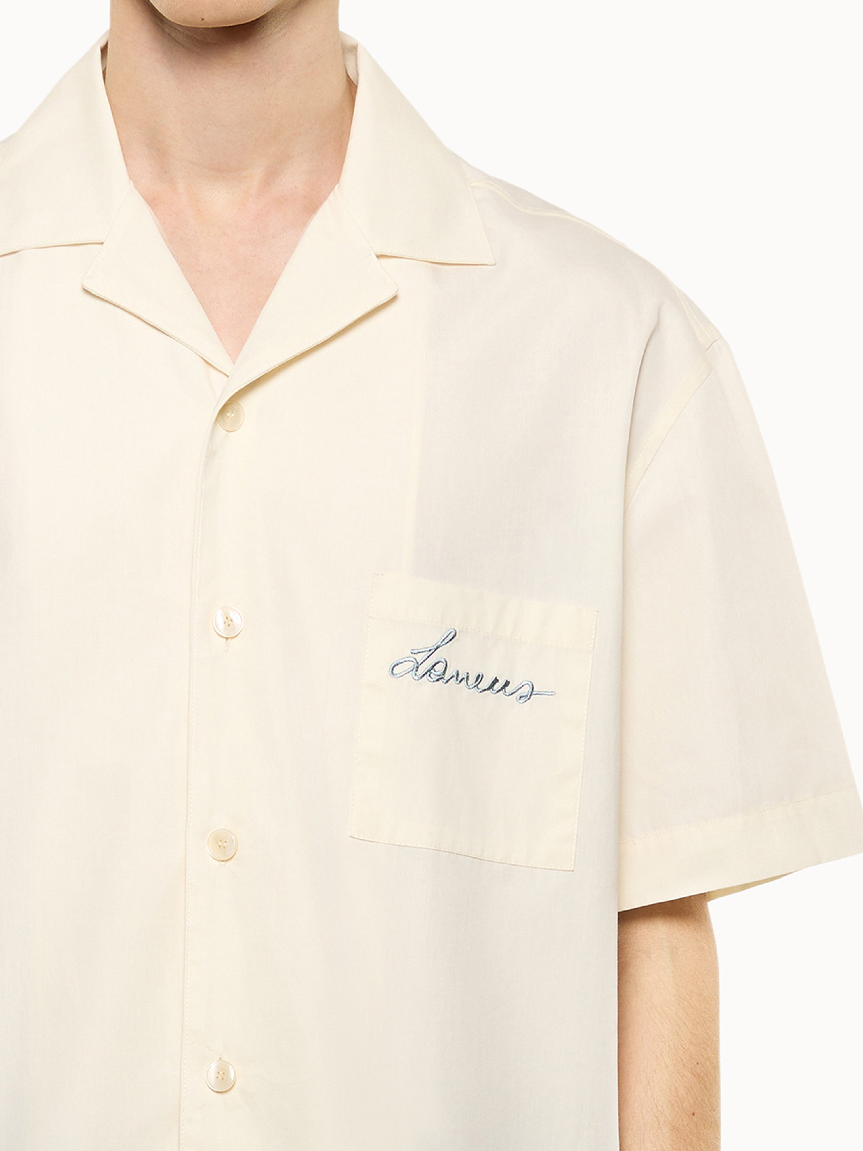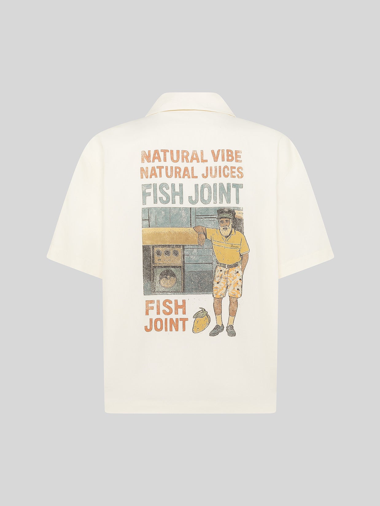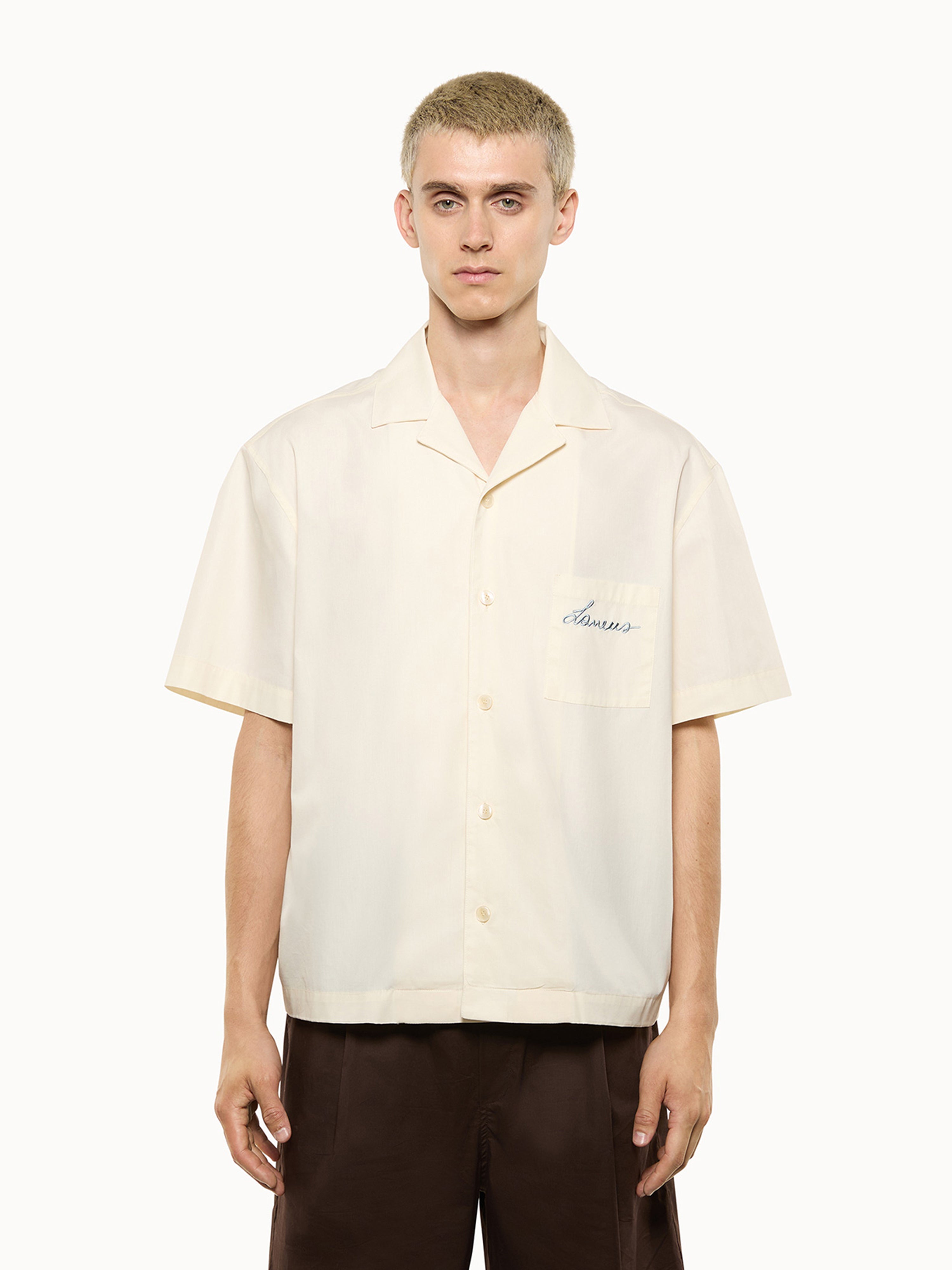 Camicia con maniche corte caratterizzata da un'estetica leggere ed estiva. Piccolo ricamo logato sulla tasca piatta frontale. Maxi stampa sul retro. Made in Italy.