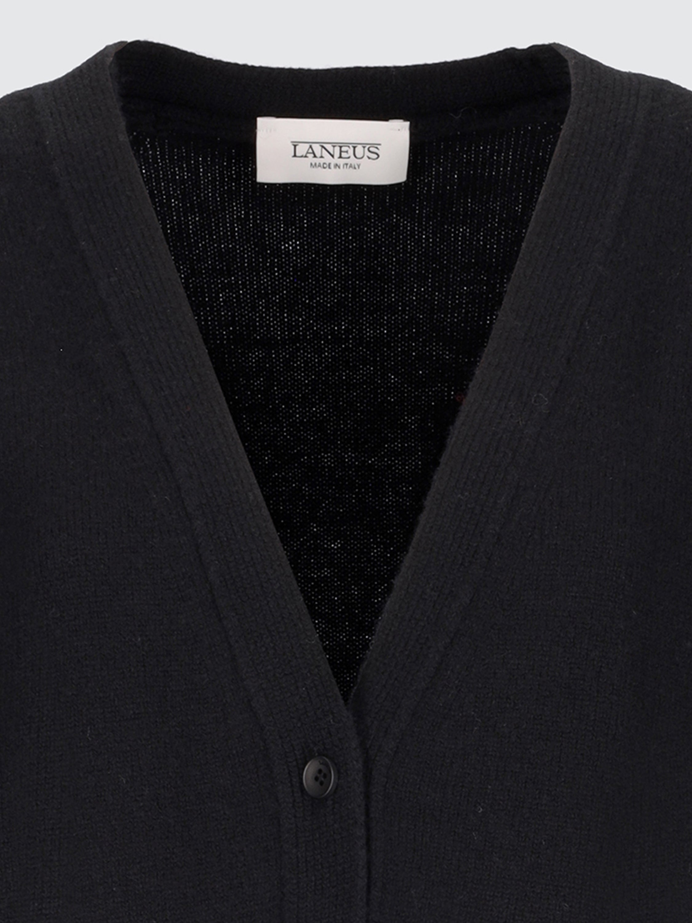 Un essenziale rivisitato con twist contemporaneo. Questo cardigan firmato Laneus in lana merinos extrafine e cashmere presenta un fondo a taglio vivo che crea un elegante effetto arrotolato. La silhouette regular è completata da chiusura frontale con bottoni e due tasche a toppa. Morbido, minimale, con un dettaglio inaspettato che fa la differenza. Made in Italy.