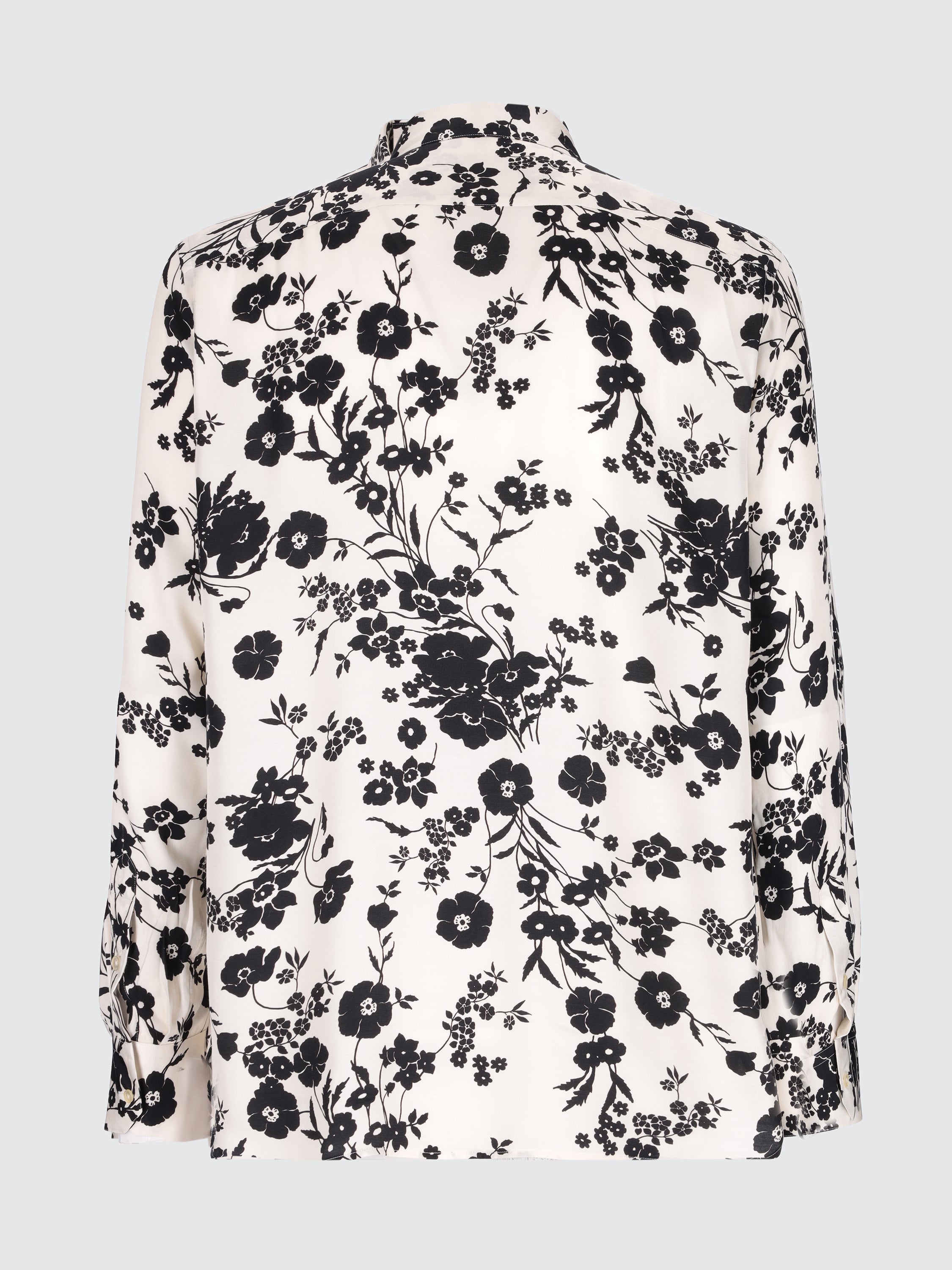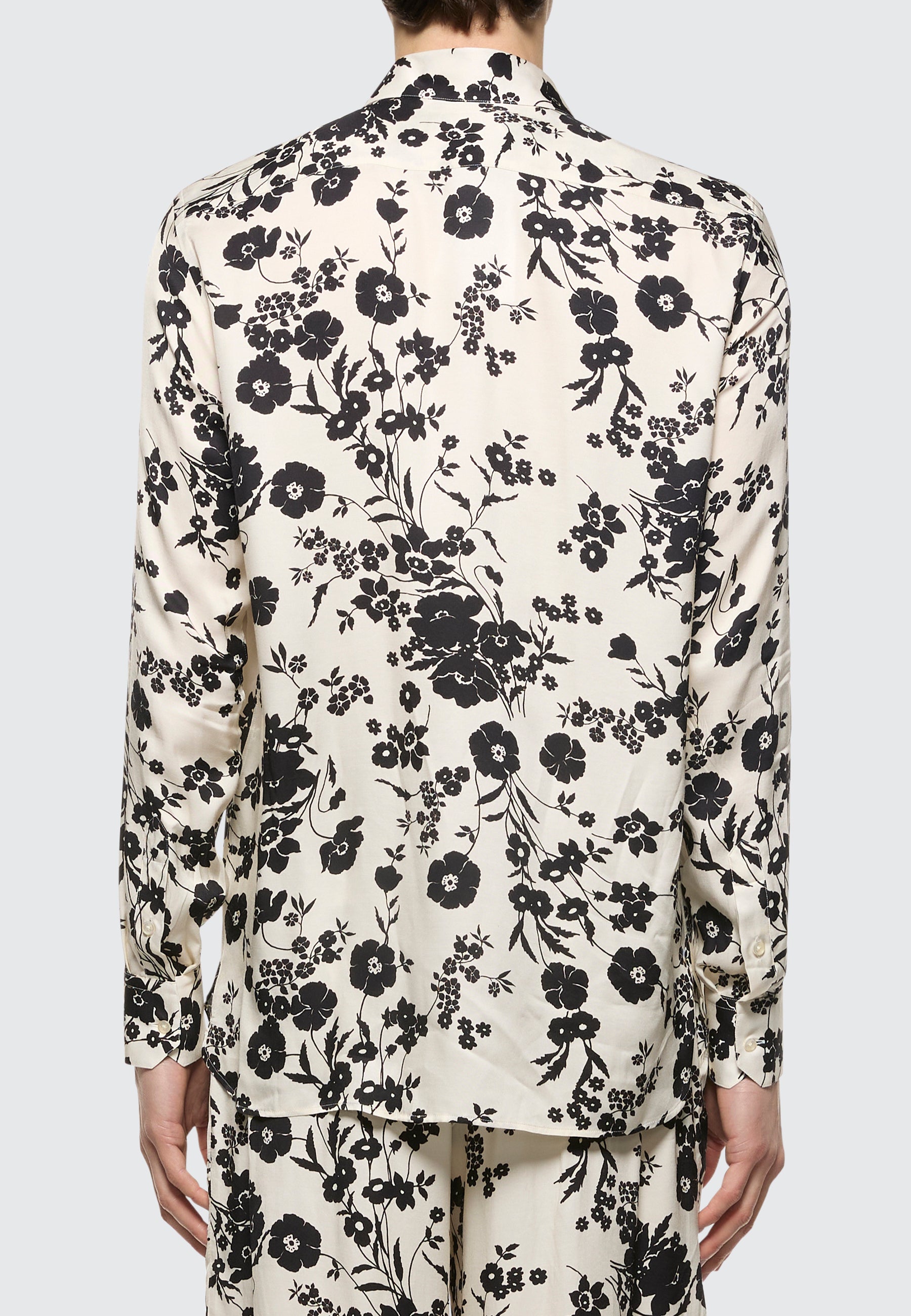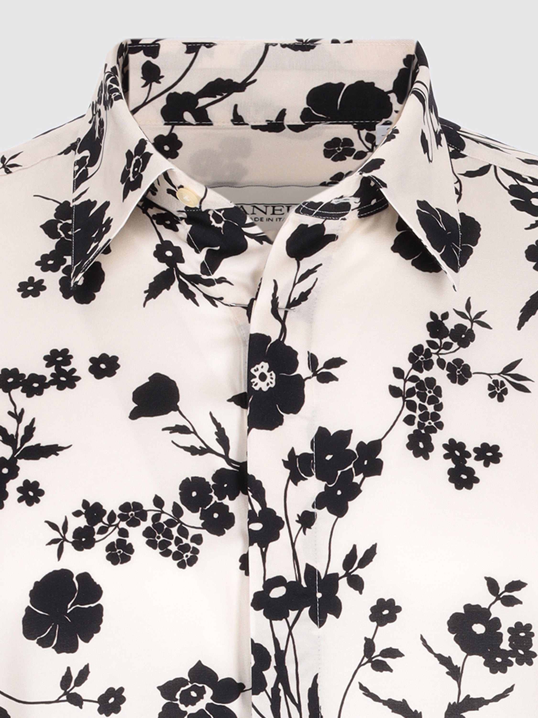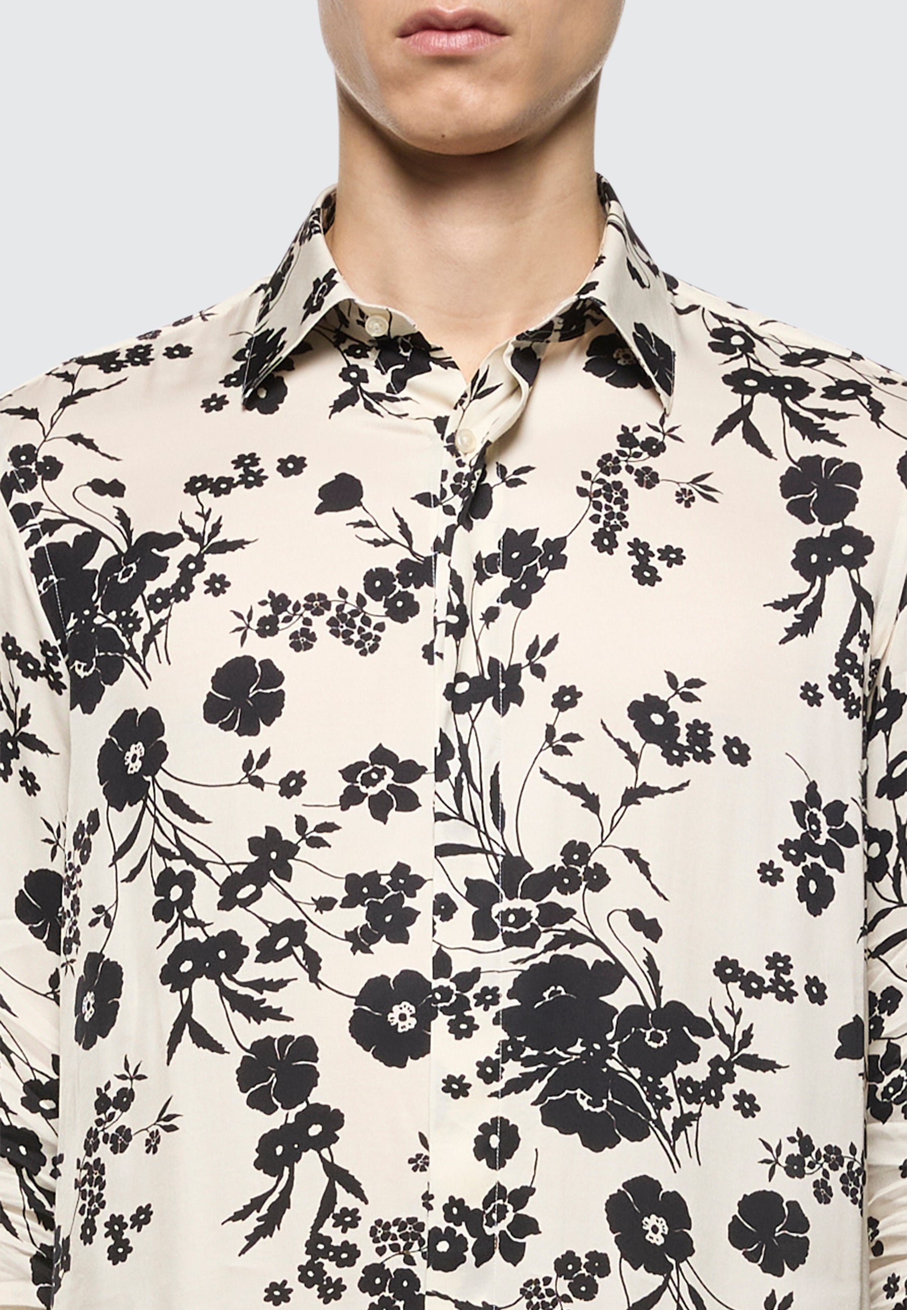 La camicia di Laneus presenta una silhouette comoda con taschino a toppa sul davanti, collo all'italiana, abbottonatura nascosta e un motivo tropicale all over. Il modello è alto 190 cm ed indossa una CM40/M