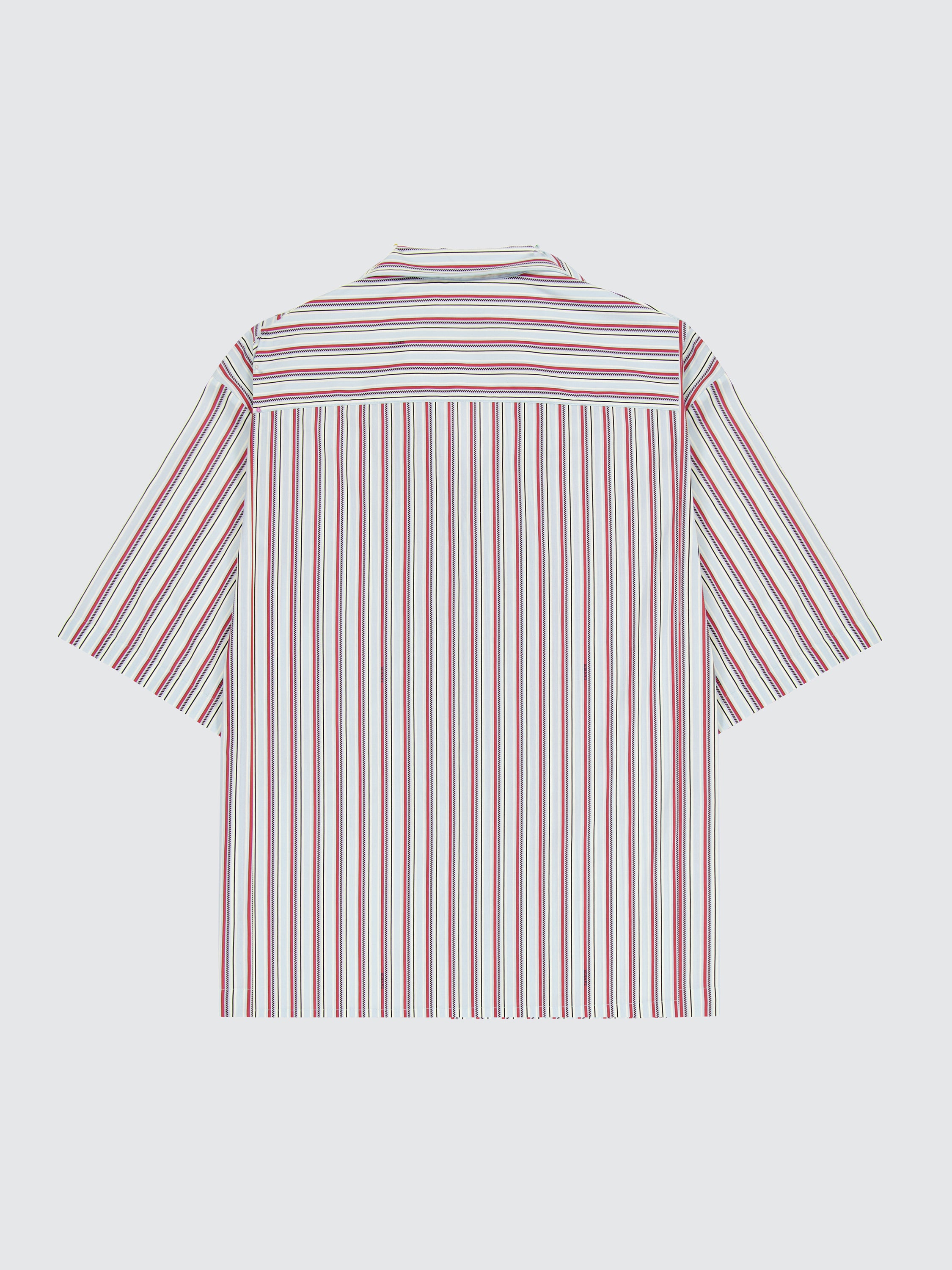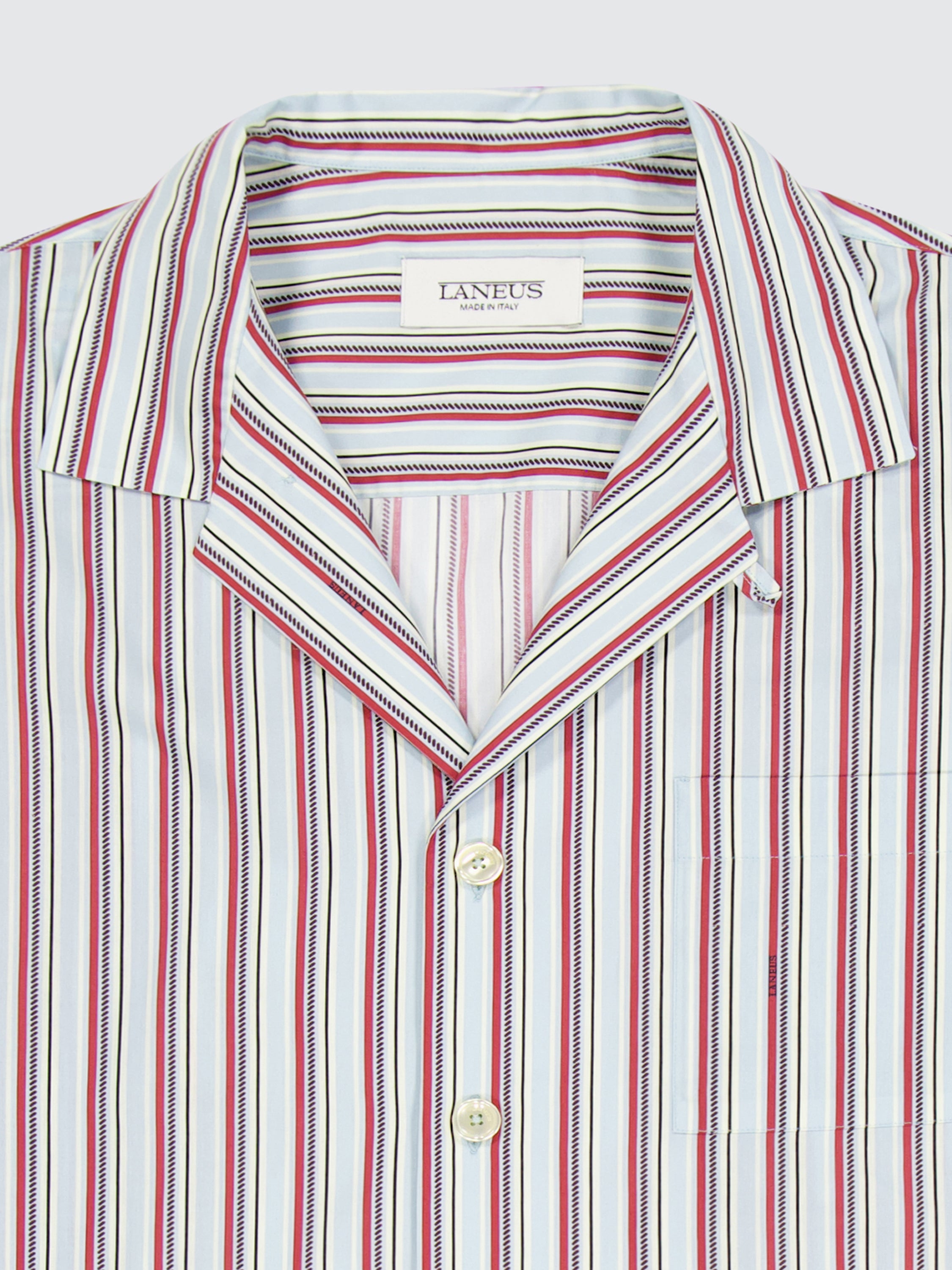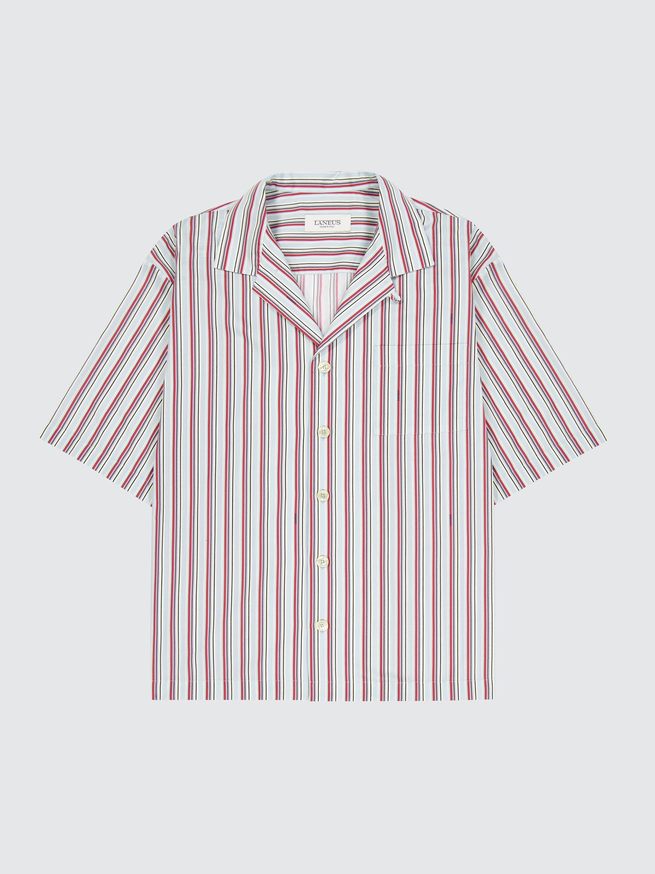 La camicia bowling di Laneus è realizzata in cotone con una stampa a righe multicolore e presenta una silhouette boxy con taschino a toppa sul davanti. Il modello è alto 190 cm ed indossa una 48/M.