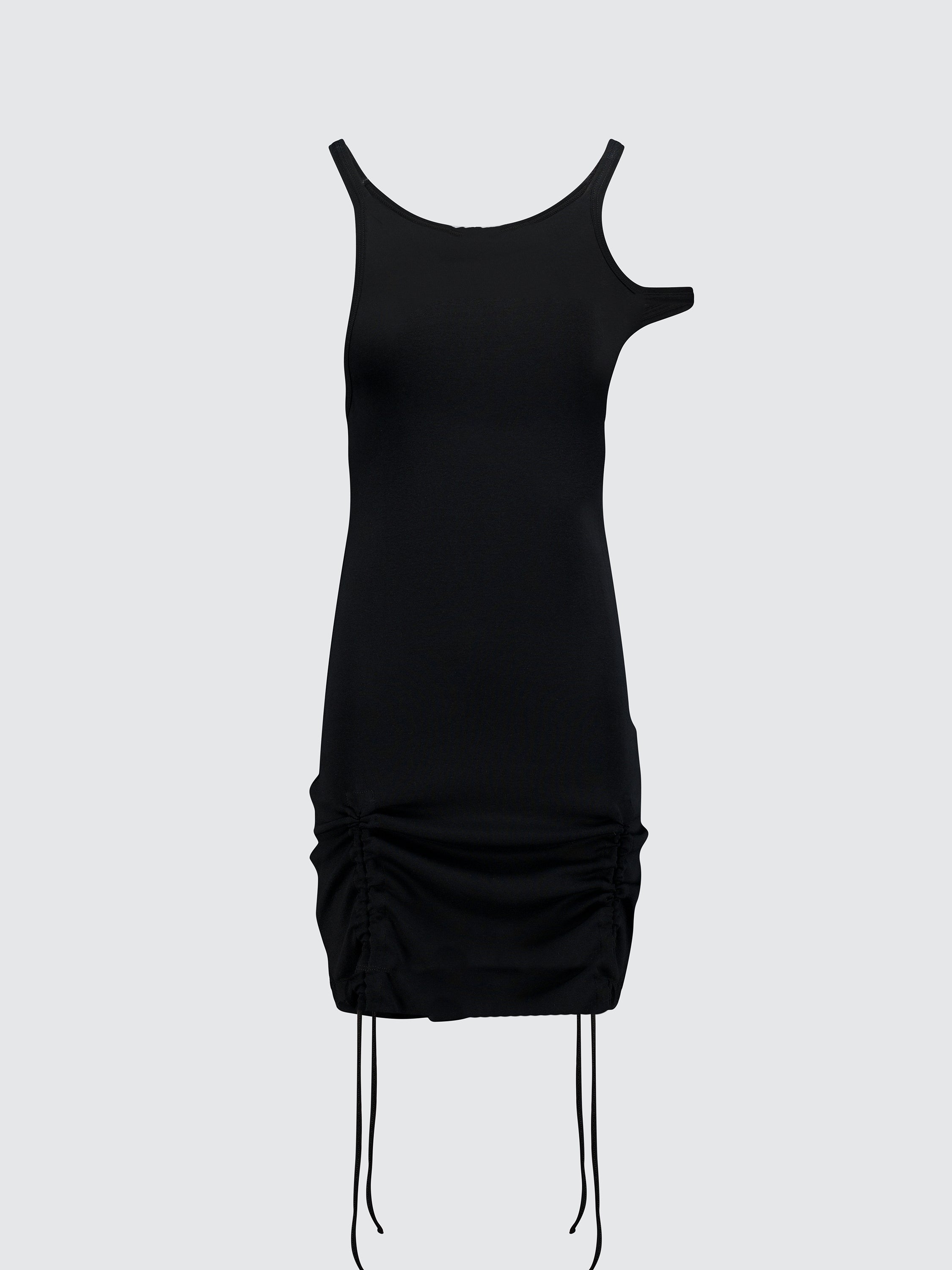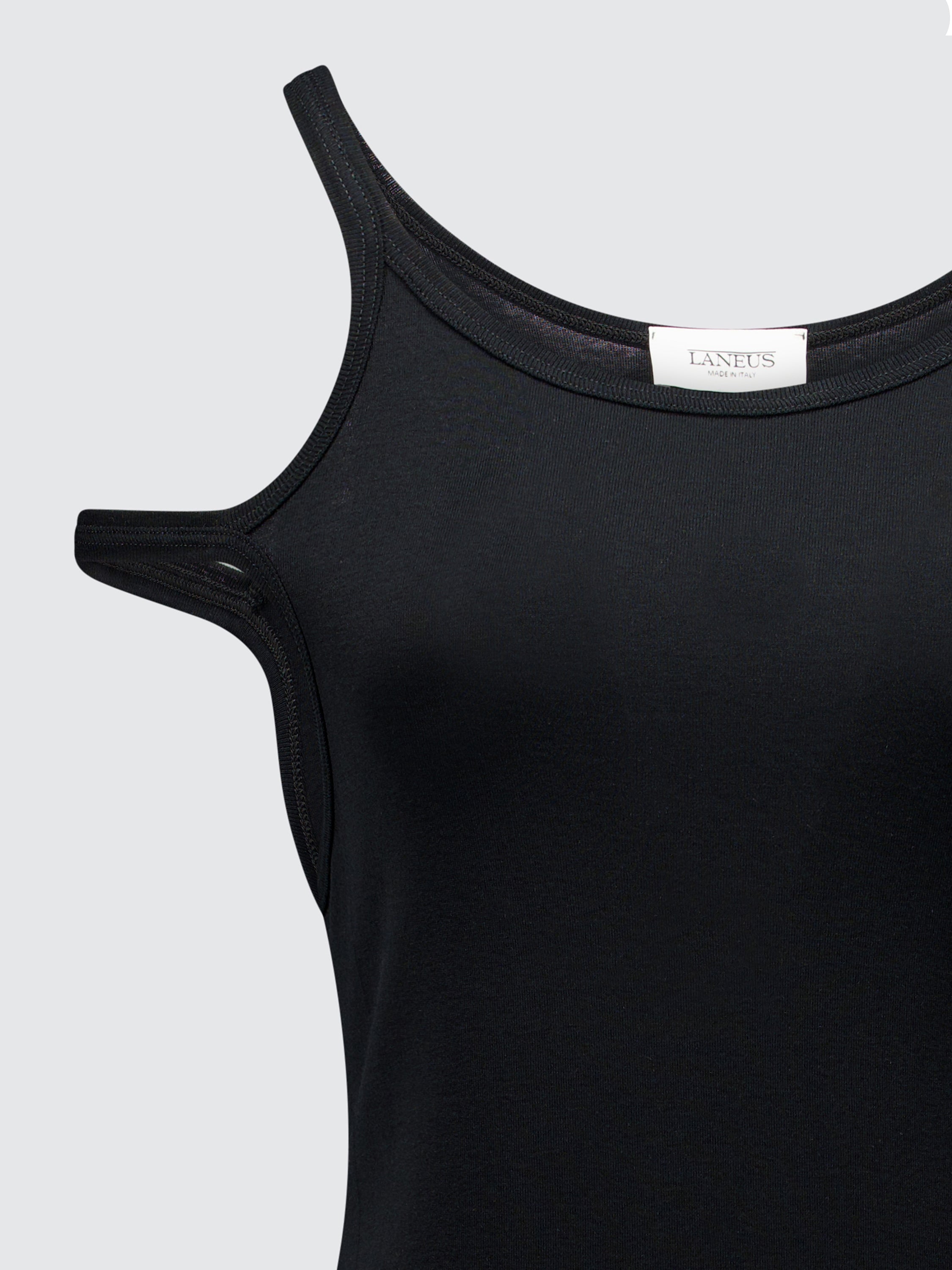 Laneus porta una visione originale della moda italiana nel design di ogni nuova collezione. Questo abito modello canotta slim è realizzato in jersey di cotone e seta a coste con scollo asimmetrico a tre spalline e coulisse regolabile sul fondo.