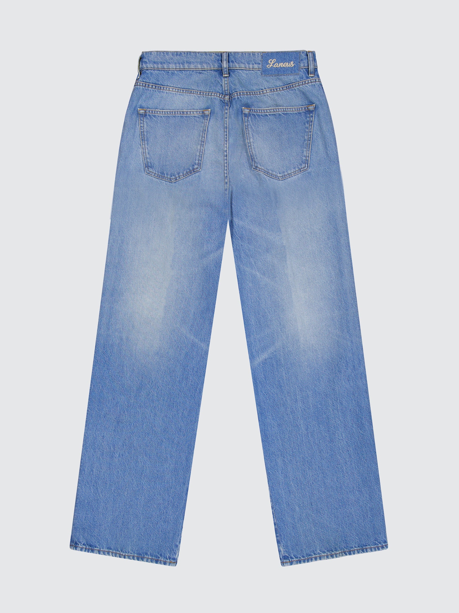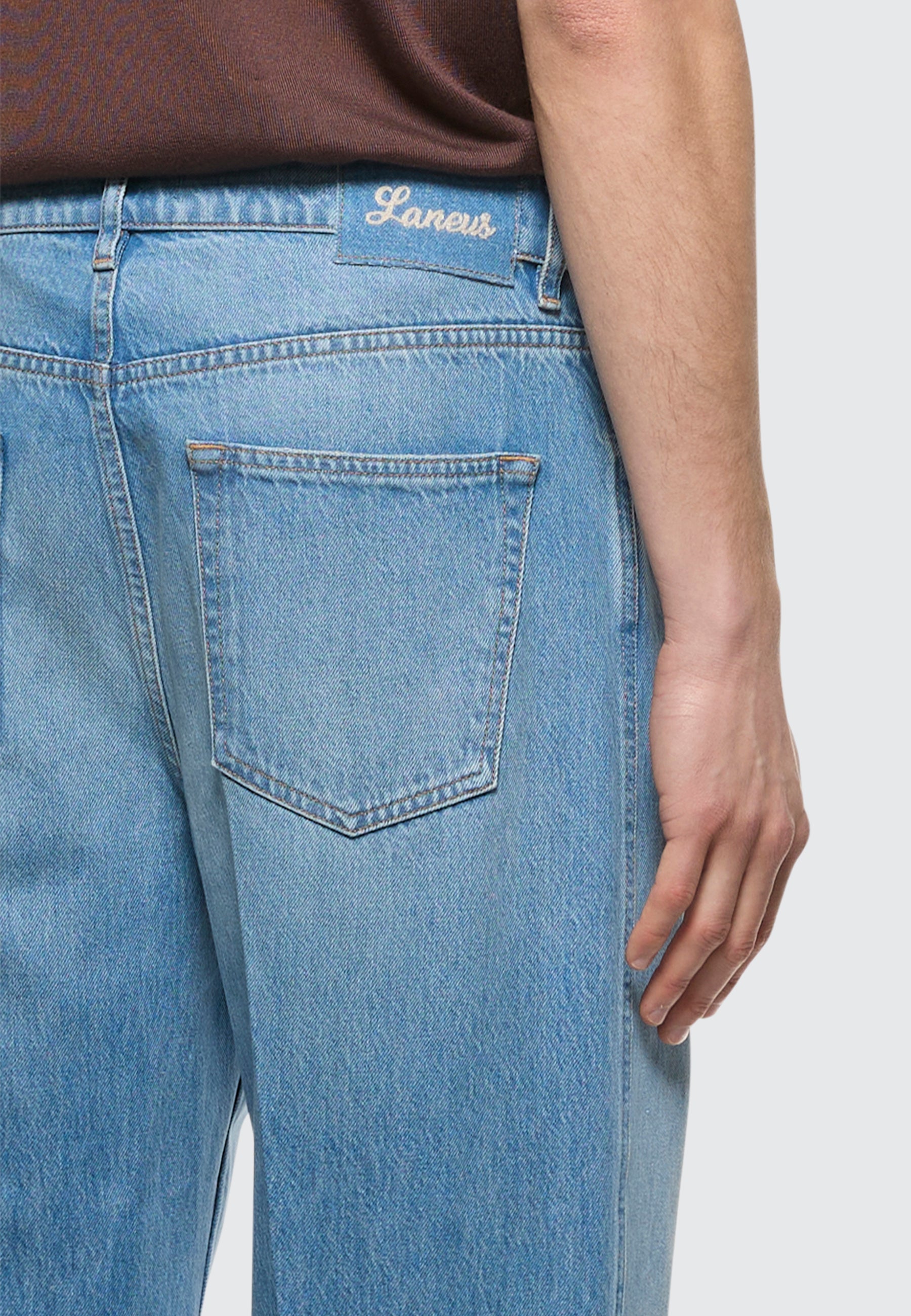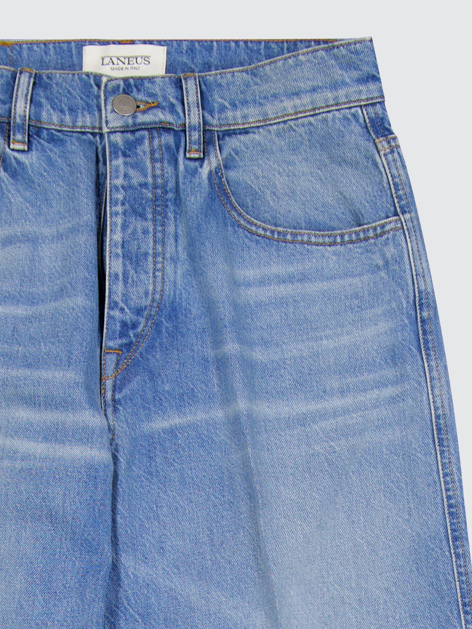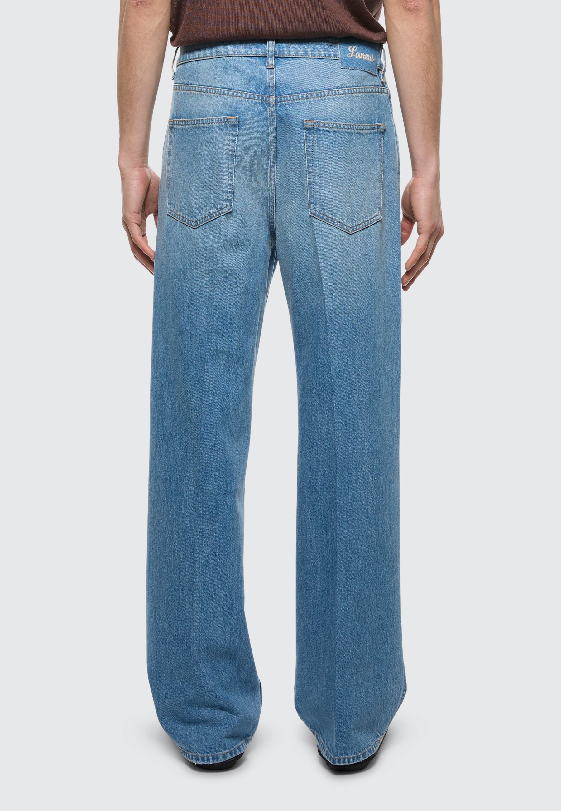 Realizzati in tela denim di puro cotone, questi jeans di Laneus presentano una silhouette baggy-fit cascante con gamba larga e una finitura light blue leggermente sbiadita. Il modello è alto 190 cm ed indossa una 32.
