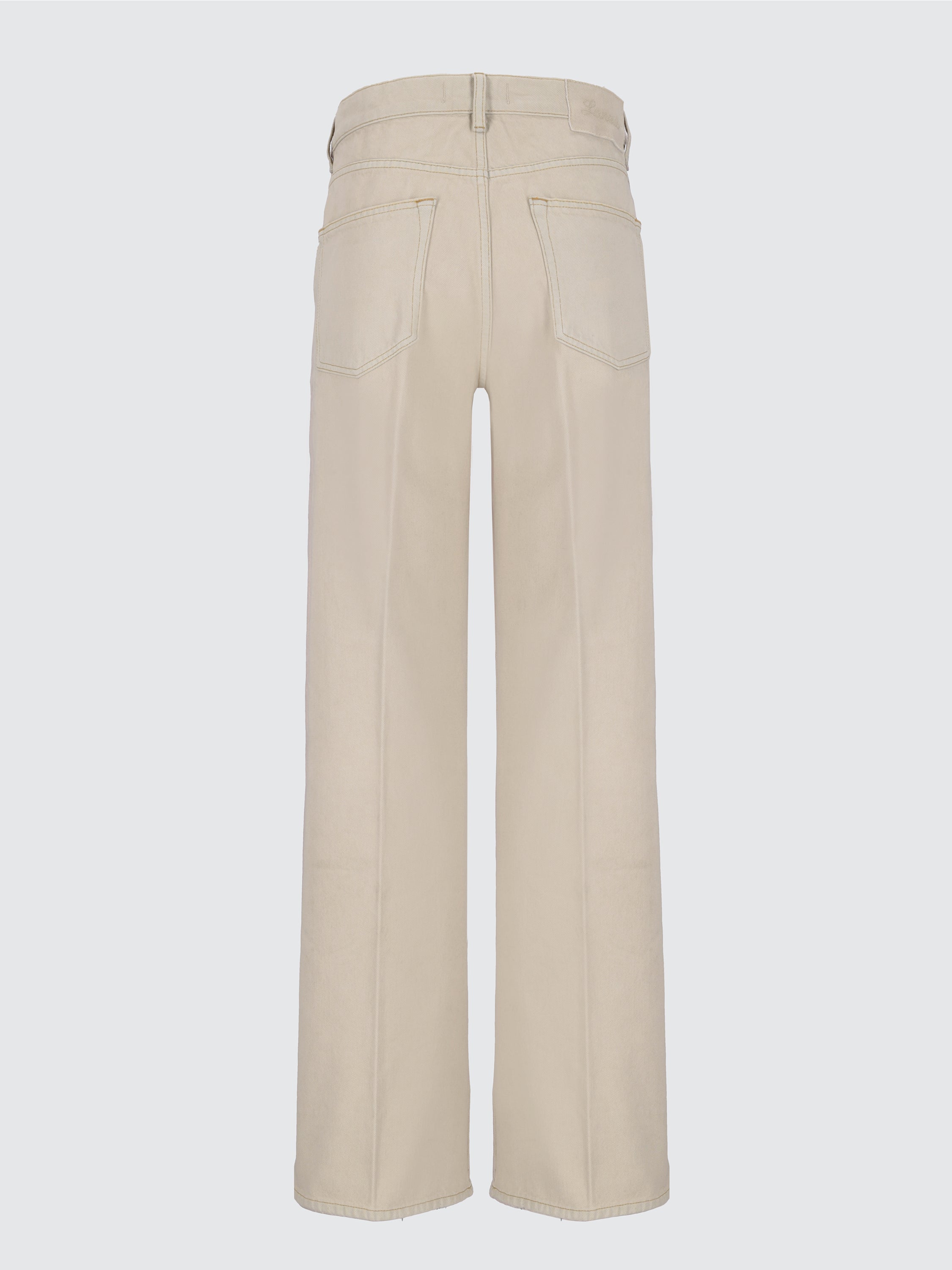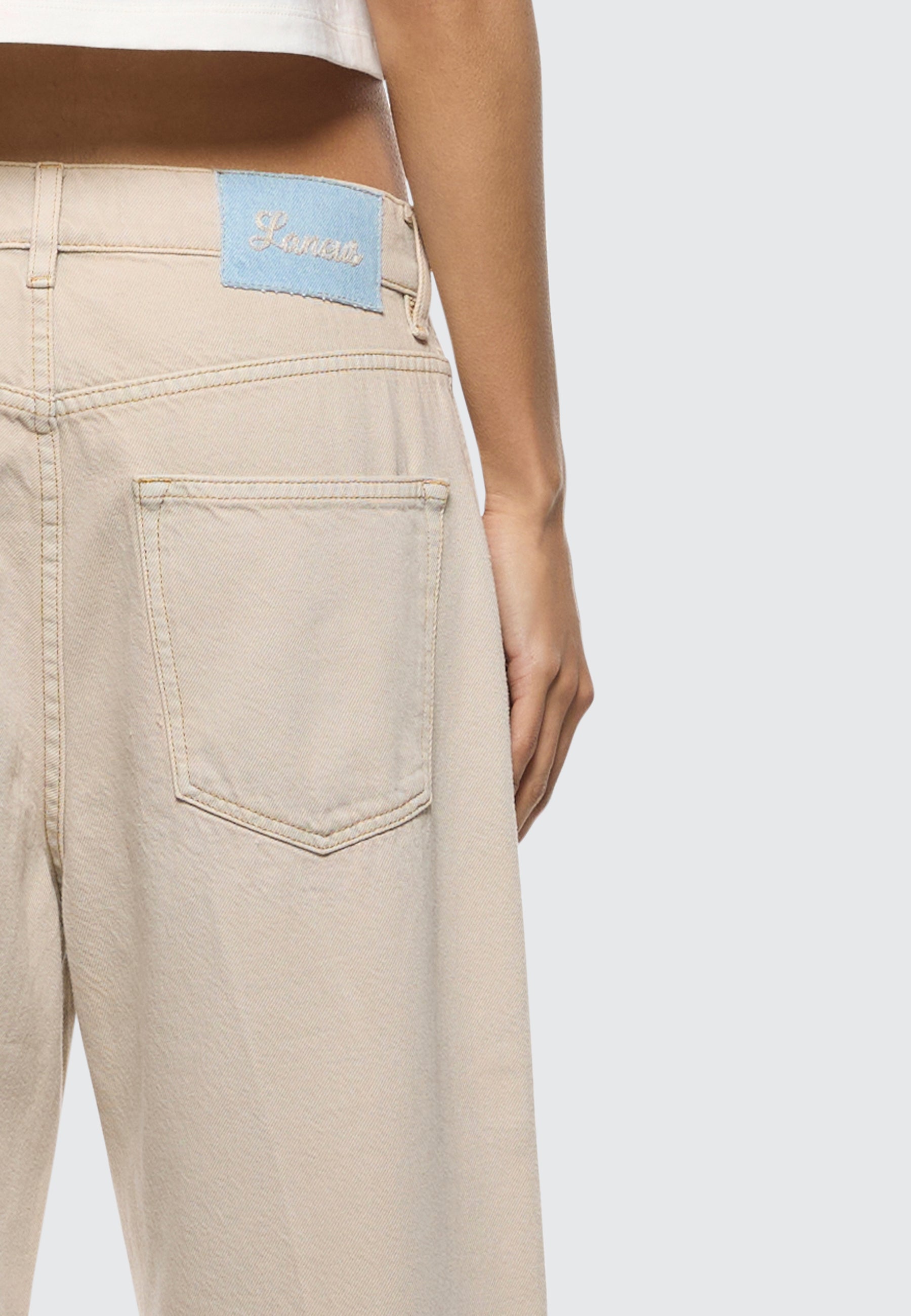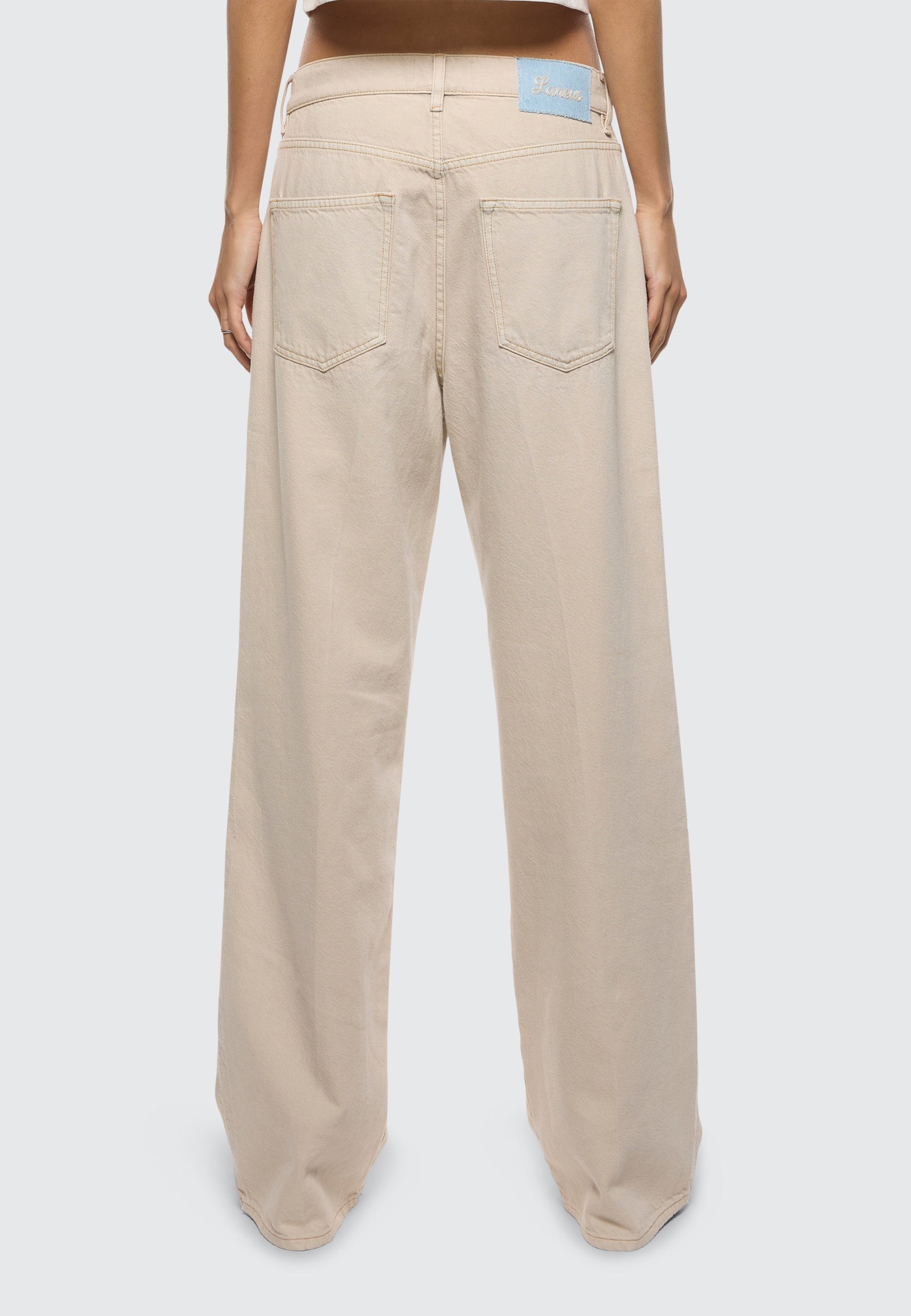 Realizzati in tela denim di puro cotone, questi jeans di Laneus presentano una silhouette baggy-fit cascante con gamba larga e una finitura color tortora leggermente sbiadita. La modella è alta 180 cm ed indossa una 26.