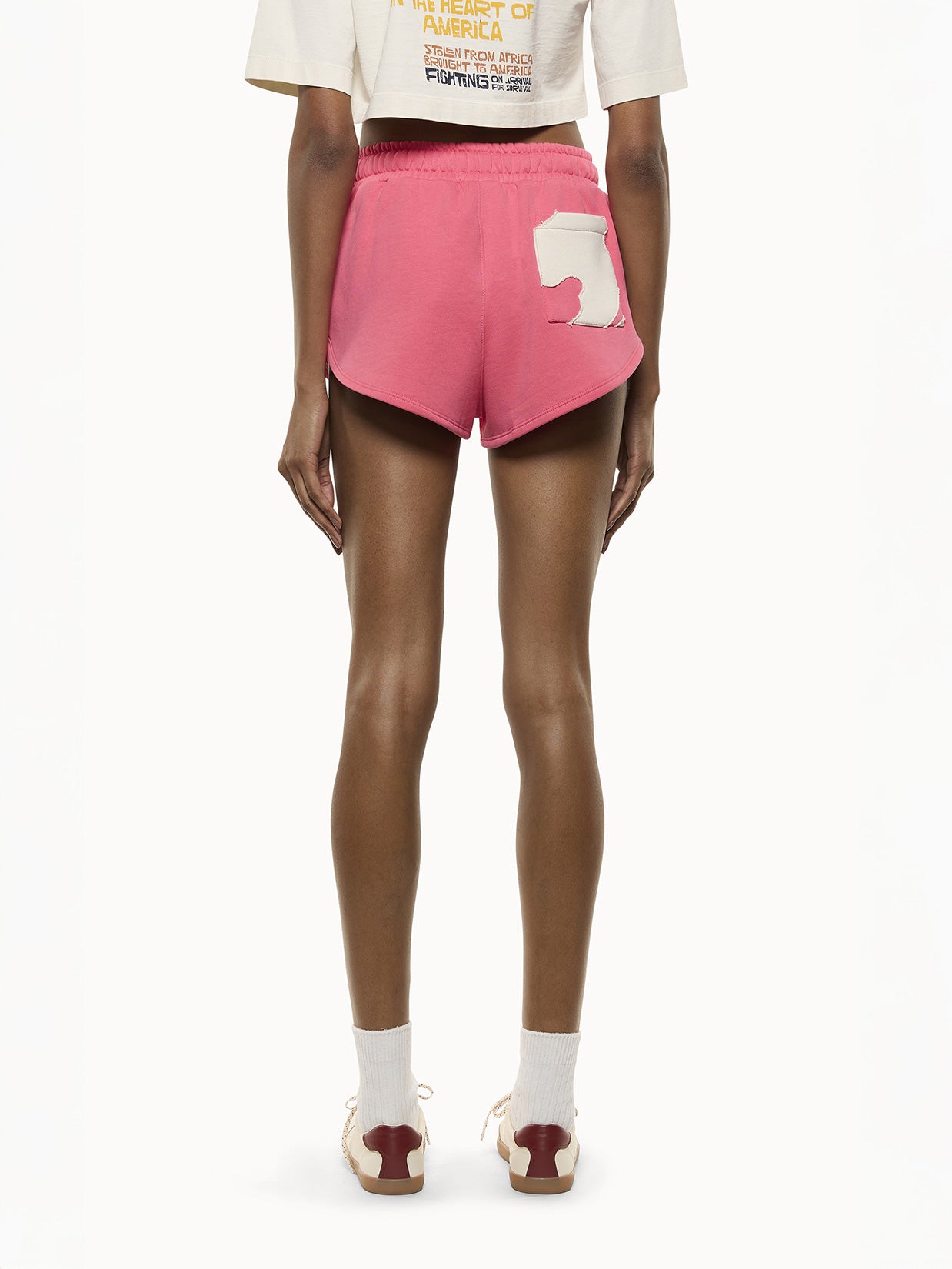 Shorts in felpa di cotone tinta unita, si presentano con una silhouette sgambata e una vita alta con elastico e coulisse logata. Dettaglio sul retro con tasca multicolor.