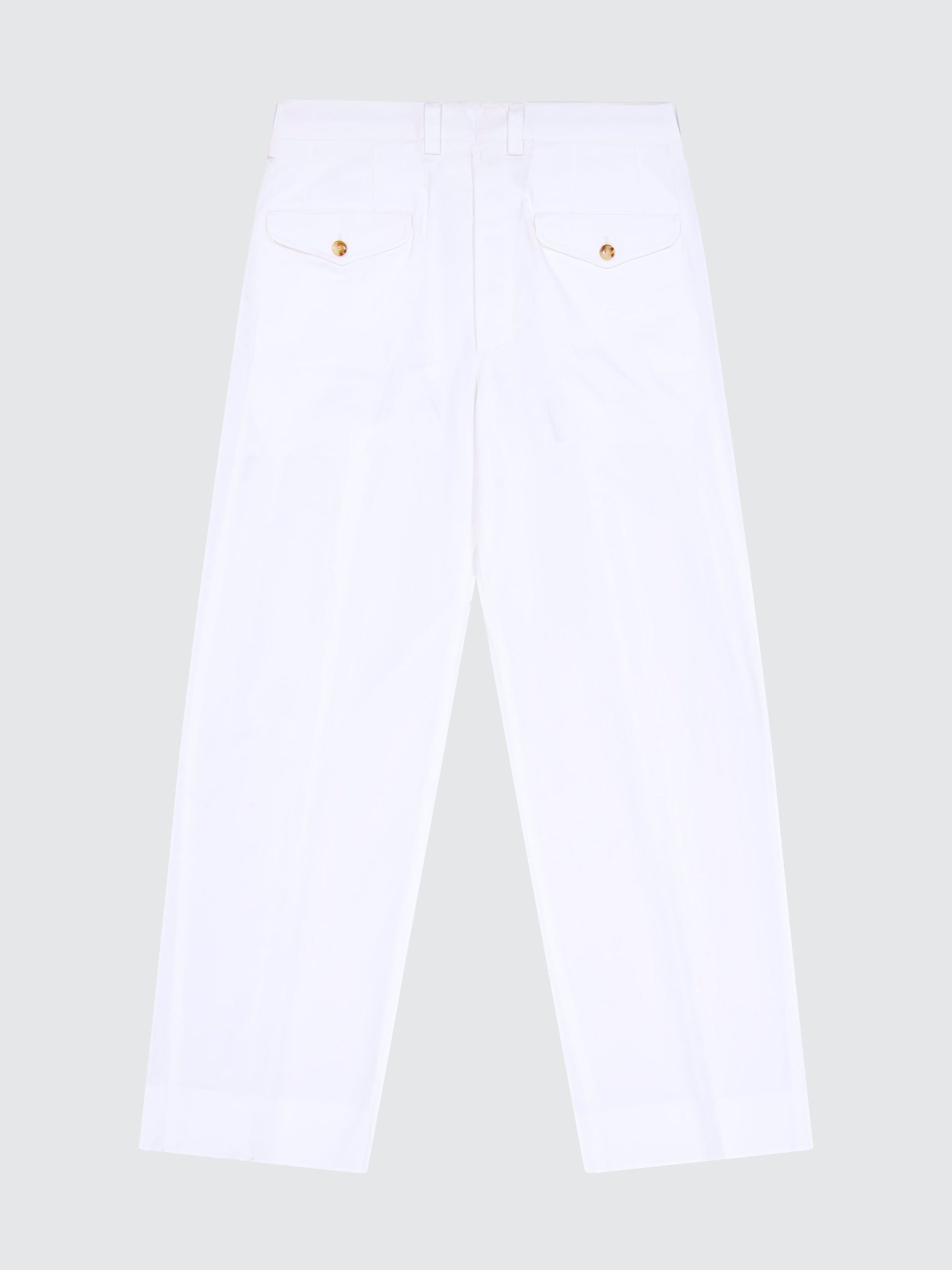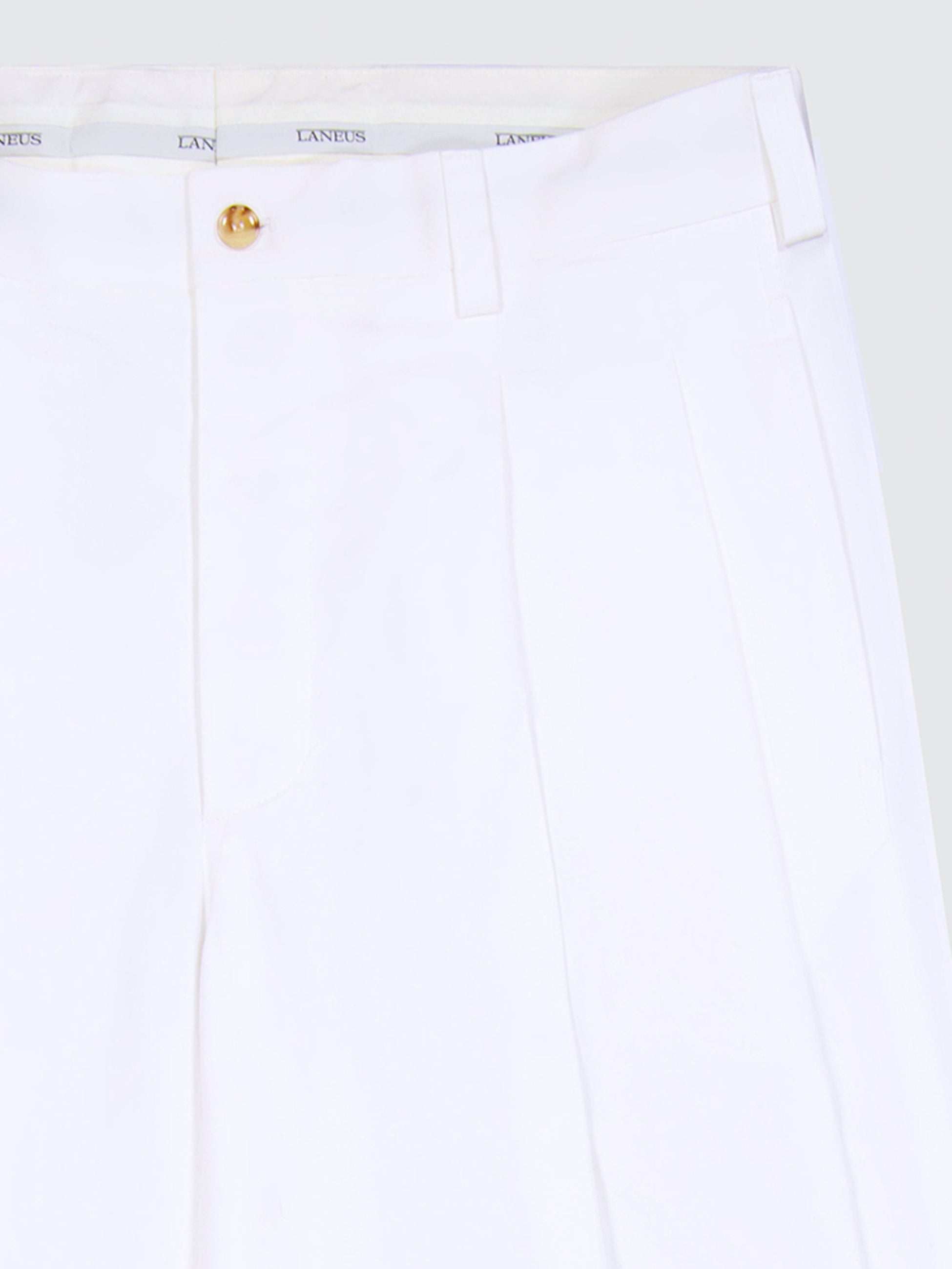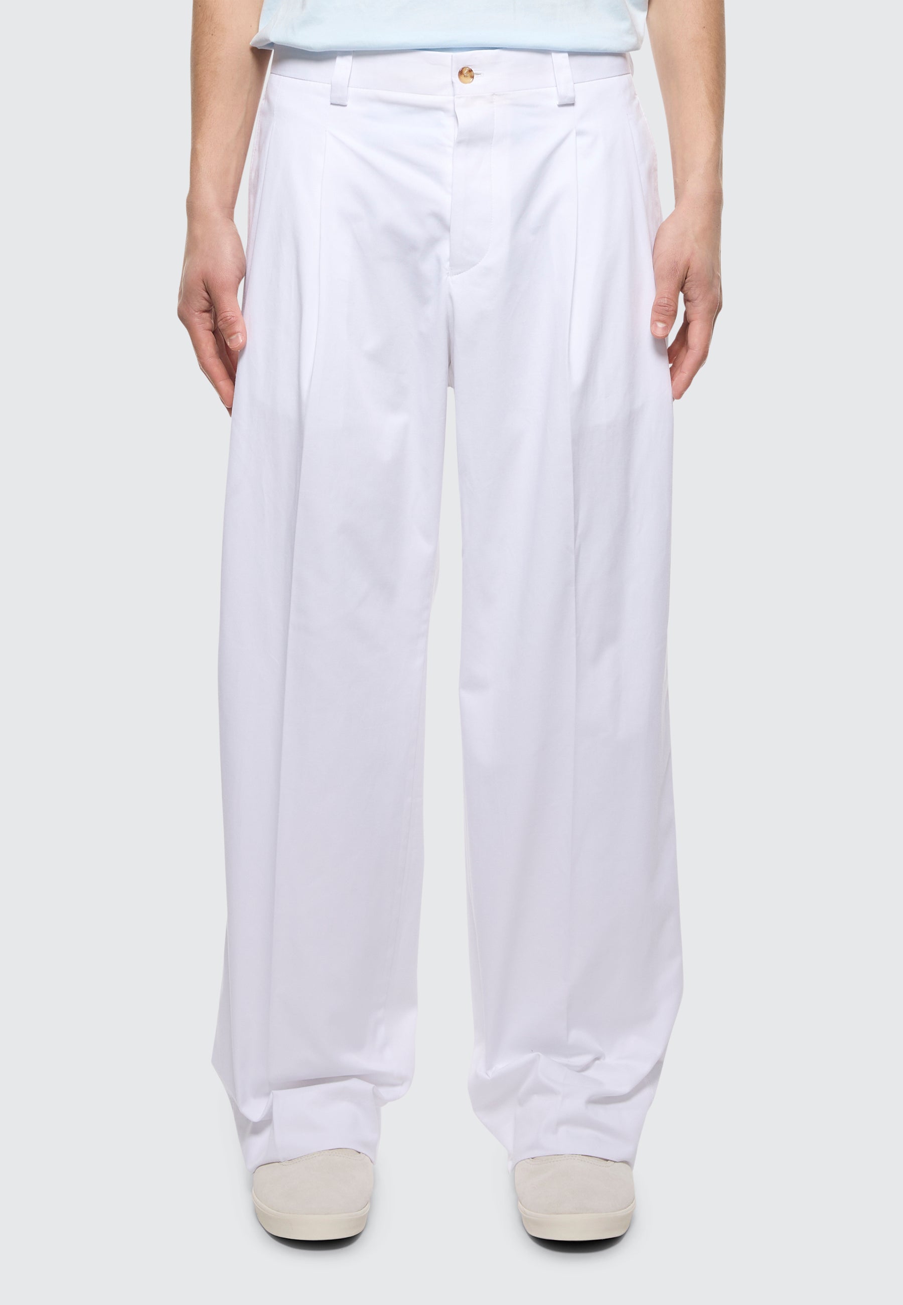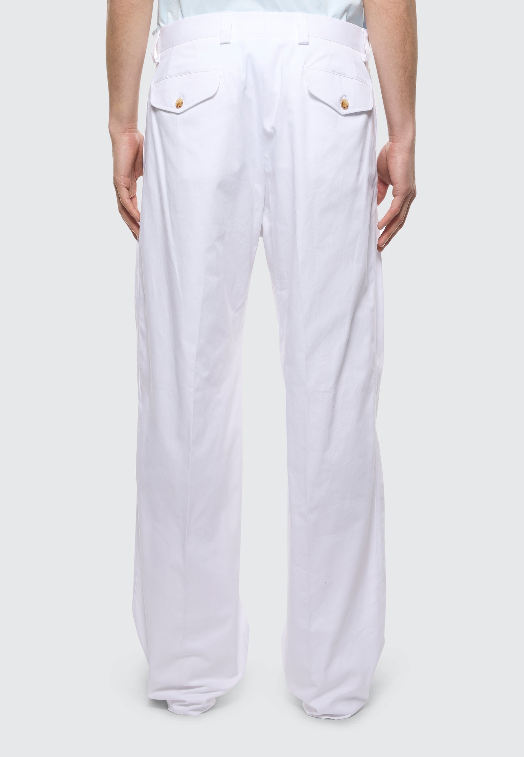 Pantaloni dal taglio classico di Laneus sono realizzati in raso di cotone e hanno una silhouette baggy ripresi dalla doppia pence. Presentano il cinturino precostruito, chiusura con bottone e tasca all'americana. Il modello è alto 190 cm ed indossa una 48/M