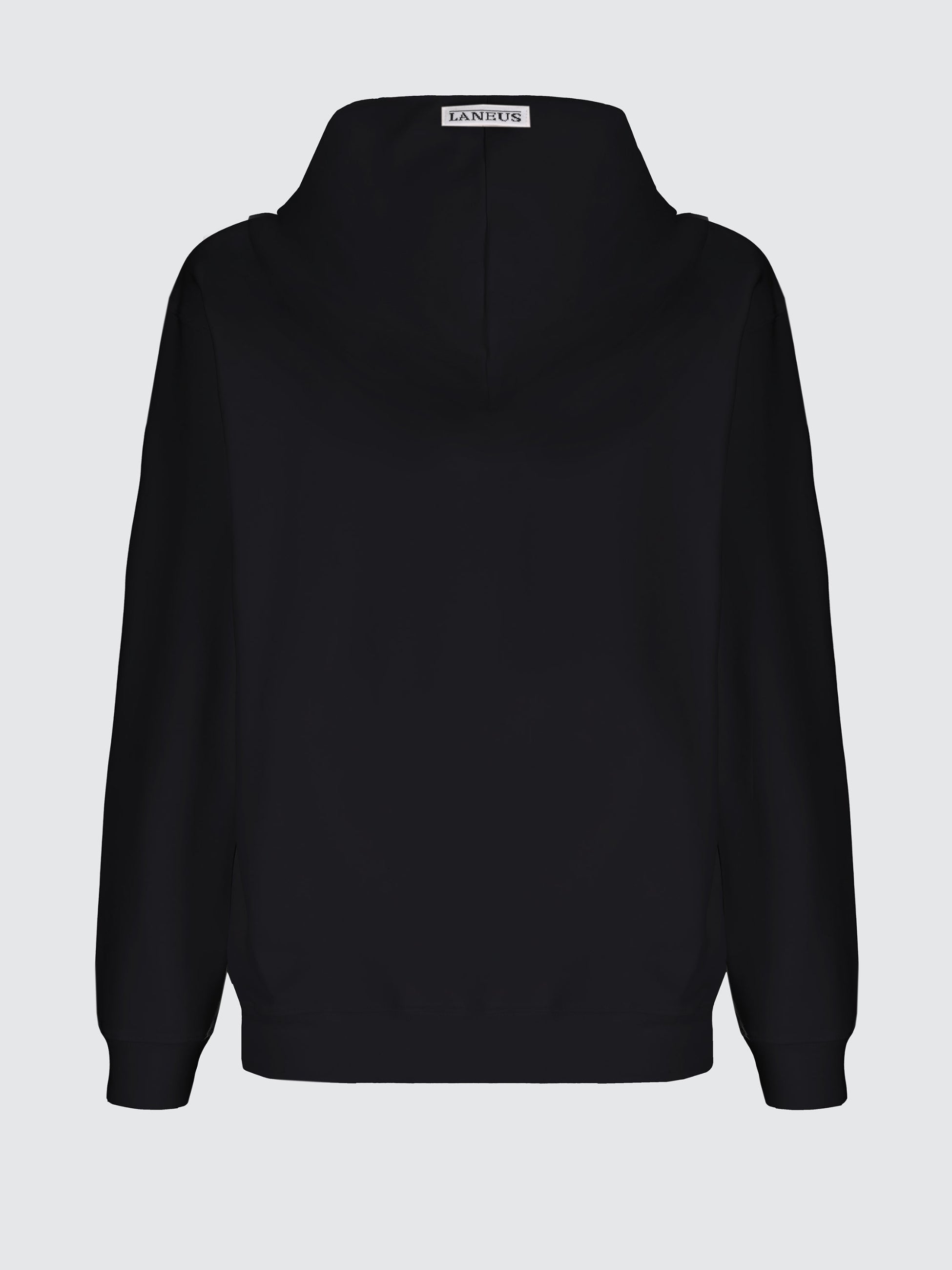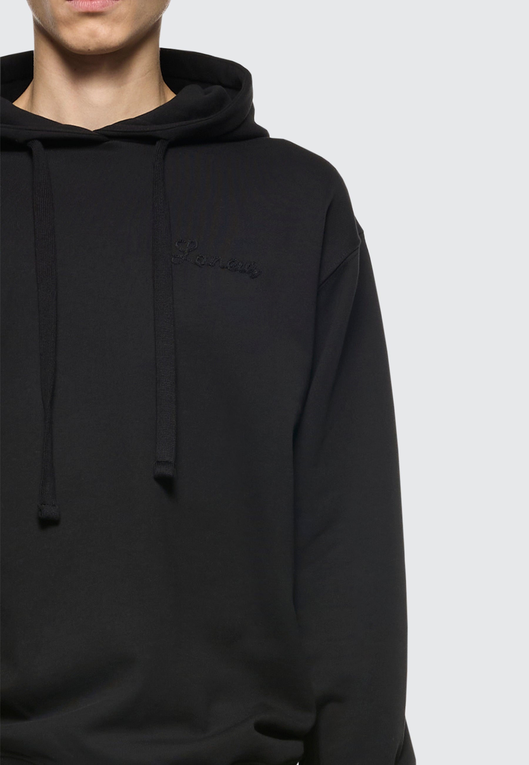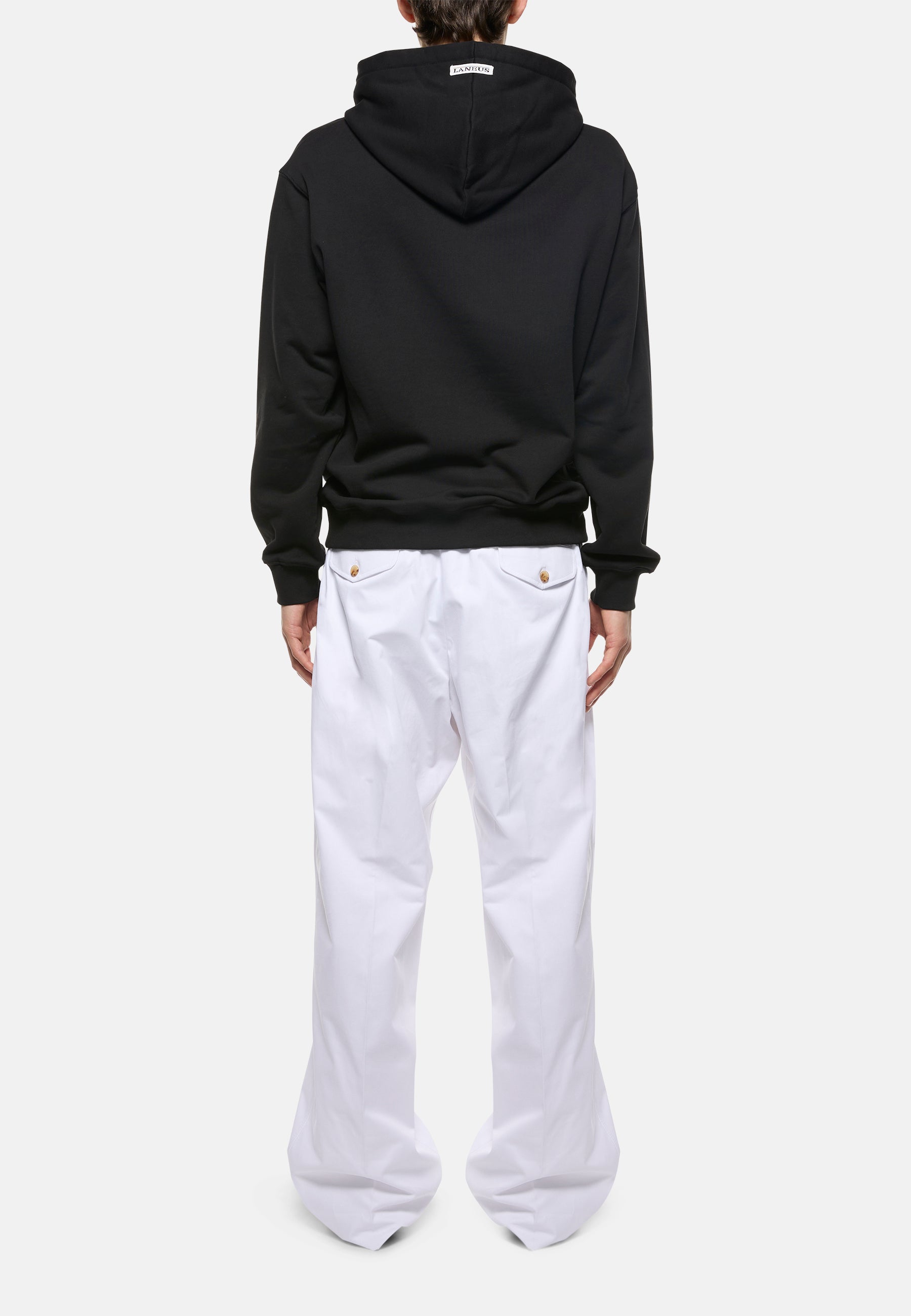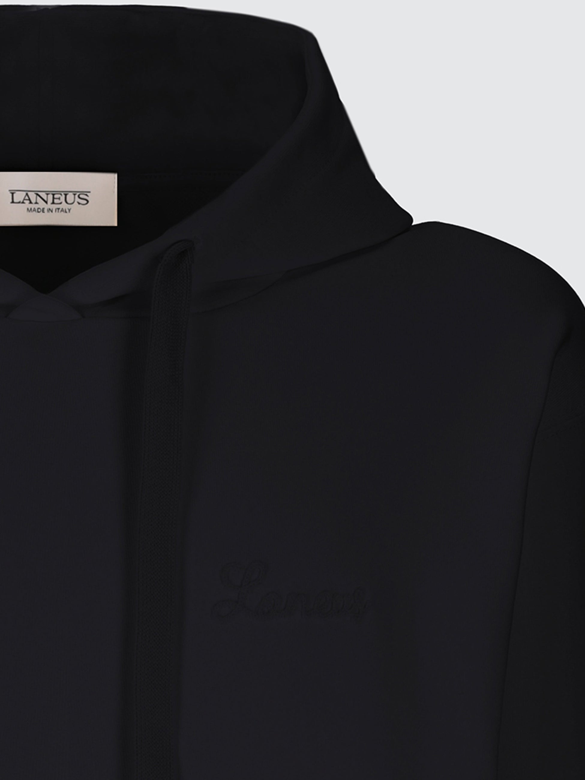 La felpa di Laneus offre una vestibilità boxy con manica scesa. Il modello è realizzato in puro cotone ed è dotato di cappuccio con coulisse regolabili in maglia. Arricchito dal logo del brand ricamato sur ton. Il modello è alto 190 cm ed indossa una 48/M