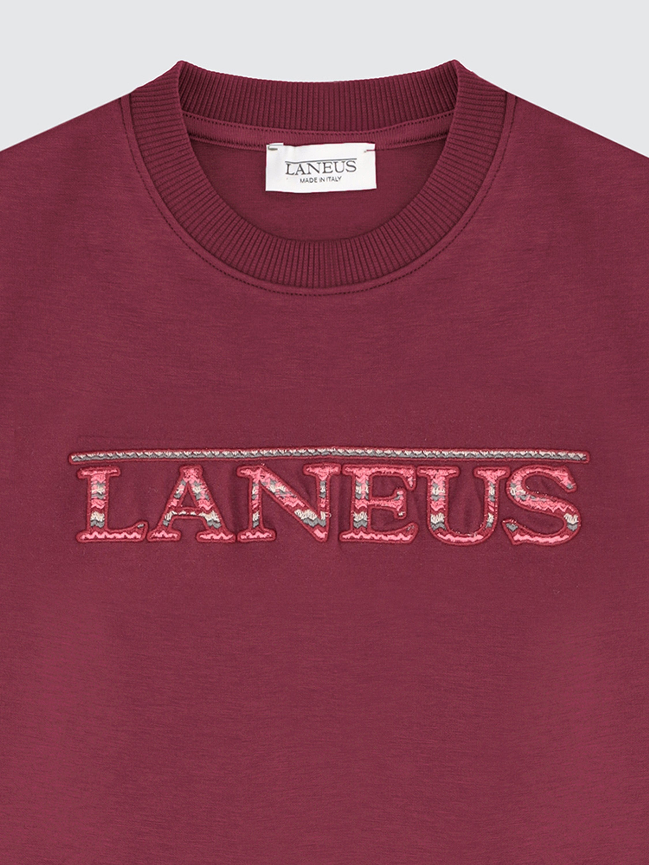 Felpa girocollo da bimba/o firmata Laneus, realizzata in interlock di cotone stretch. Il logo ricamato sul petto è arricchito da filati effetto jacquard tono su tono per un tocco distintivo e morbido. Polsini, collo e fondo in costina per una vestibilità confortevole e stabile.