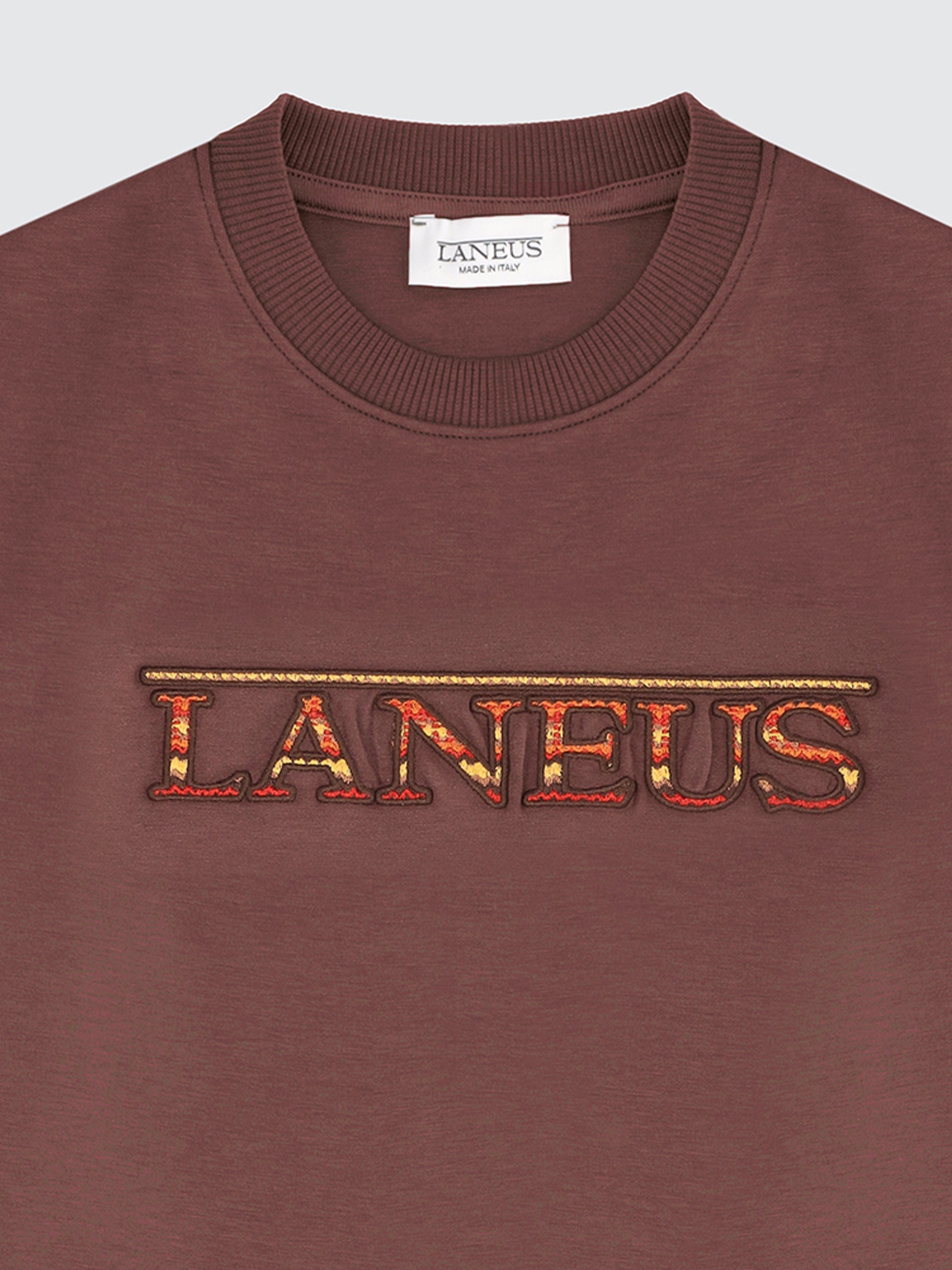Felpa girocollo da bimba/o firmata Laneus, realizzata in interlock di cotone stretch. Il logo ricamato sul petto è arricchito da filati effetto jacquard tono su tono per un tocco distintivo e morbido. Polsini, collo e fondo in costina per una vestibilità confortevole e stabile.