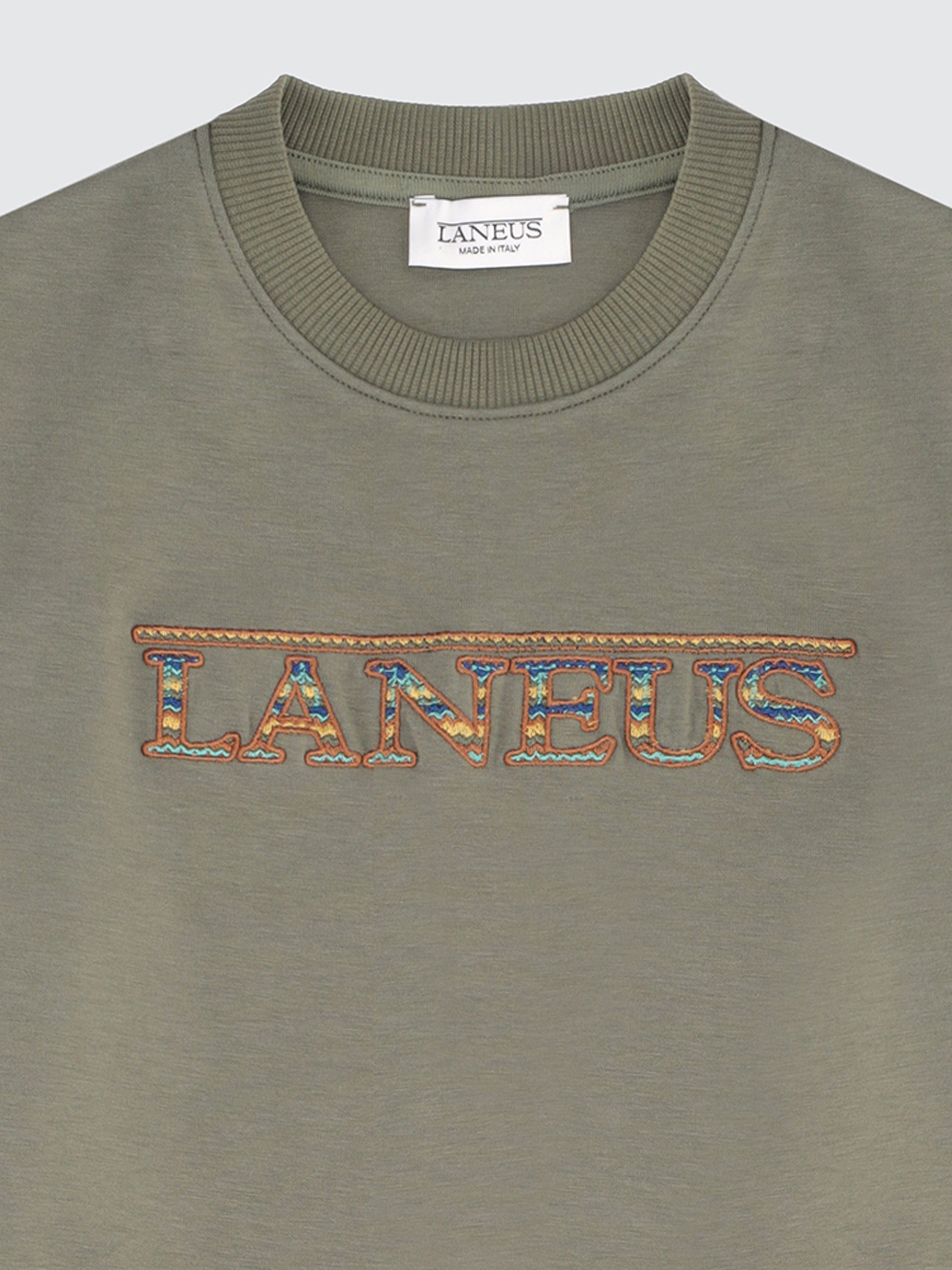 Felpa girocollo da bimba/o firmata Laneus, realizzata in interlock di cotone stretch. Il logo ricamato sul petto è arricchito da filati effetto jacquard tono su tono per un tocco distintivo e morbido. Polsini, collo e fondo in costina per una vestibilità confortevole e stabile.