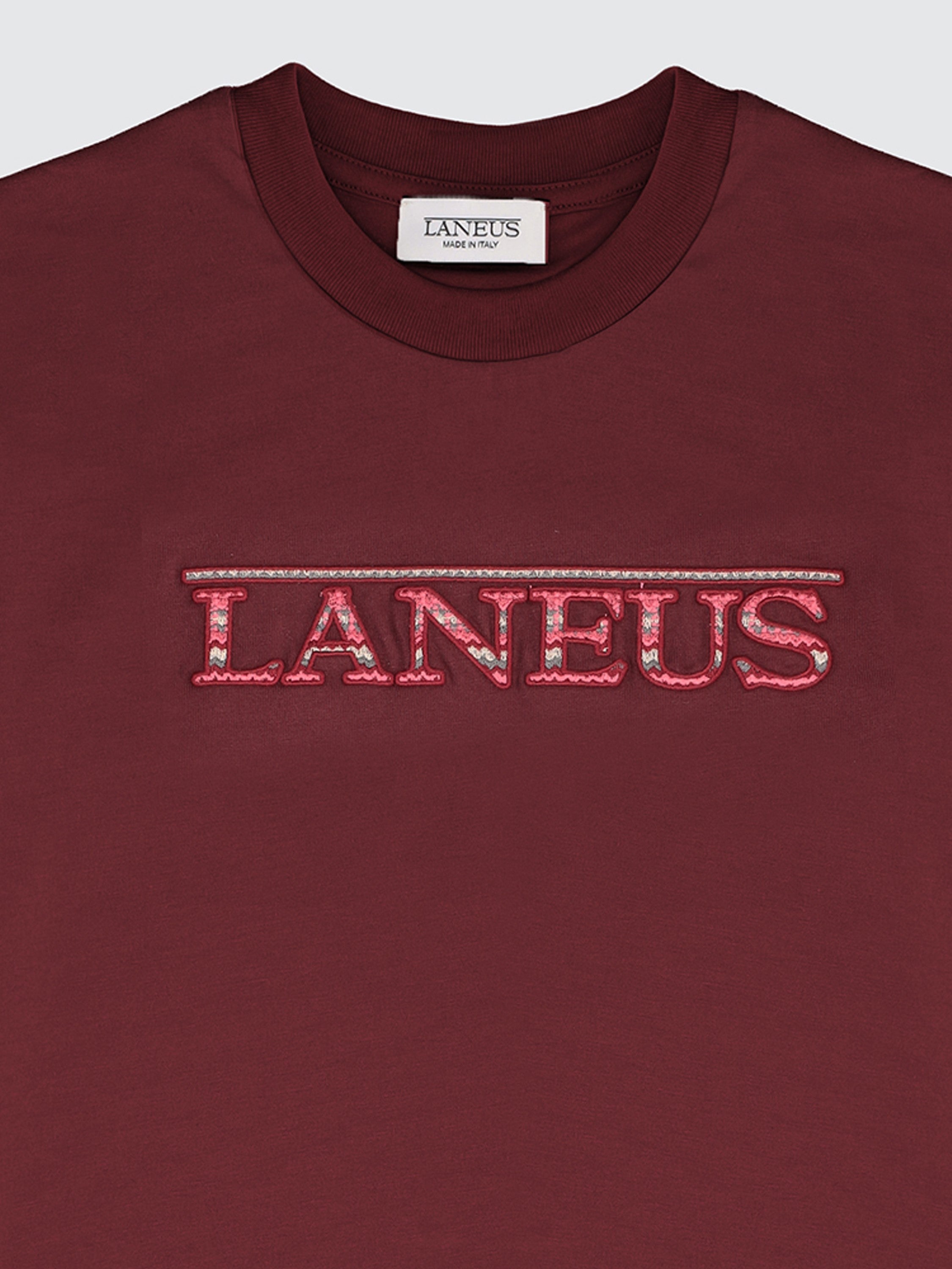 T-shirt per bambina/o firmata Laneus, realizzata in jersey di puro cotone. Il capo presenta una vestibilità regular con maniche corte e girocollo rifinito in costina. Il logo Laneus ricamato sul petto con filati multicolore effetto maglia richiama il motivo jacquard iconico della collezione.