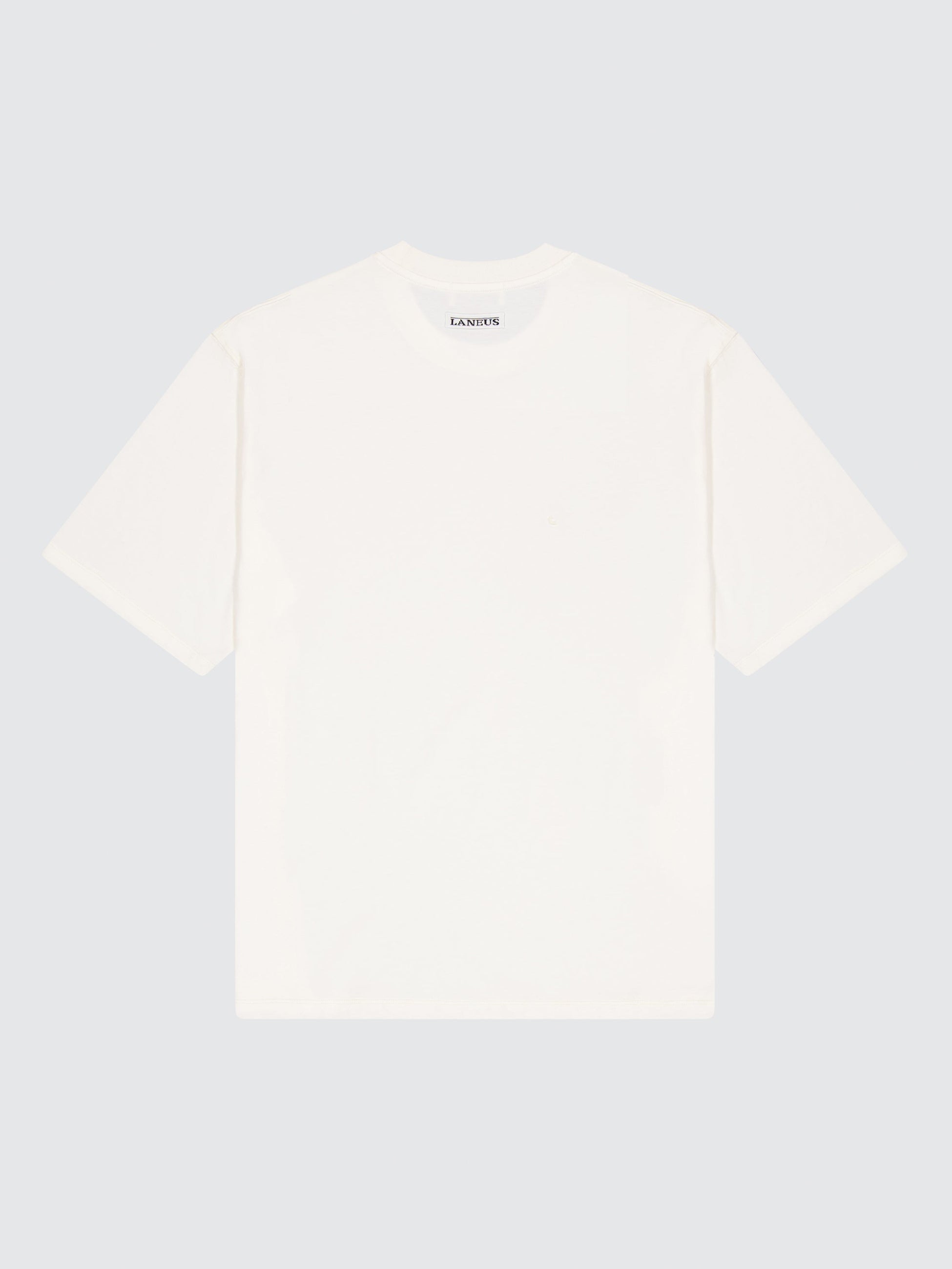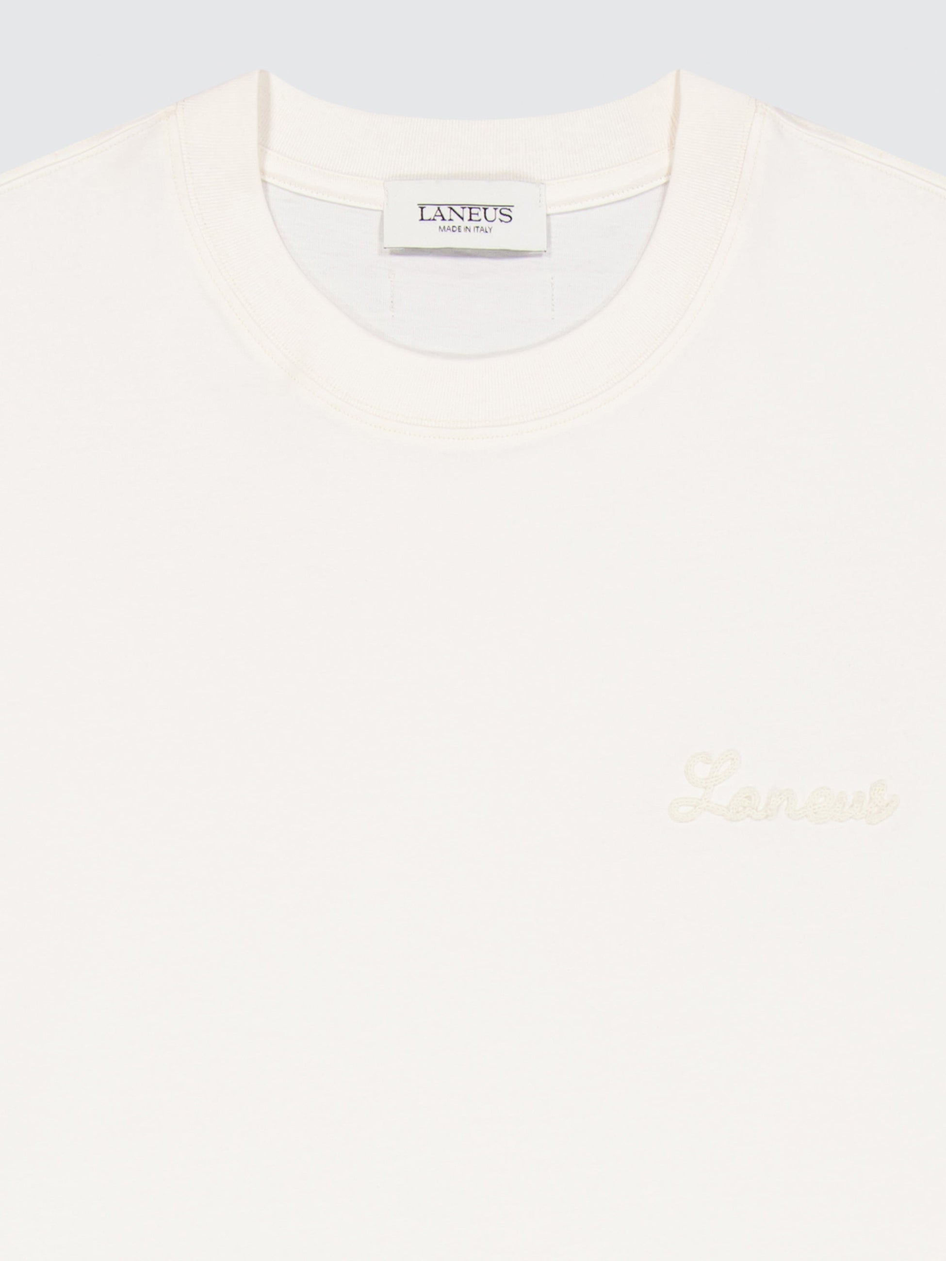 Questa T-shirt a maniche corte di Laneus è realizzata in Italia in puro jersey di cotone. Il modello girocollo dal fit comodo presenta il logo del brand a contrasto. Made in Italy. Il modello è alto 190 cm ed indossa una 48/M
