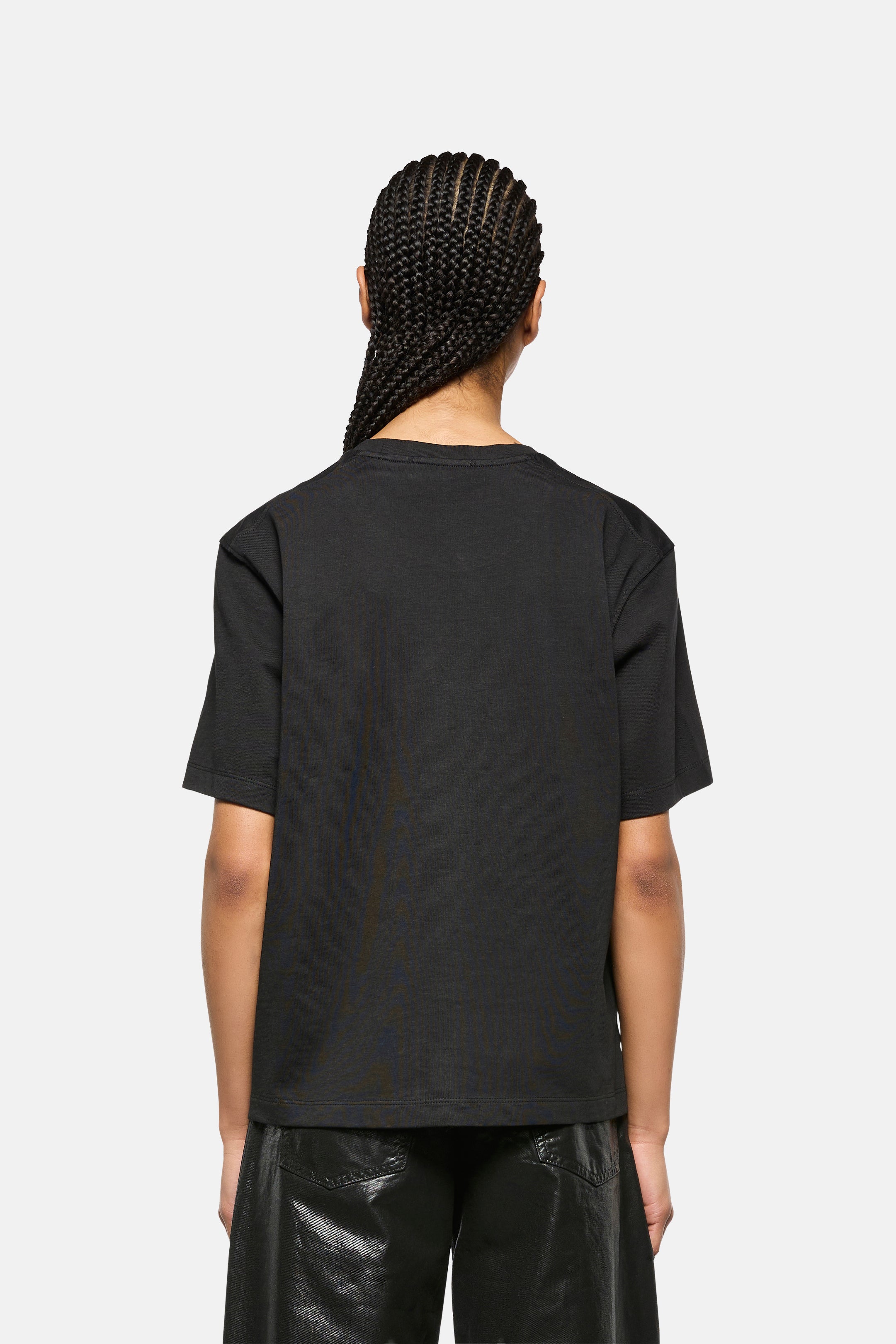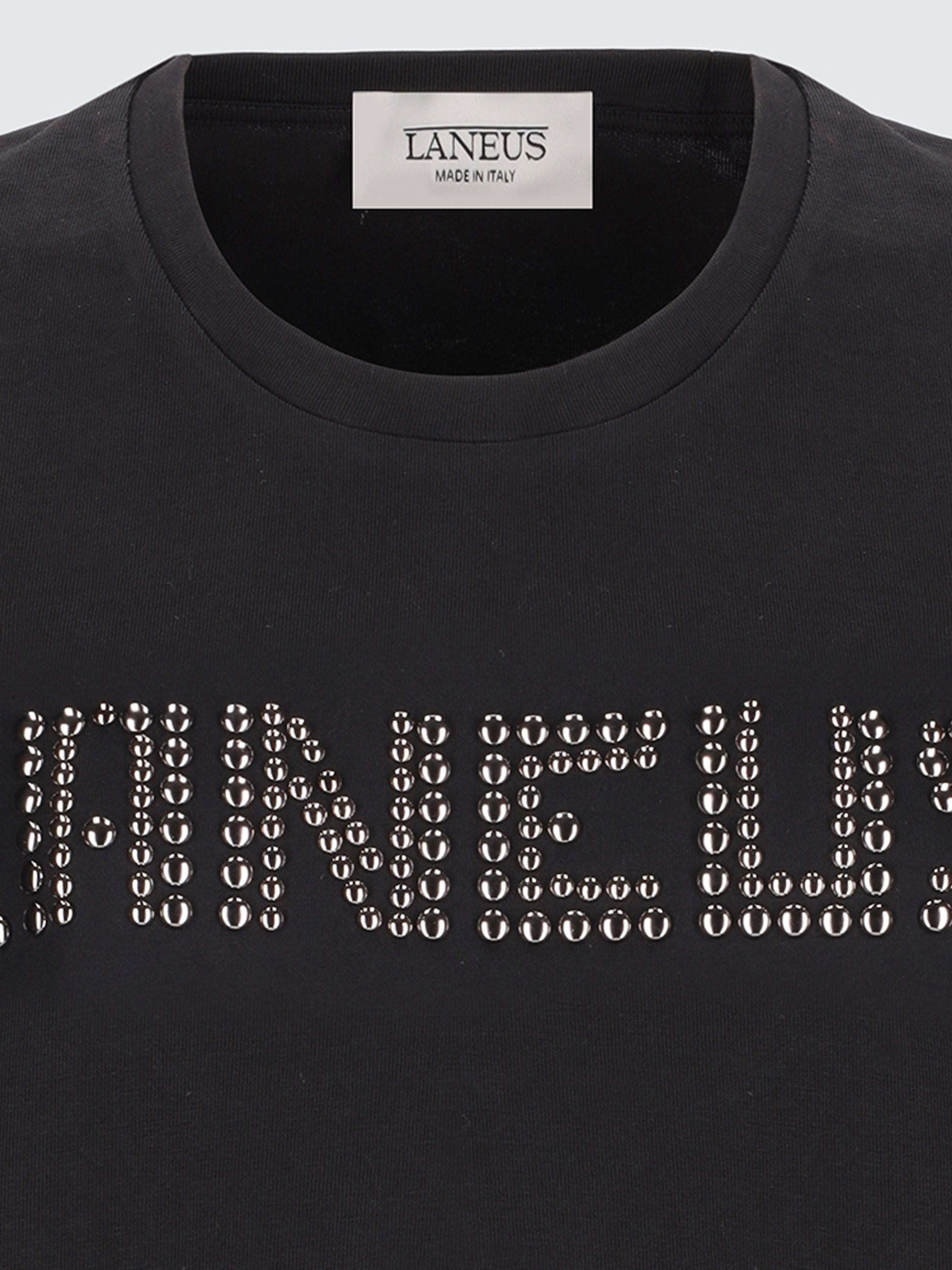 Spirito grafico e taglio essenziale per questa T-shirt firmata Laneus. Realizzata in 100% cotone, presenta una vestibilità regular con bordi leggermente molati per un effetto vissuto. Il logo Laneus è valorizzato da applicazioni di borchie che donano al capo un twist deciso e contemporaneo. Perfetta da indossare da sola o sotto blazer e giacche. Made in Italy.