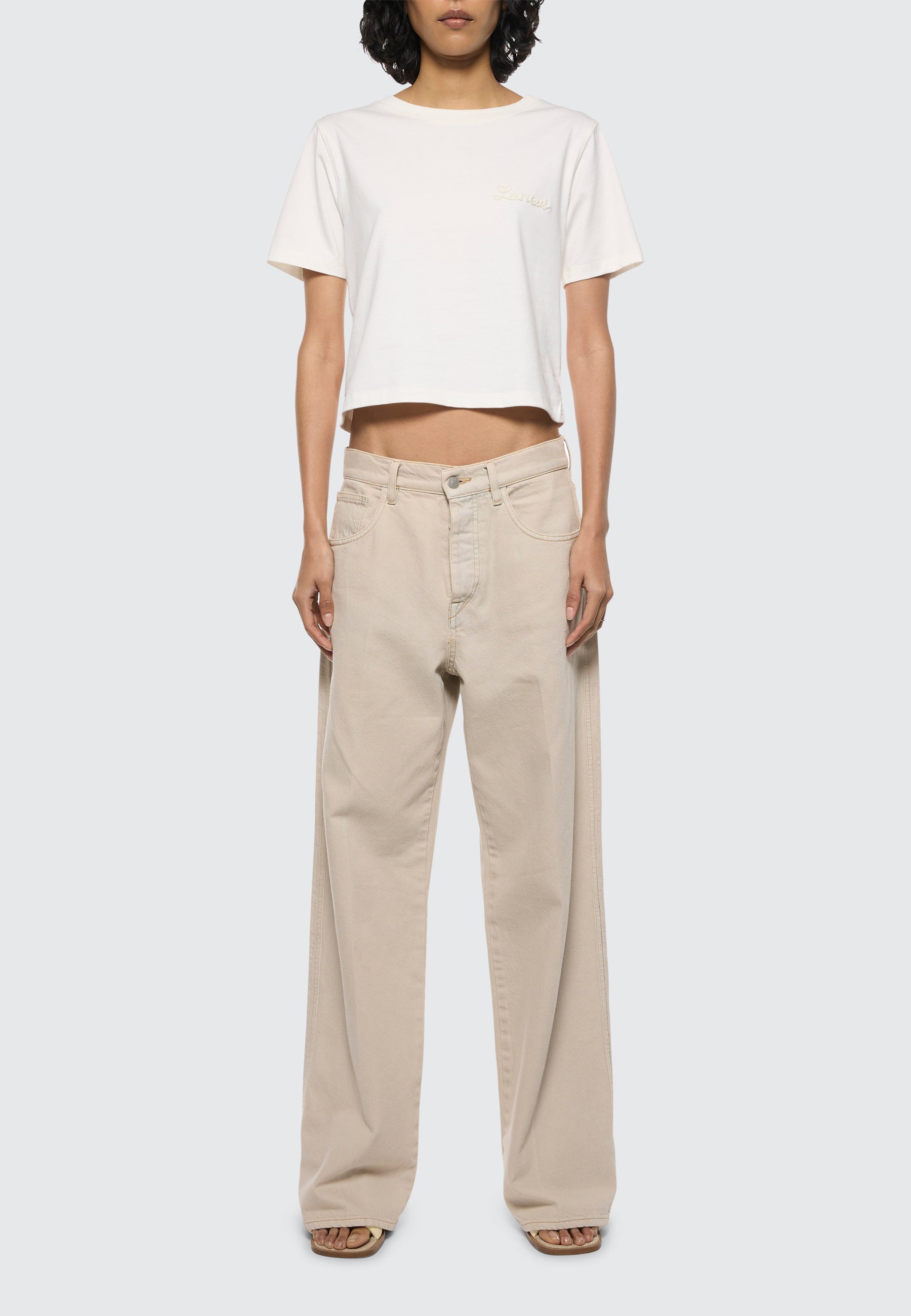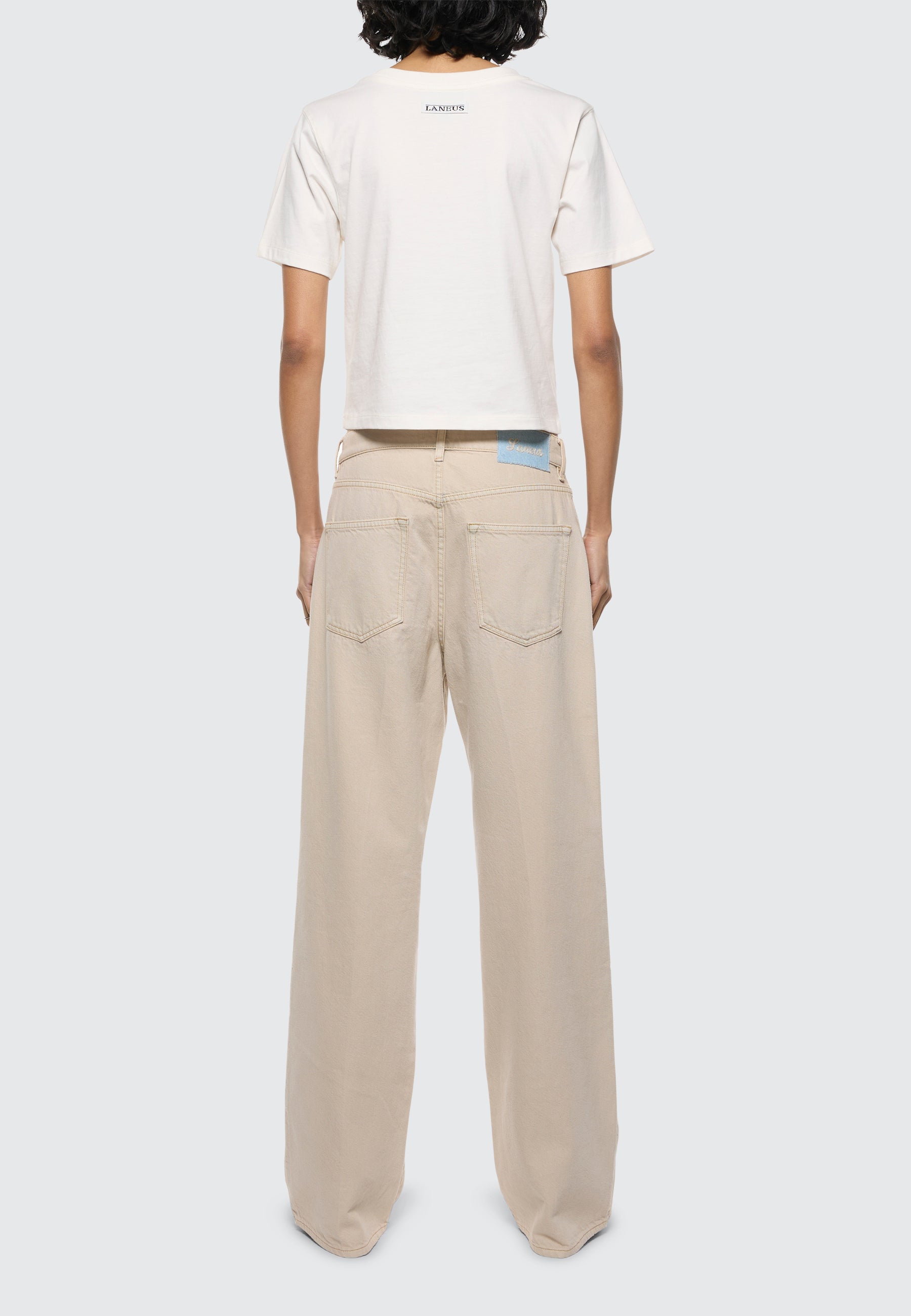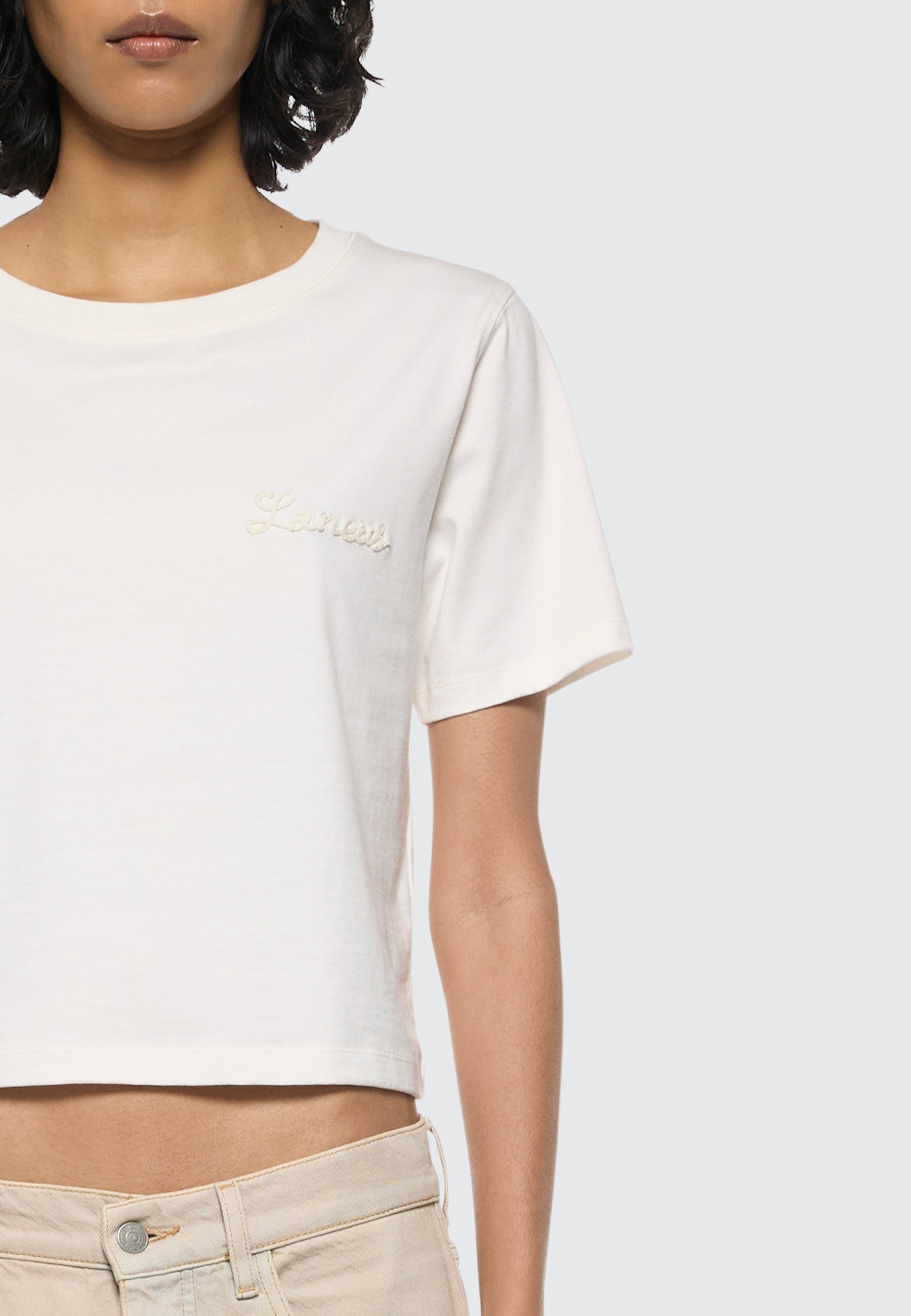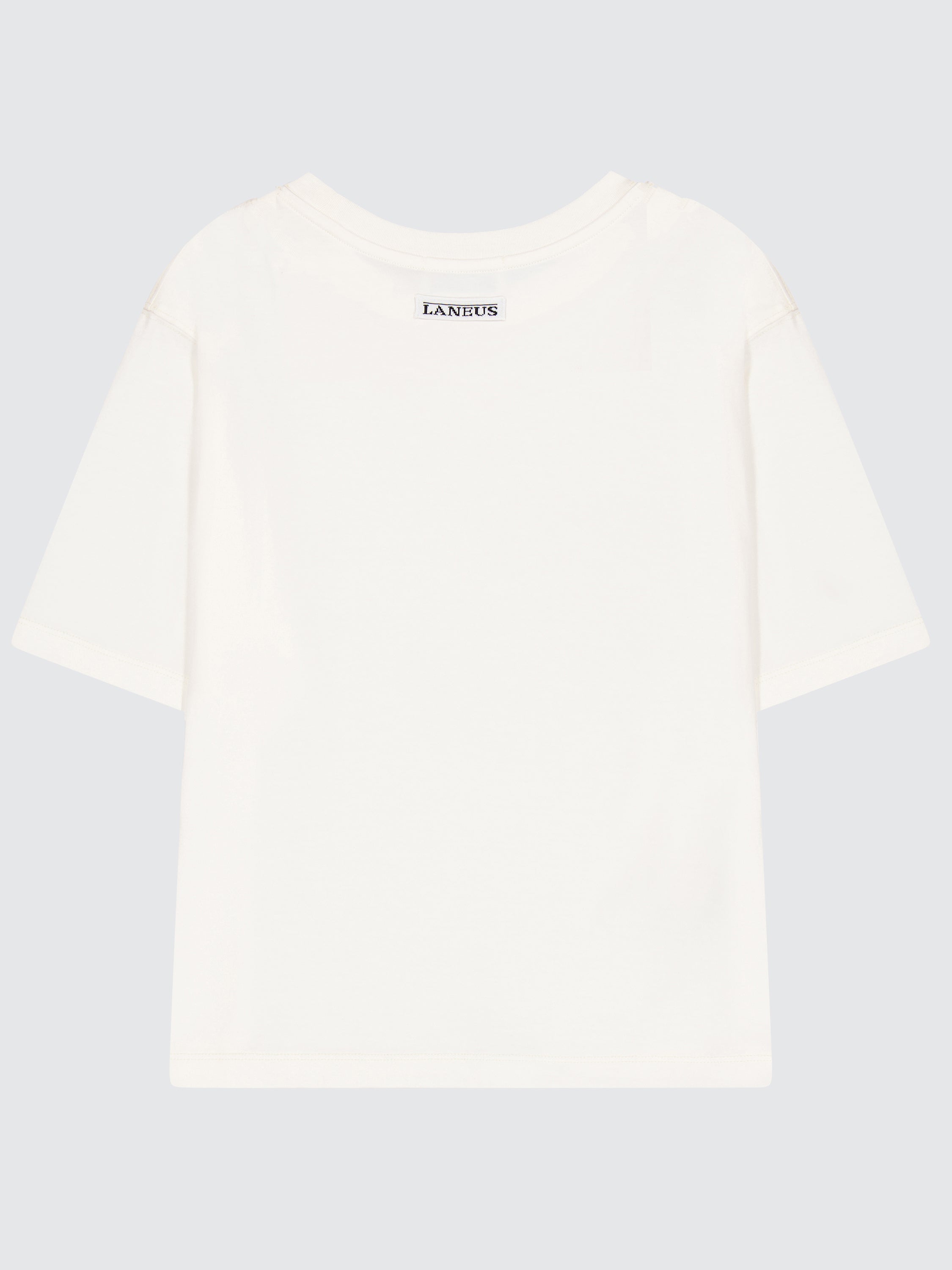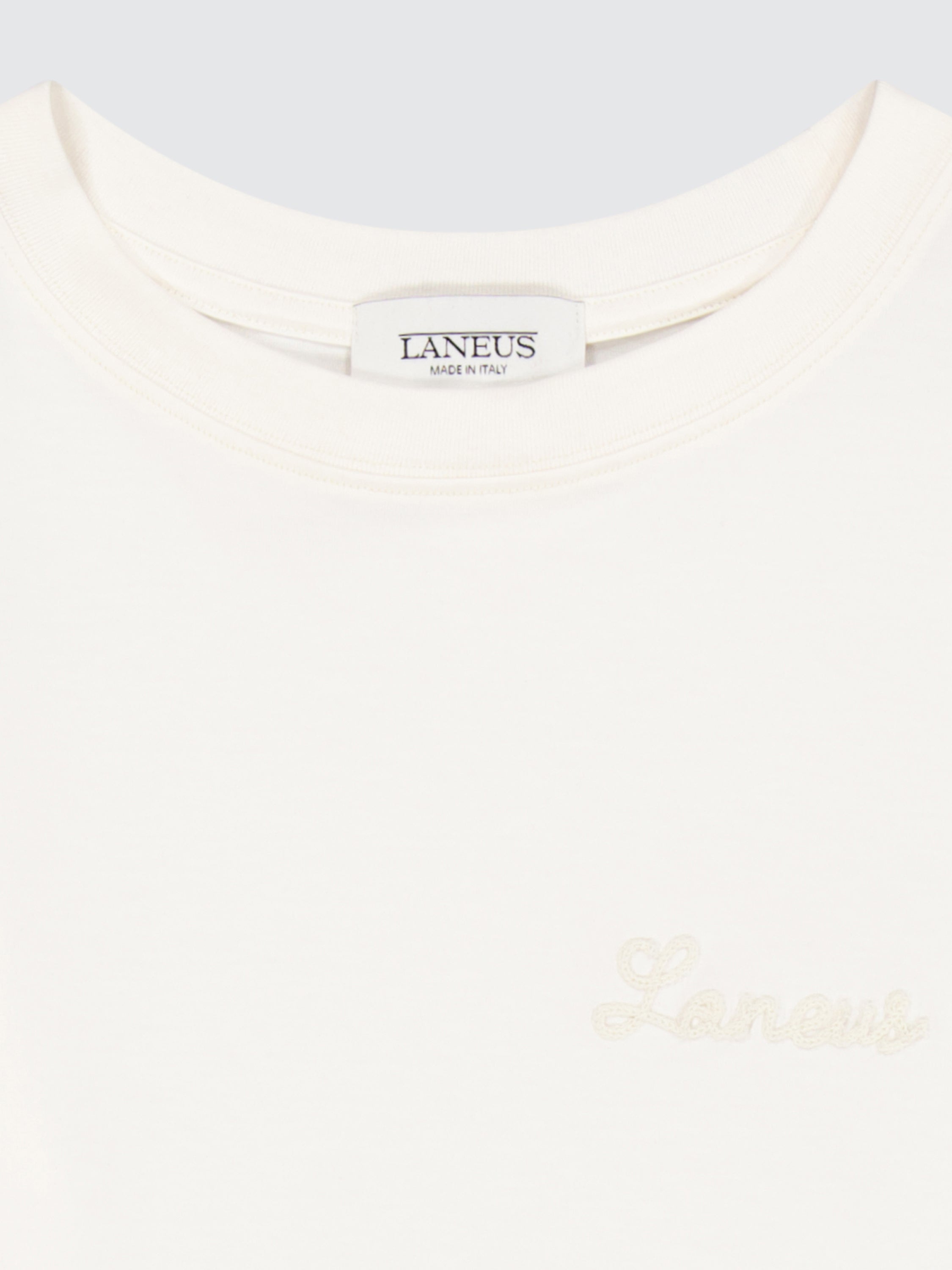 Questa T-shirt a maniche corte di Laneus è realizzata in Italia in puro jersey di cotone. Il modello boxy con girocollo ampio è caratterizzato da una manica corta larga ed è impreziosito dal logo del brand ricamato sul lato.