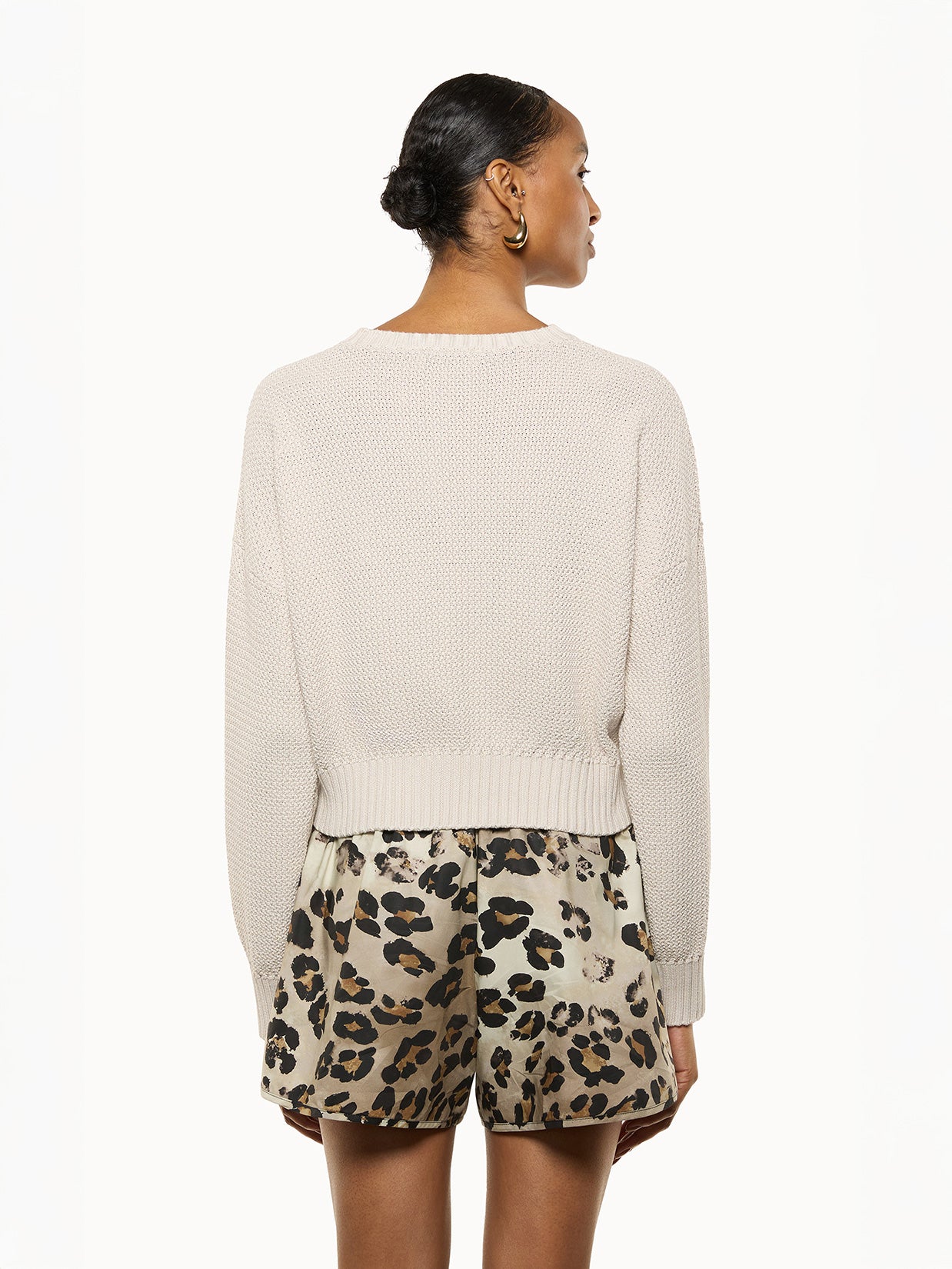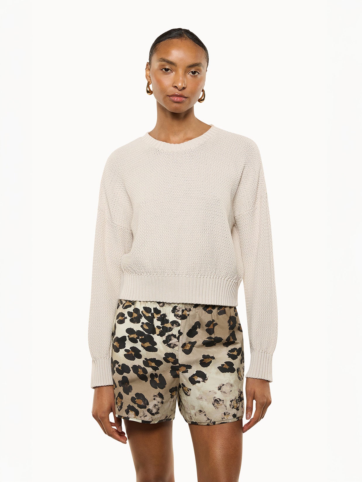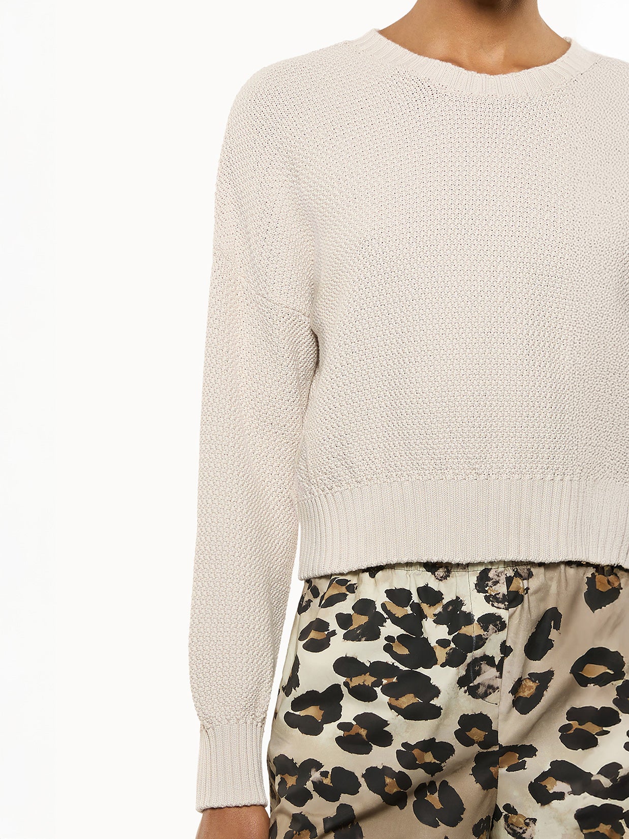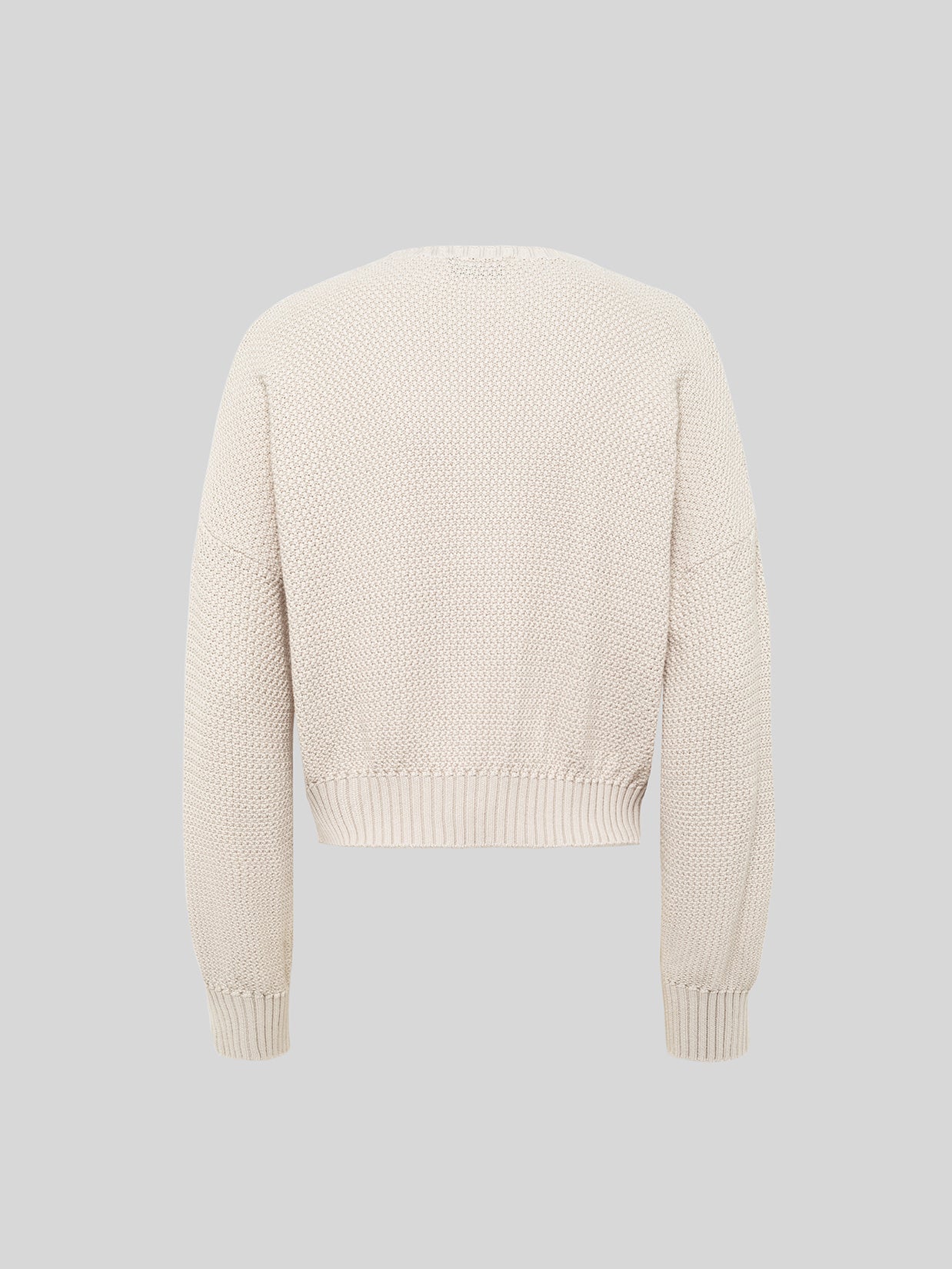 Maglia girocollo con lavorazione intrecciata. La silhouette dal taglio corto con vestibilità boxy, è pulita, pensata per valorizzare la texture e il pattern. Realizzata in cotone. Made in Italy.