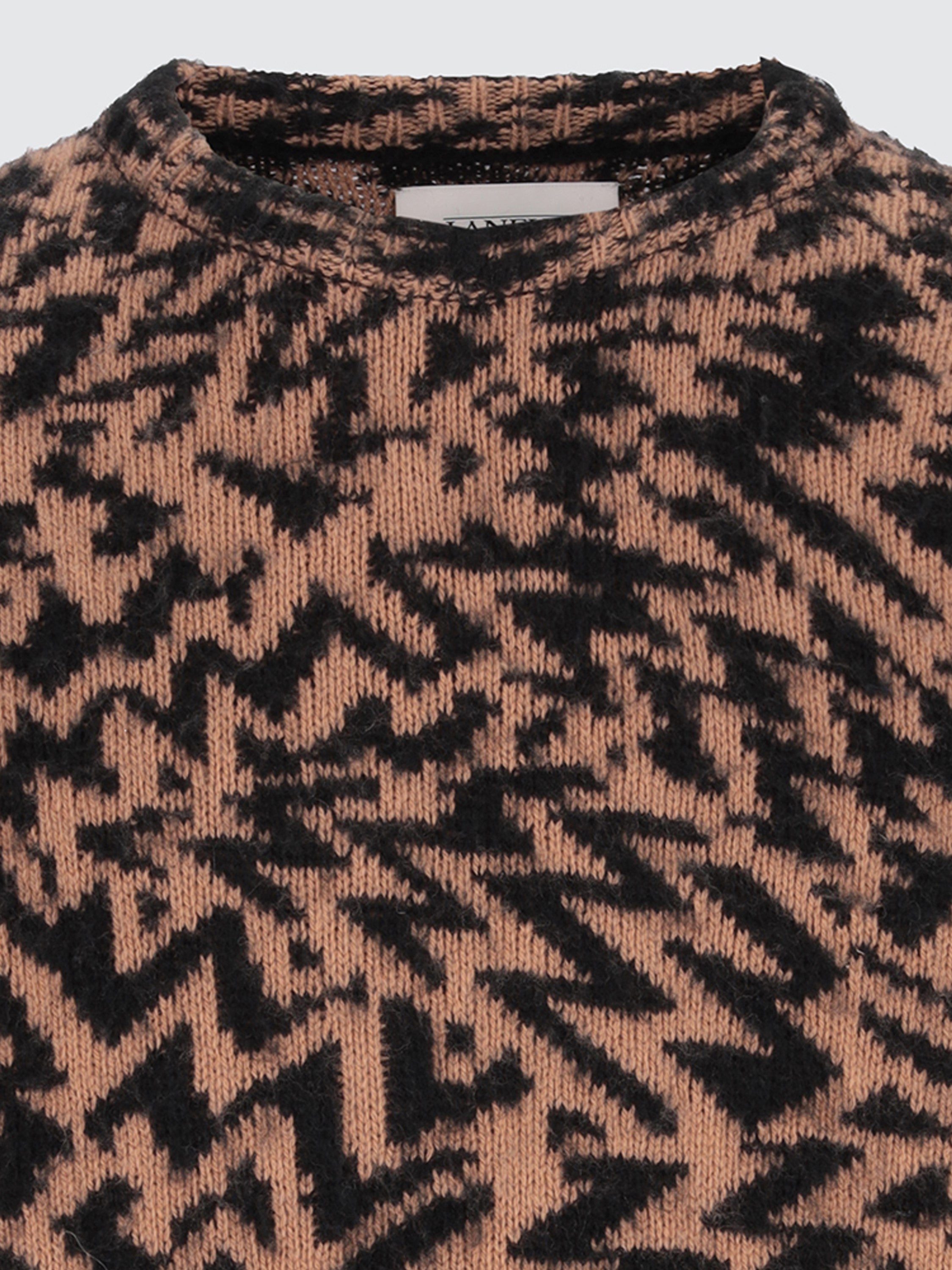 Maglia girocollo firmata Laneus, realizzata in un ricco mix di filati tra cui lana, alpaca e cashmere. Caratterizzata da una lavorazione jacquard con disegno grafico all-over, presenta una vestibilità regular e finiture a costine su collo, fondo e polsi. Il mix di materiali dona al capo una texture morbida e calda, ideale per i look invernali dal carattere deciso. Made in Italy.