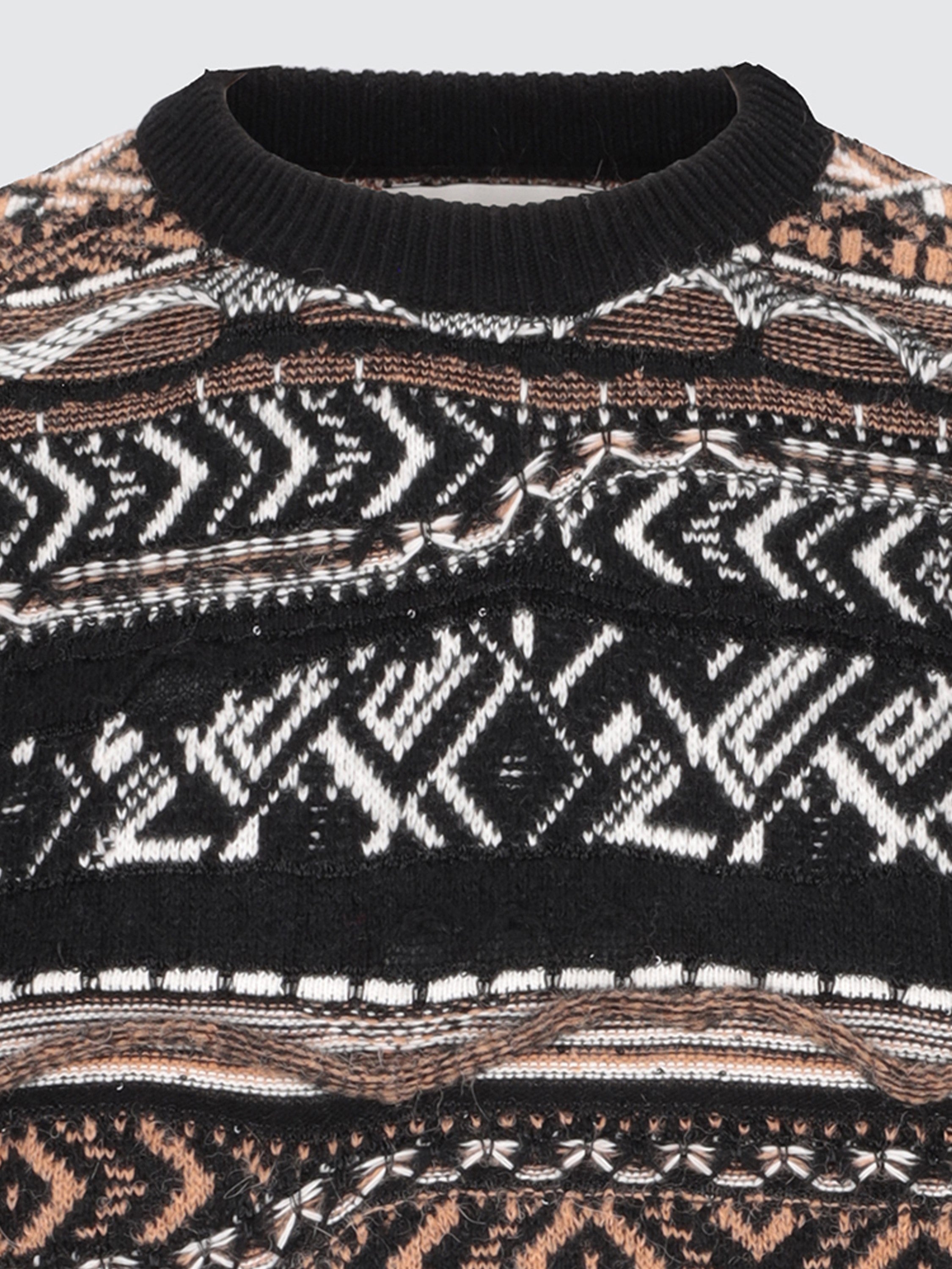 Maglia girocollo firmata Laneus, realizzata con l’iconico jacquard, rivisitato per la nuova stagione. Il motivo multicolore, ricco e dettagliato, include il logo "Laneus" integrato in modo elegante all'interno della trama. La vestibilità è regular, con finiture a costine su collo, fondo e polsi. Made in Italy.