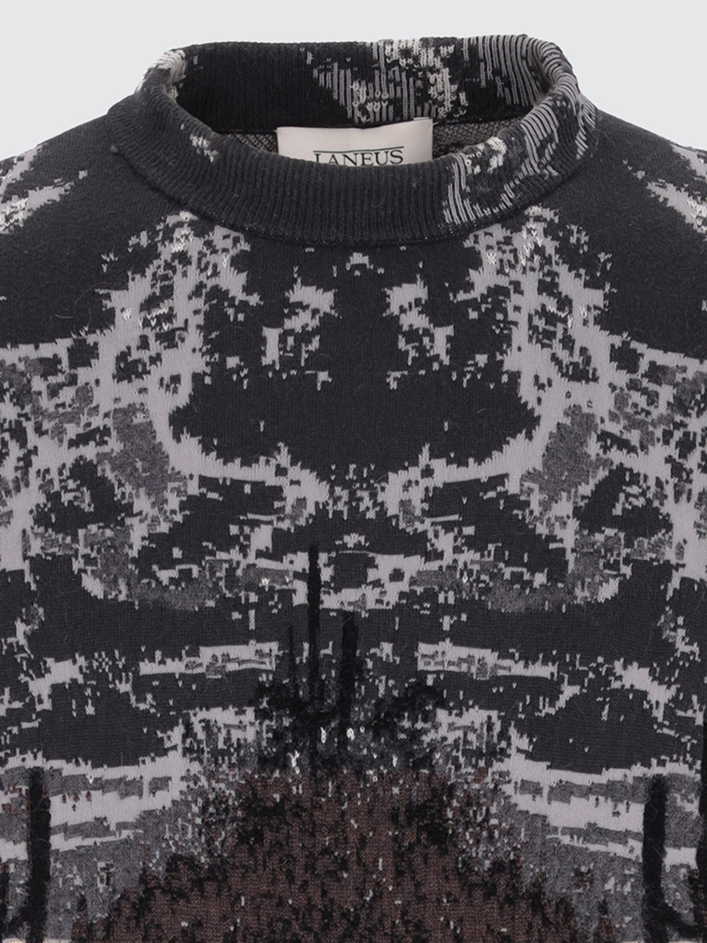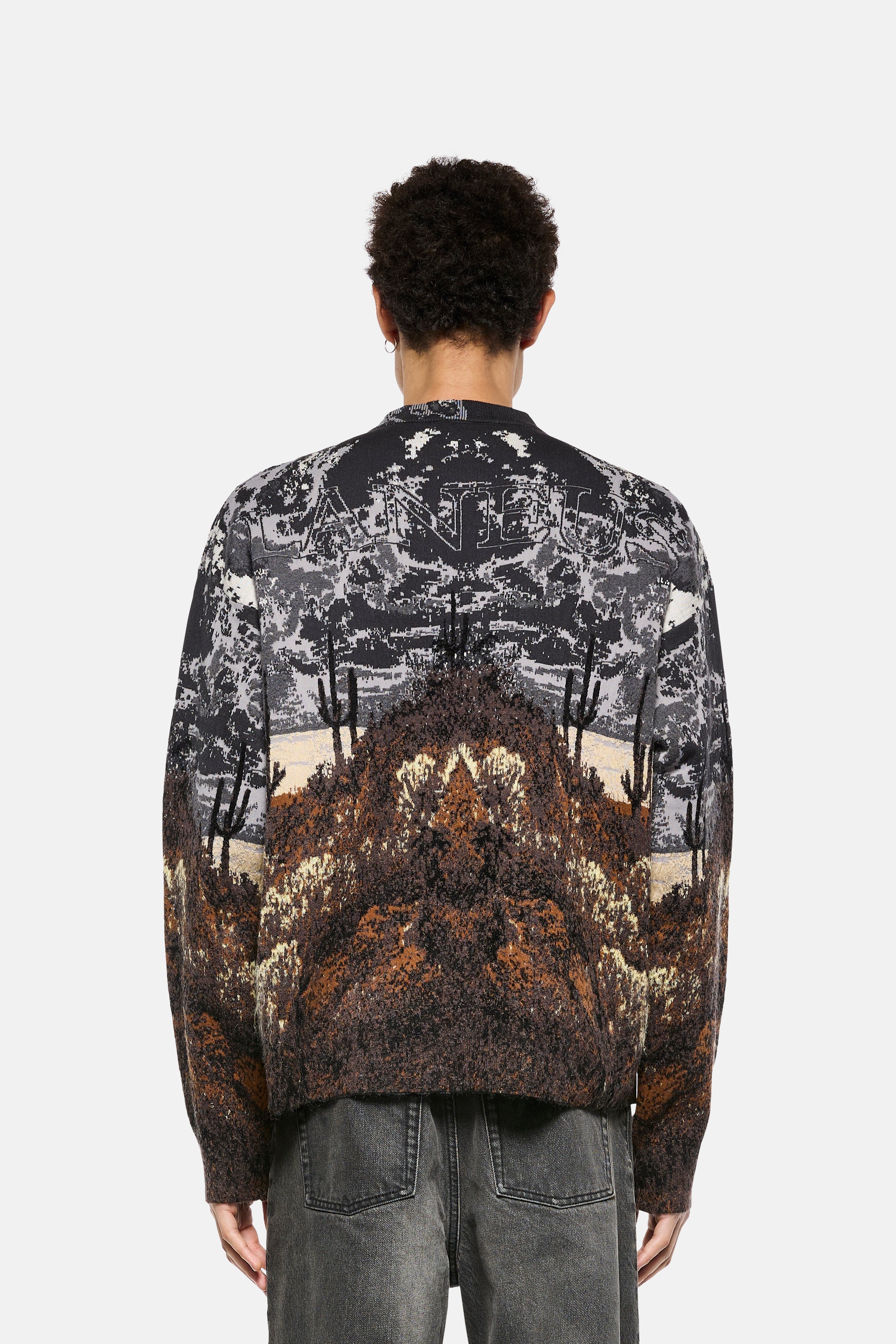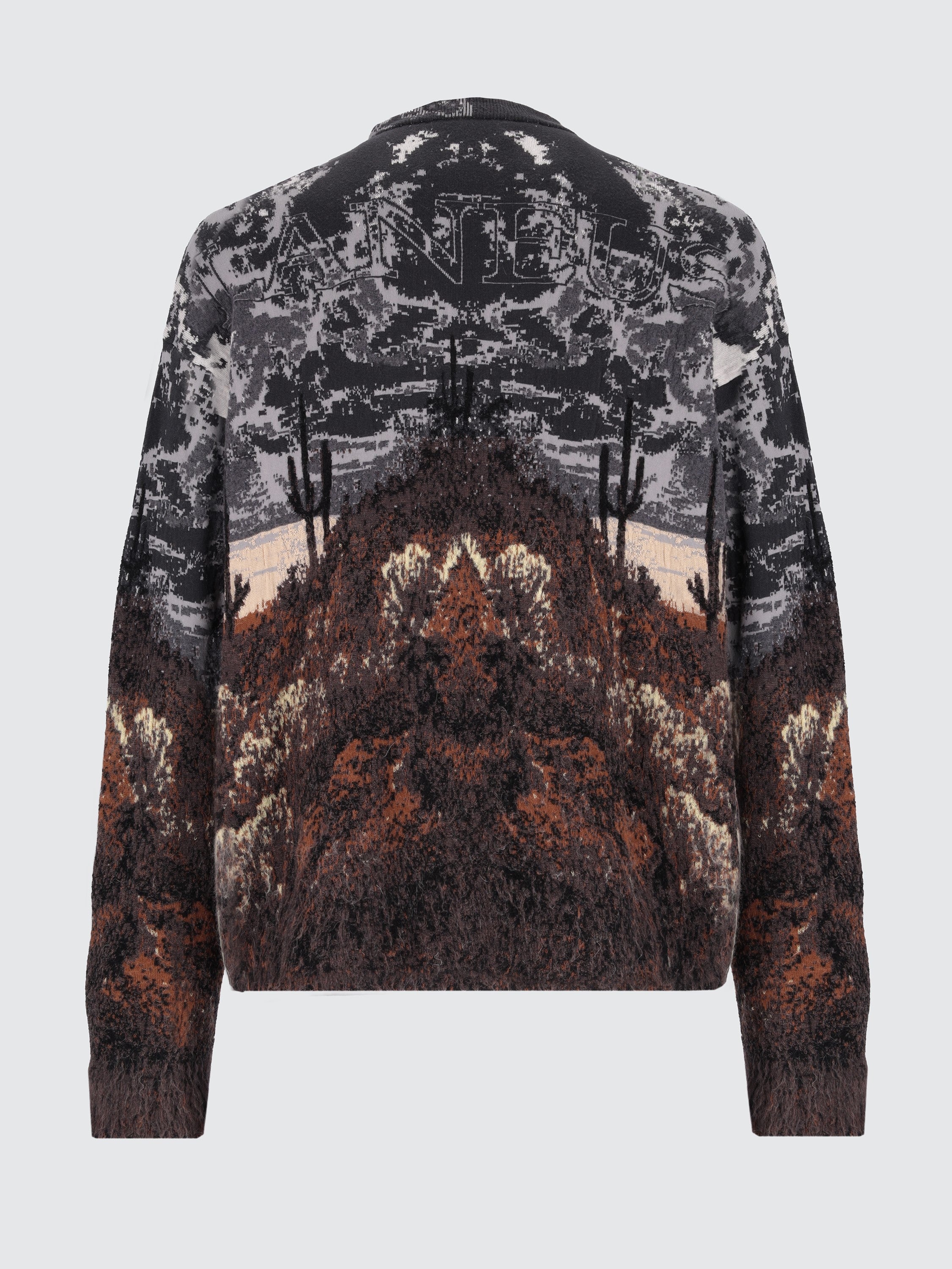 Maglia girocollo firmata Laneus, realizzata con una complessa lavorazione jacquard a 8 colori che raffigura un suggestivo paesaggio texano in stile “deserto onirico”. Il filato composto da un mix di lana e mohair presenta un interessante mix di texture lisce e pelose, che aggiungono profondità e movimento al disegno. La vestibilità è regular, con finiture a costine su collo, polsi e fondo. Un capo scenografico e ricercato, perfetto per look dal forte impatto visivo. Made in Italy.