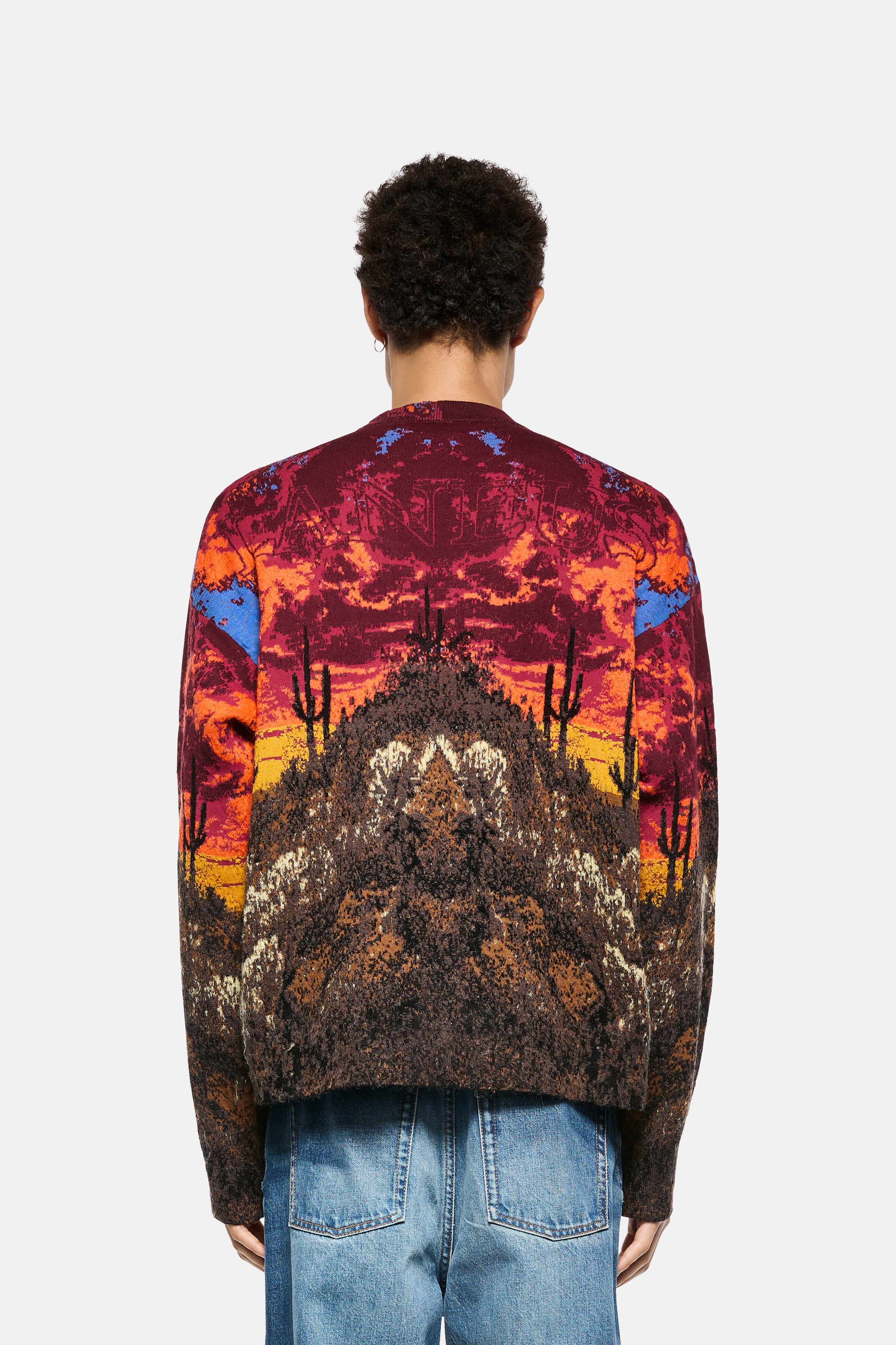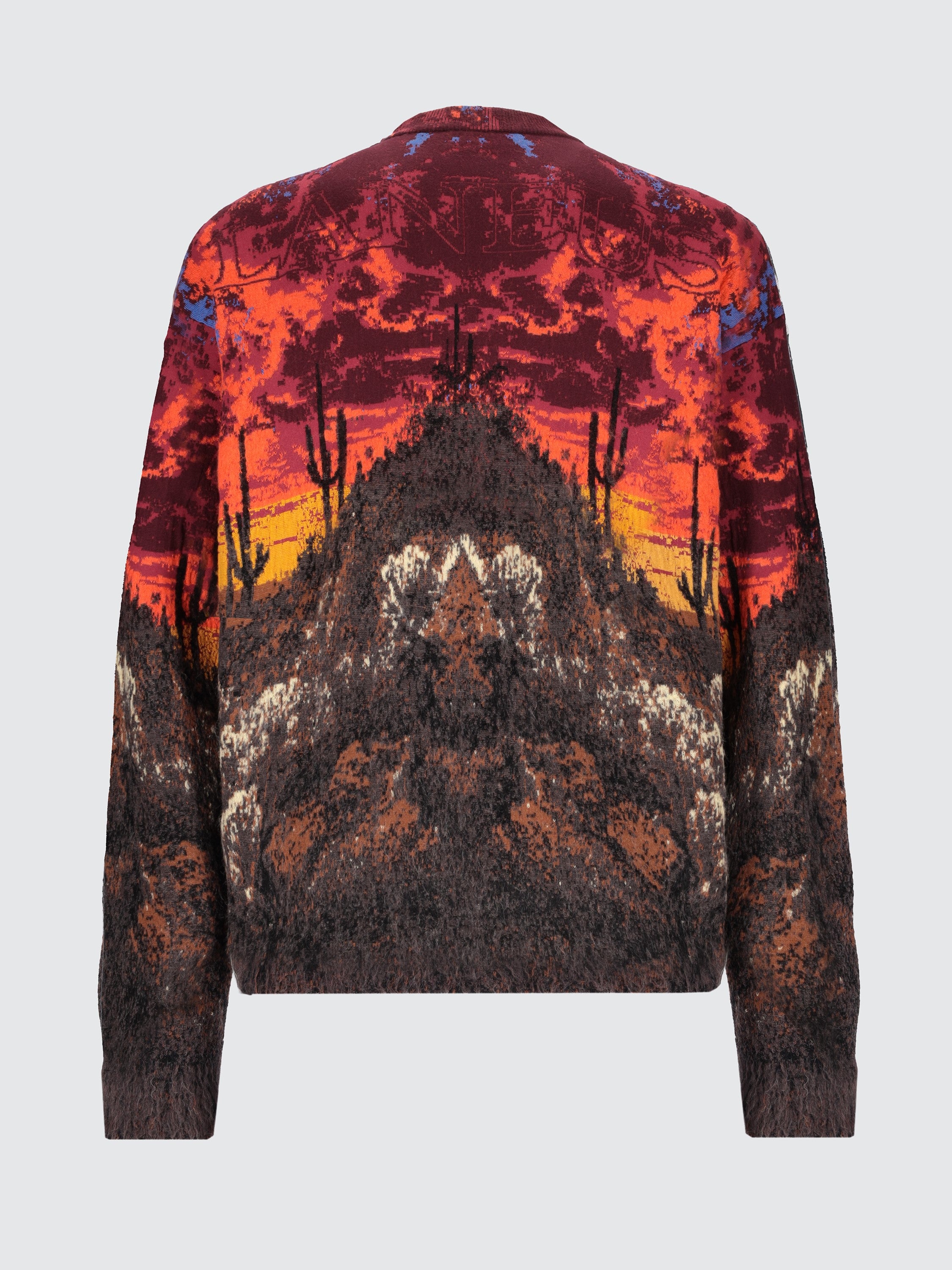 Maglia girocollo firmata Laneus, realizzata con una complessa lavorazione jacquard a 8 colori che raffigura un suggestivo paesaggio texano in stile “deserto onirico”. Il filato composto da un mix di lana e mohair presenta un interessante mix di texture lisce e pelose, che aggiungono profondità e movimento al disegno. La vestibilità è regular, con finiture a costine su collo, polsi e fondo. Un capo scenografico e ricercato, perfetto per look dal forte impatto visivo. Made in Italy.
