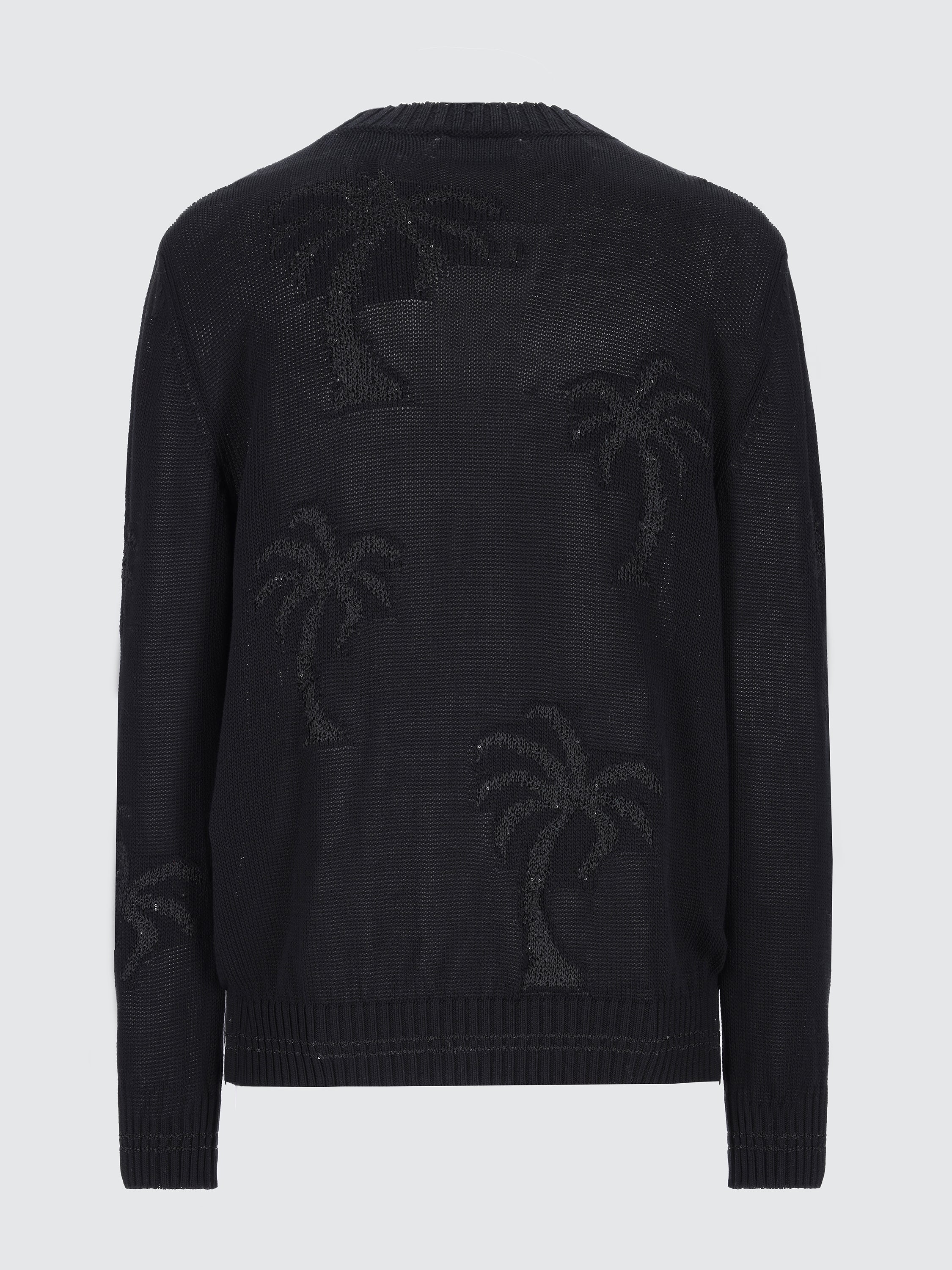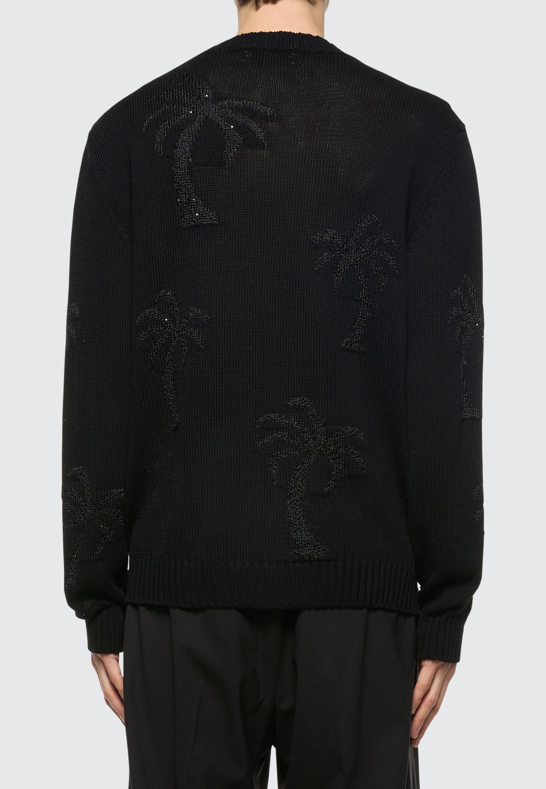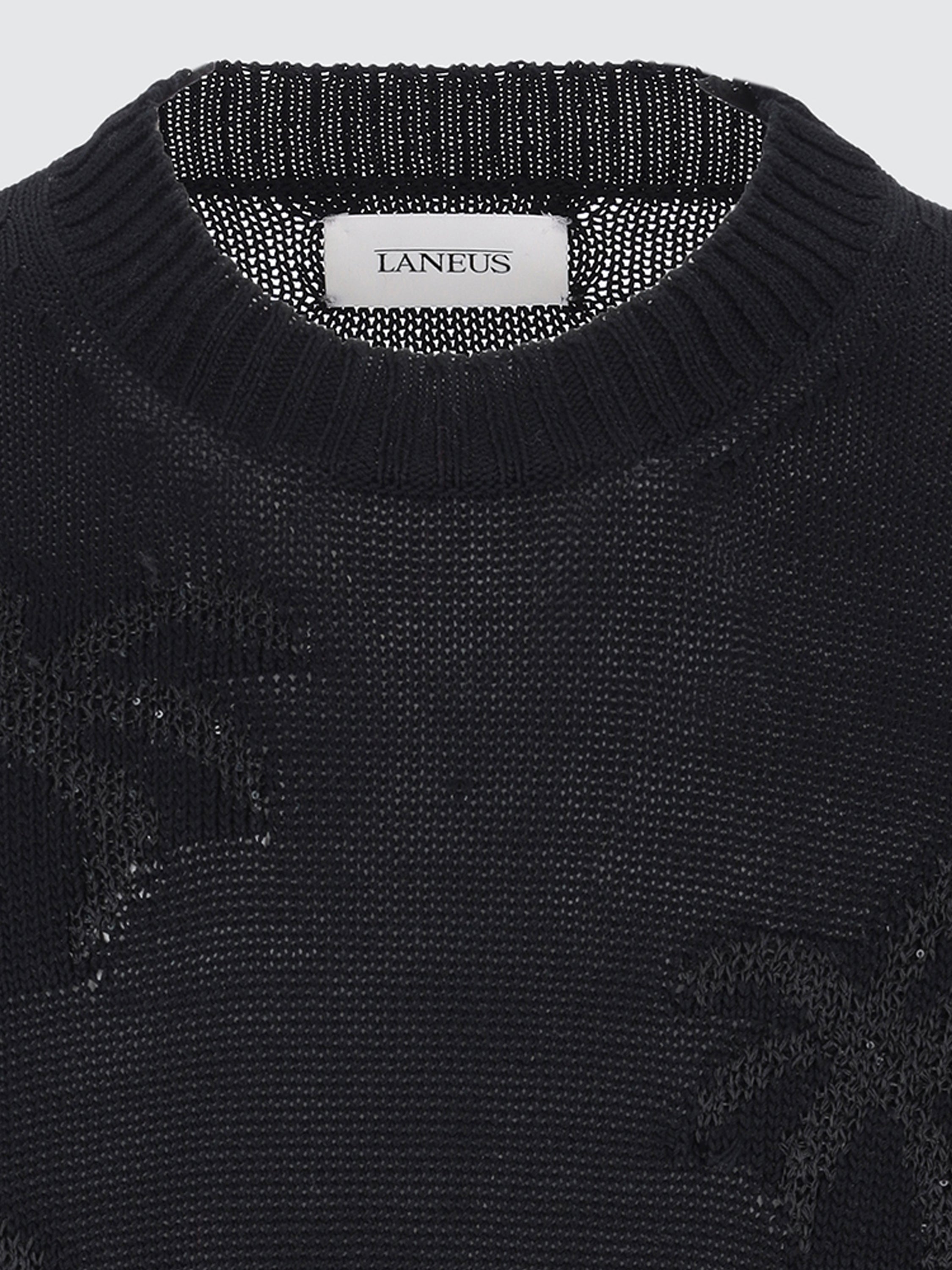 Maglia girocollo dal fit comodo firmata Laneus è realizzata in leggero filato di cotone con motivo jacquard tropicale, lavorata con filo di paillettes. Made in Italy. Il modello è alto 190 cm ed indossa una 48/M