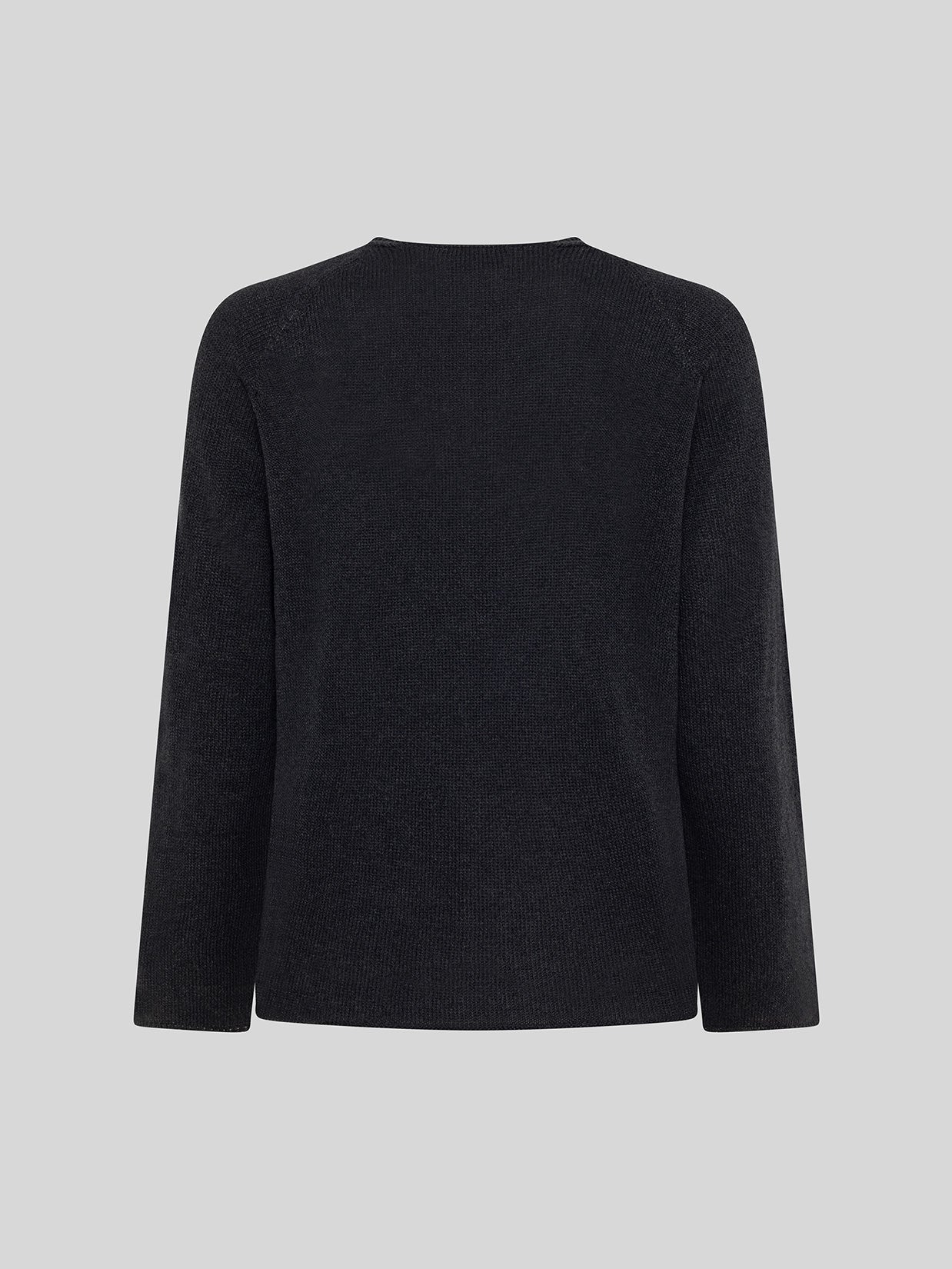 Maglia scollo V, realizzata in punto rasato tinta unita, con lavorazione intrecciata. La vestibilità è relaxed , con spalle leggermente scese e finiture roulè su polsi, fondo e collo. Made in Italy.
