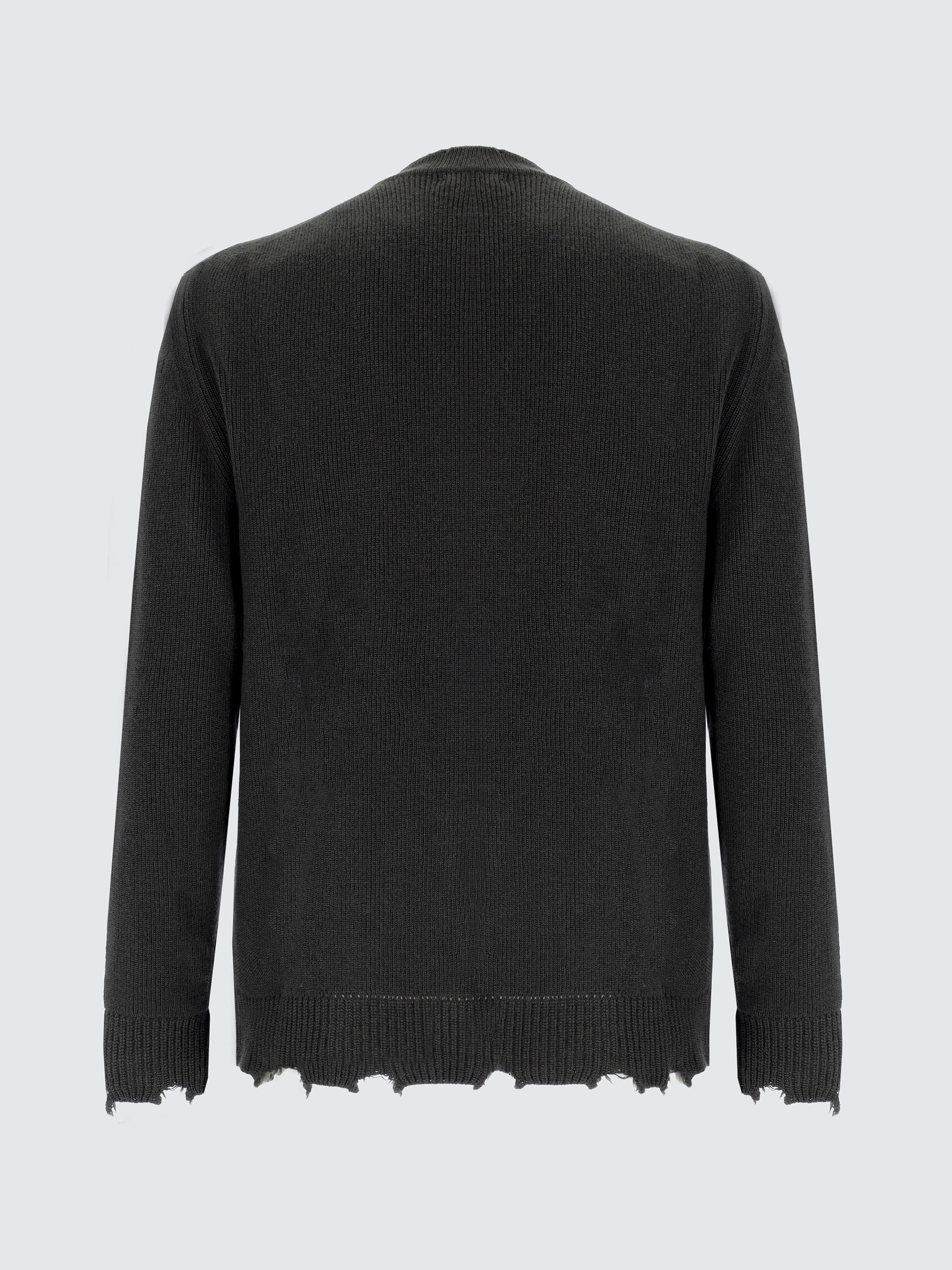 Maglia girocollo dal fit comodo, giro manica, caratterizzata da rotture sul collo, fondo manica e corpo. Realizzata in lana rasata. Il modello è alto 188 cm ed indossa una S.