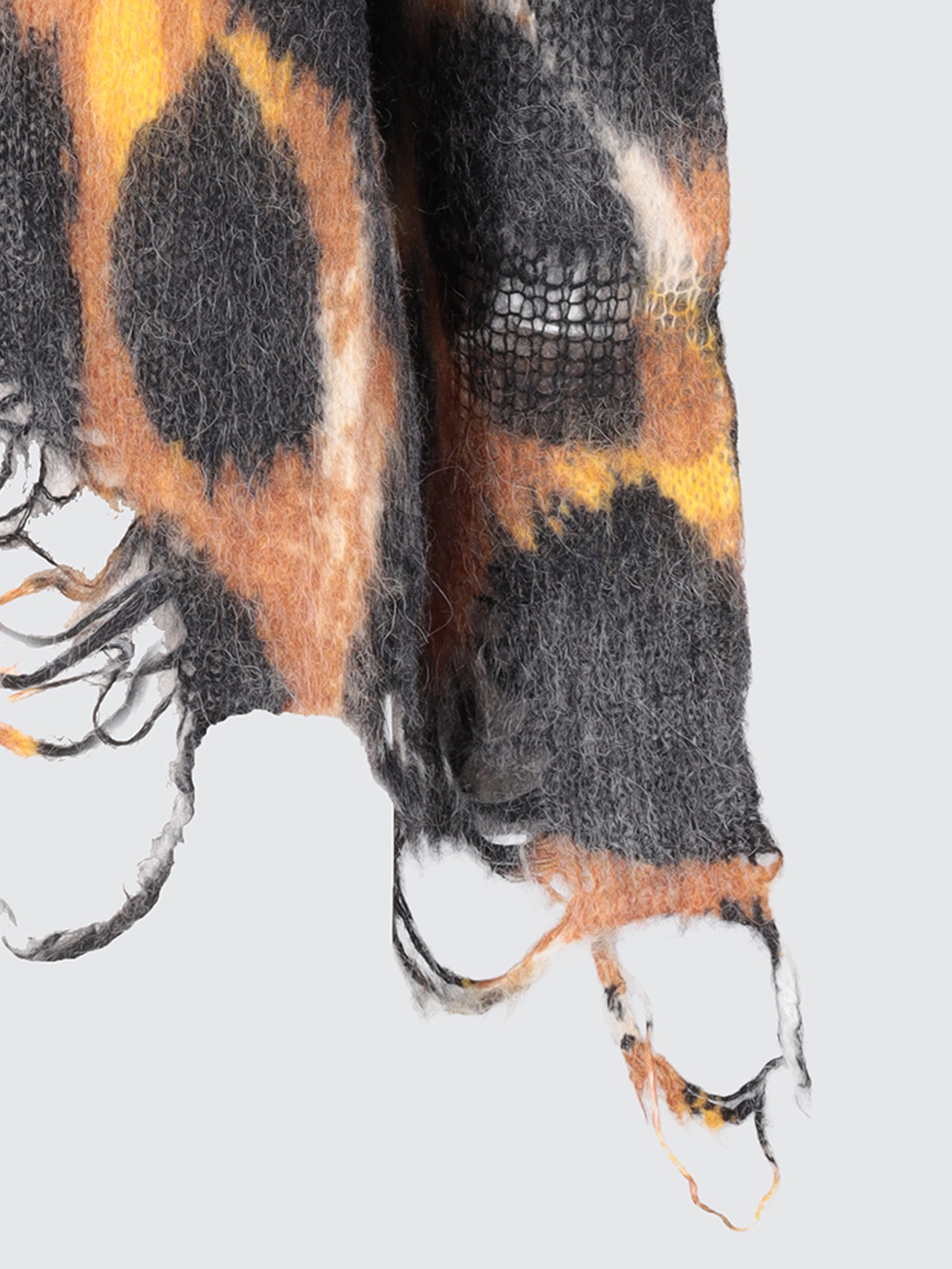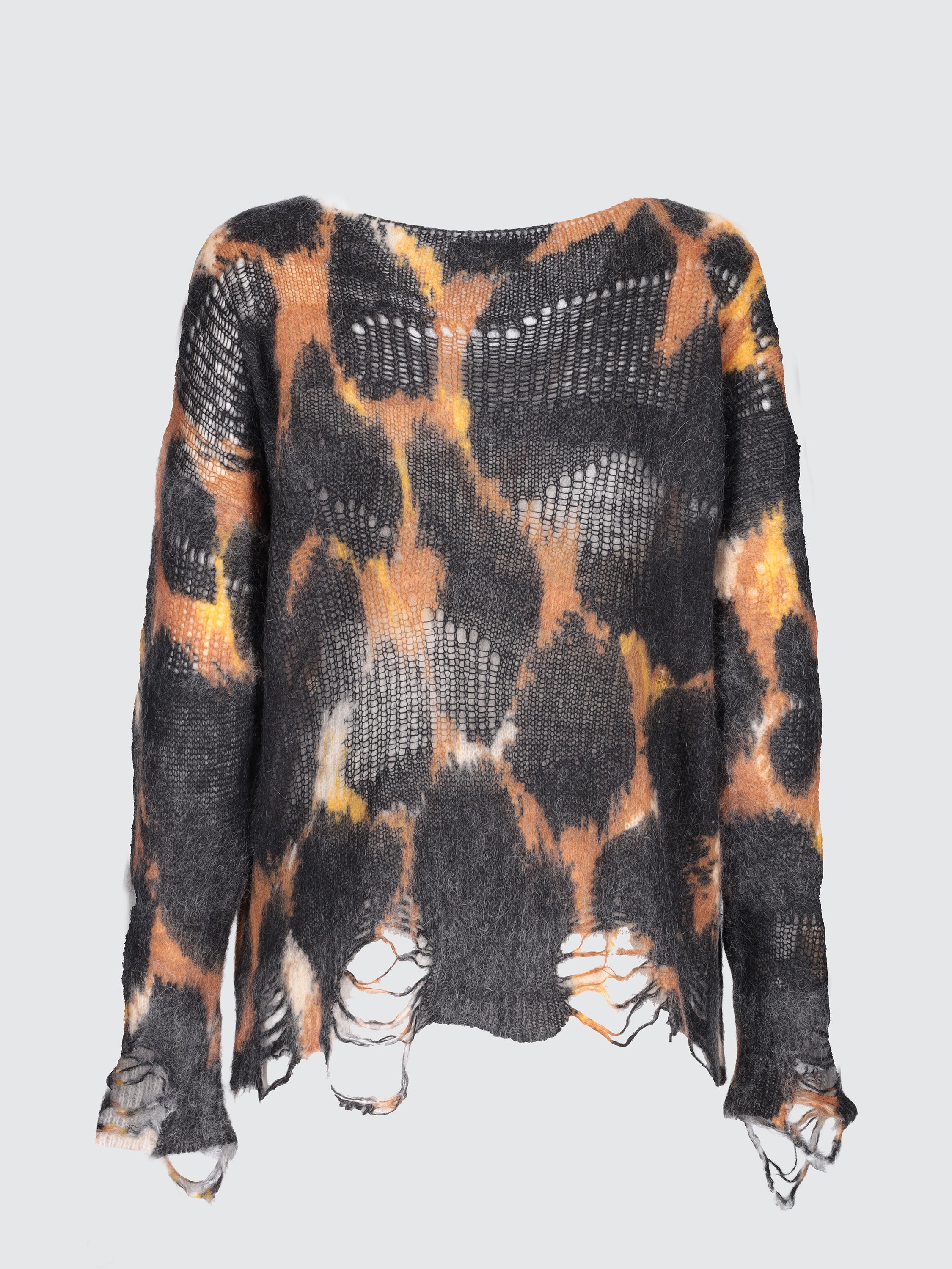Volume over e anima raw. Questa maglia girocollo firmata Laneus è realizzata in un mix di lana e baby alpaca con stampa leopardata e lavorazione jacquard, arricchita da inserti laminati per un tocco luminoso. Gli effetti di stramatura e le finiture destroyed ne accentuano l’estetica vissuta, rendendola un capo statement dal carattere deciso e contemporaneo. Made in Italy.