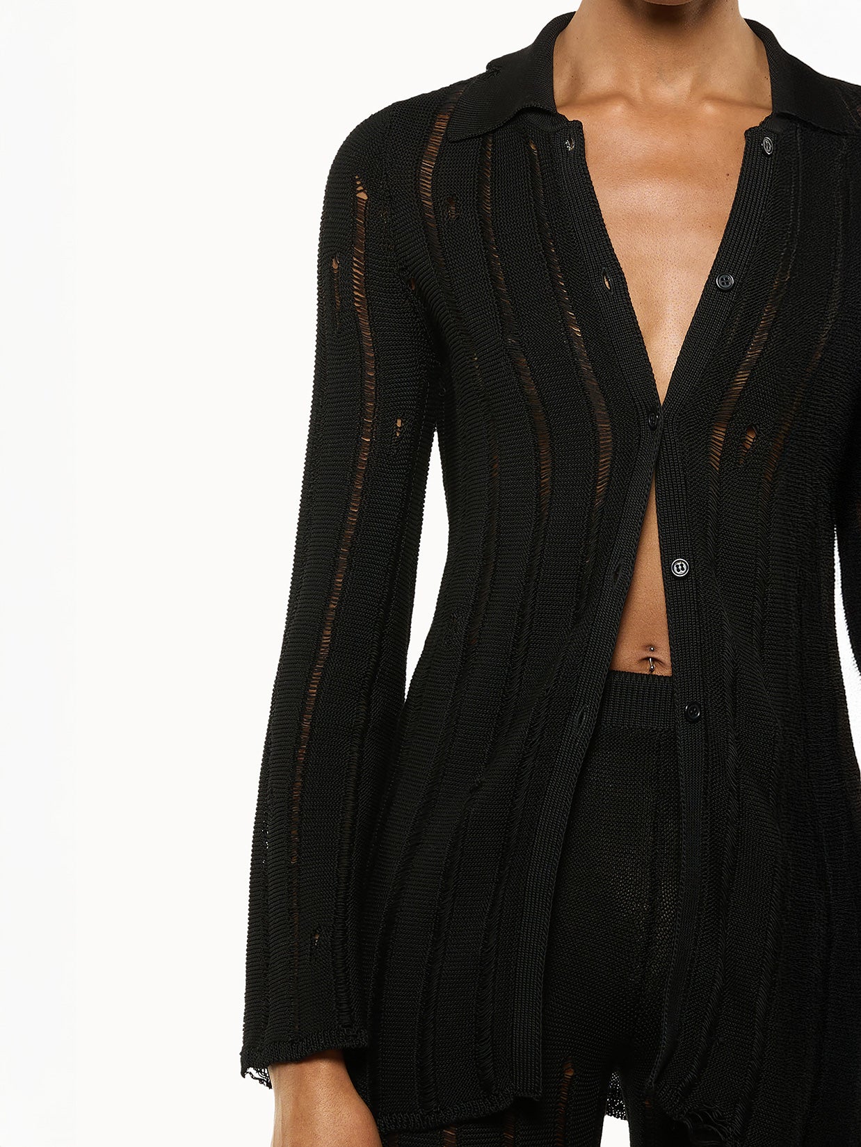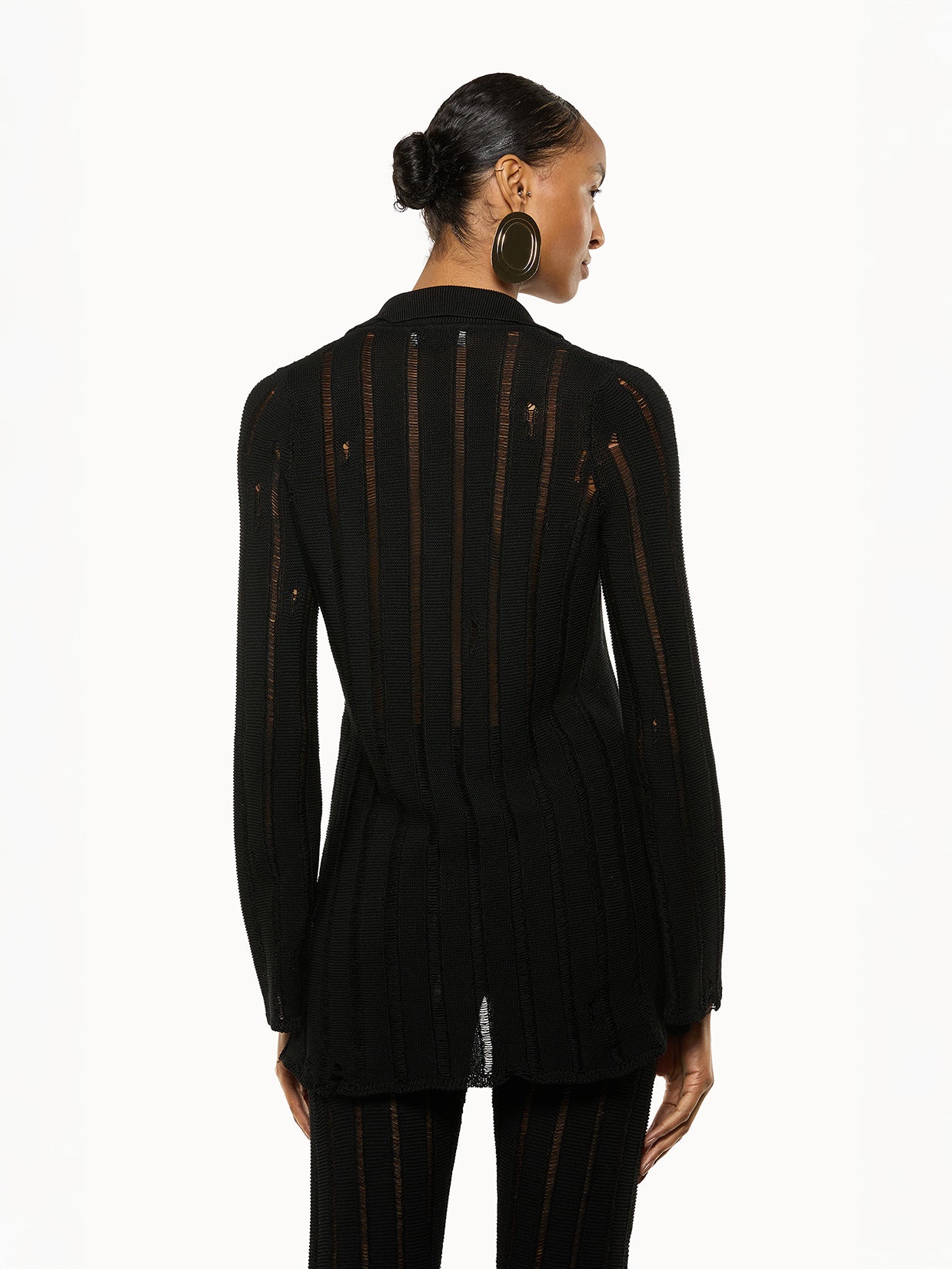 Estetica over e spirito contemporaneo. Questo cardigan over in maglia intrecciata è realizzato in un filato di cotone tinta unita. Presenta una chiusura frontale con bottoni e profili a con leggere rotture. La silhouette unisce volume, texture e carattere in un unico pezzo. Made in Italy.
