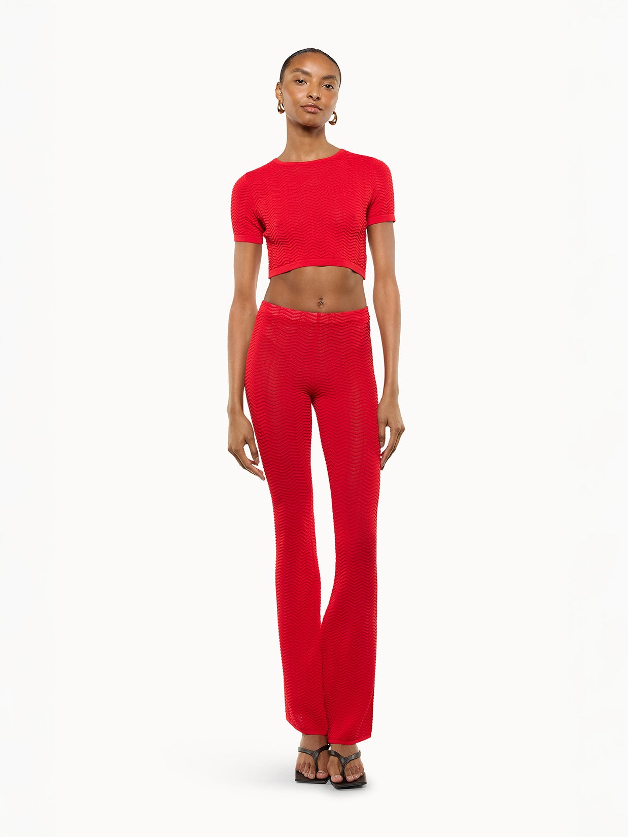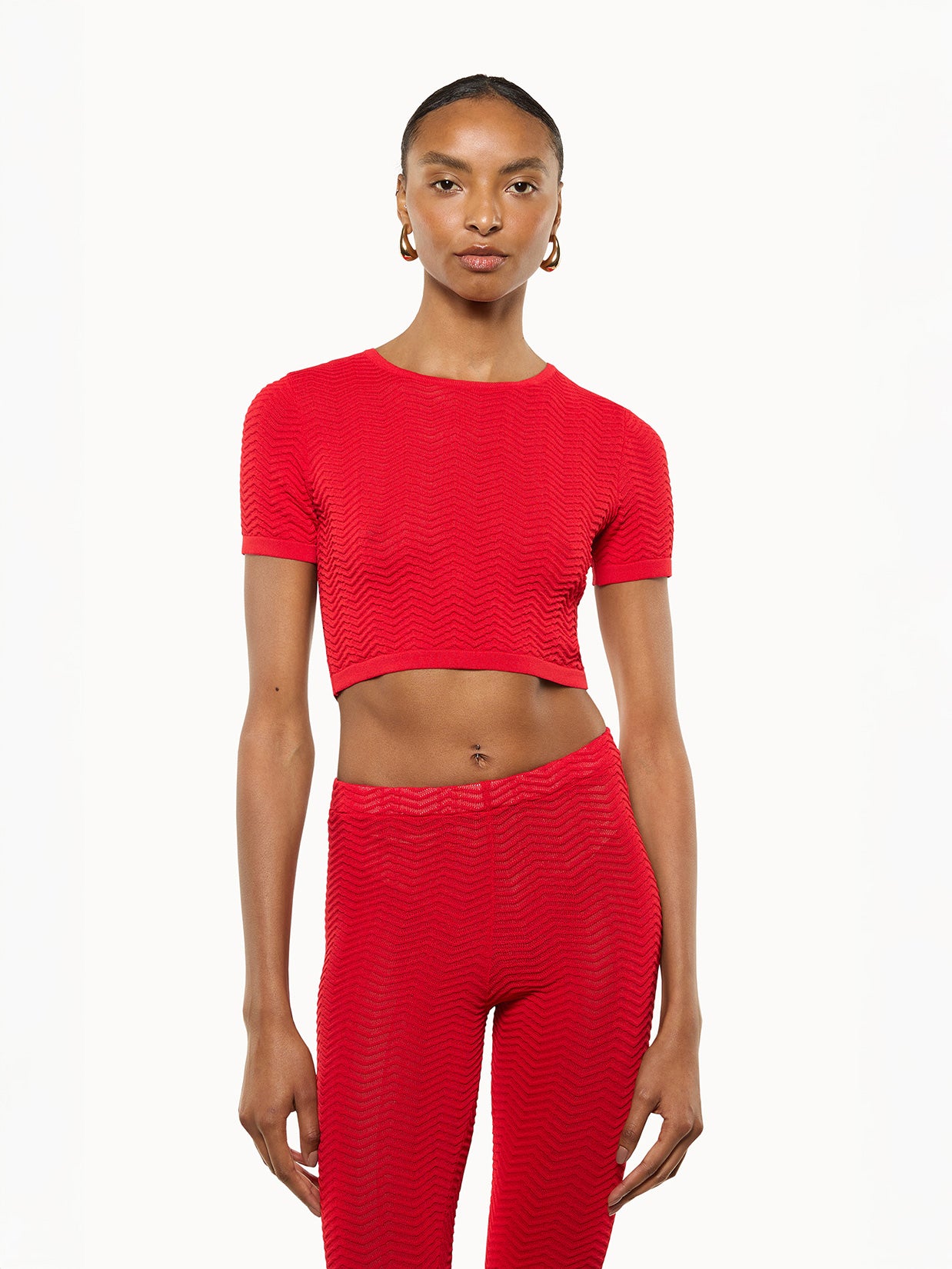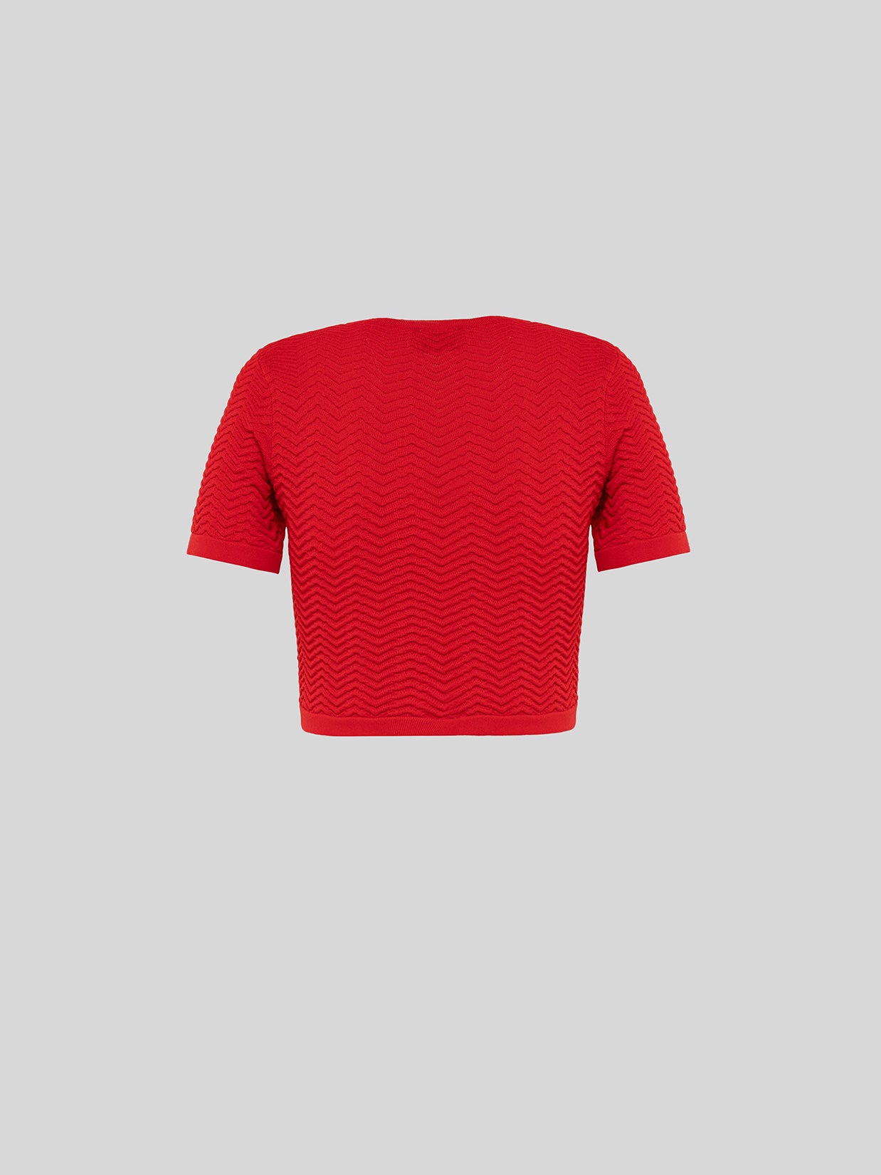 Top in maglia realizzato in un filato leggero leggermente traforato. Caratterizzata da una vestibilità crop e maniche corte. Made in Italy.