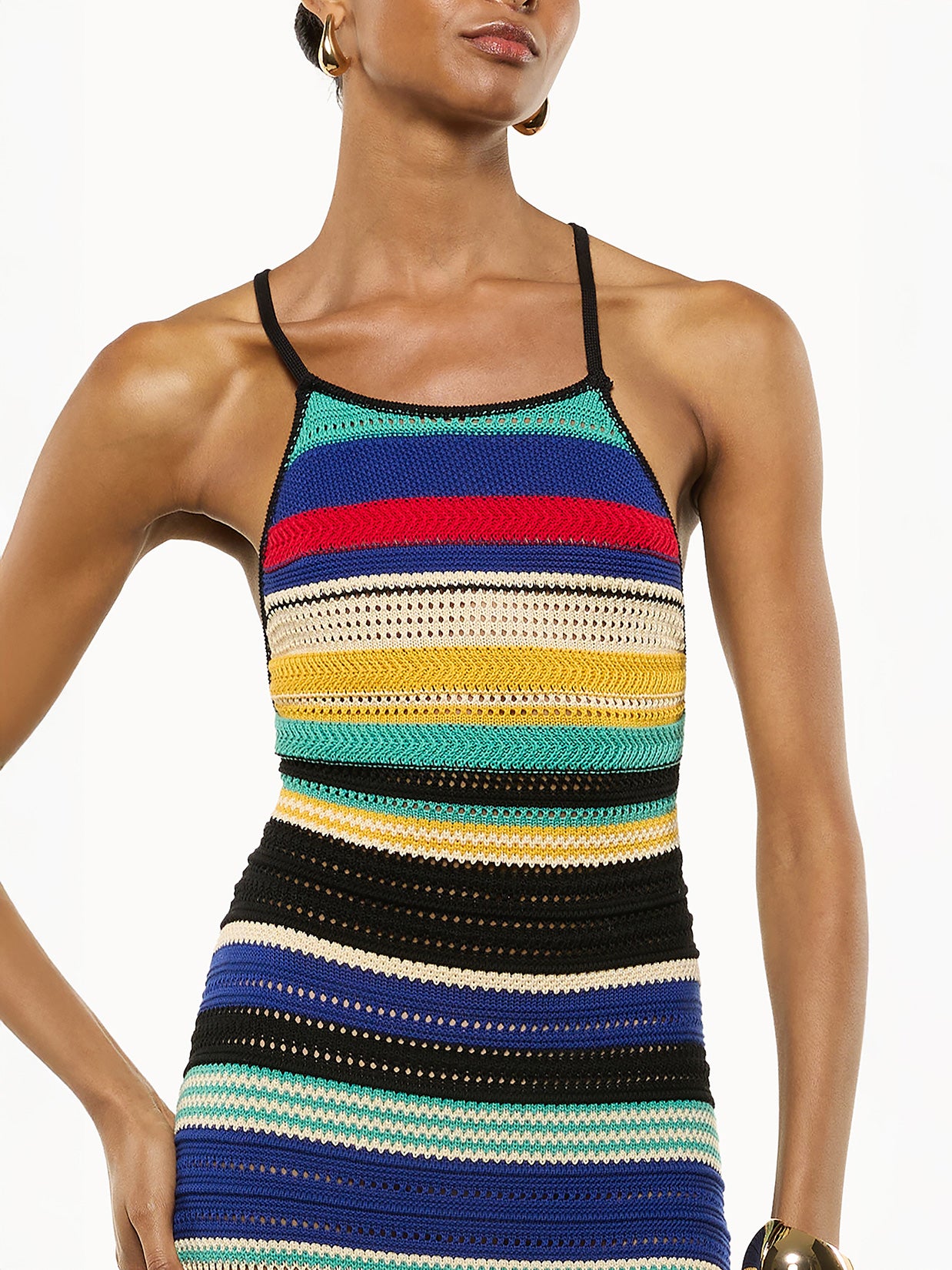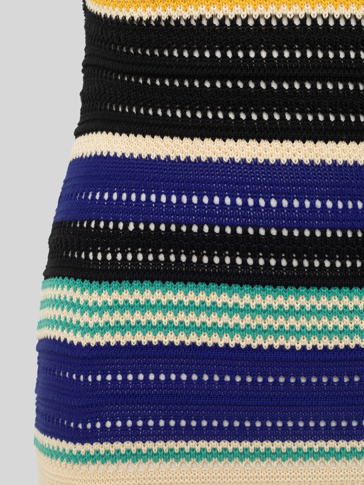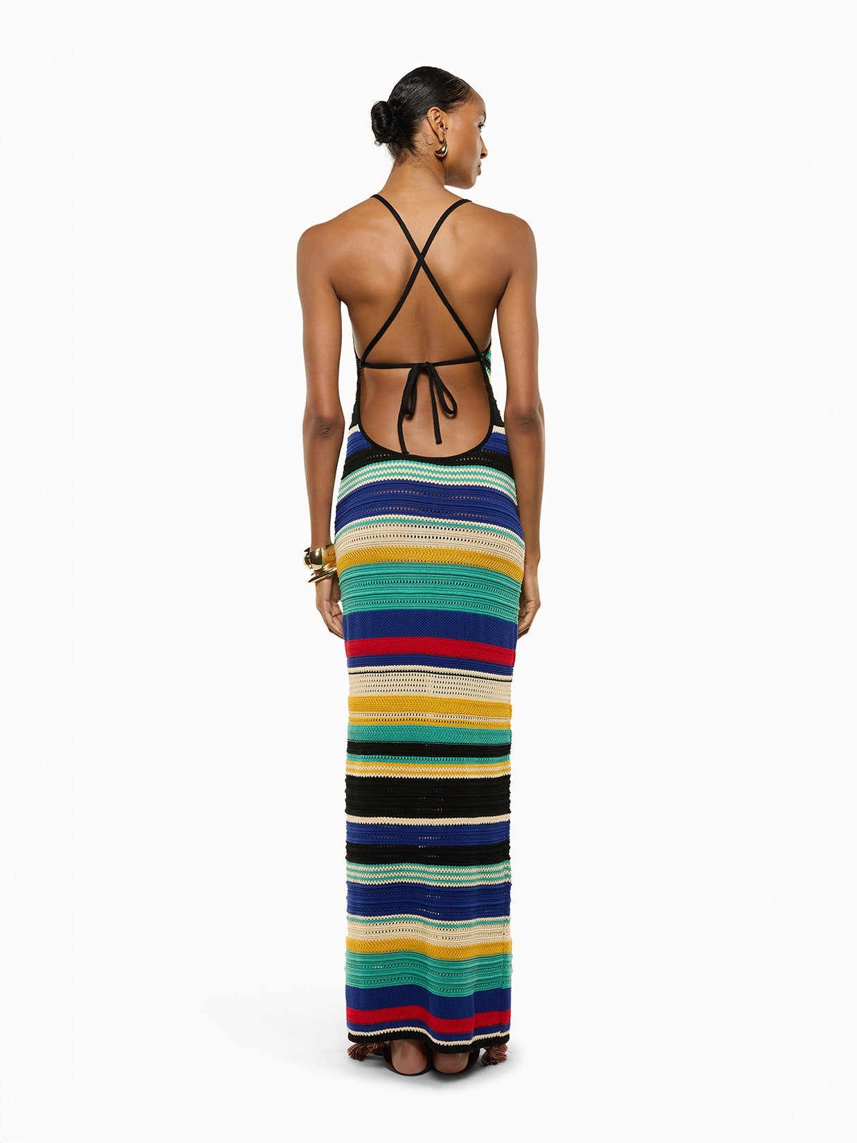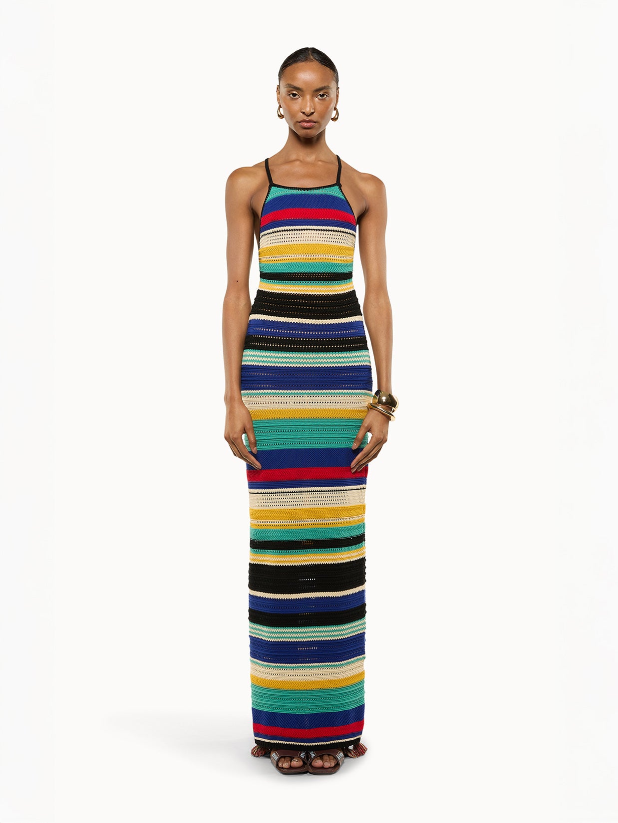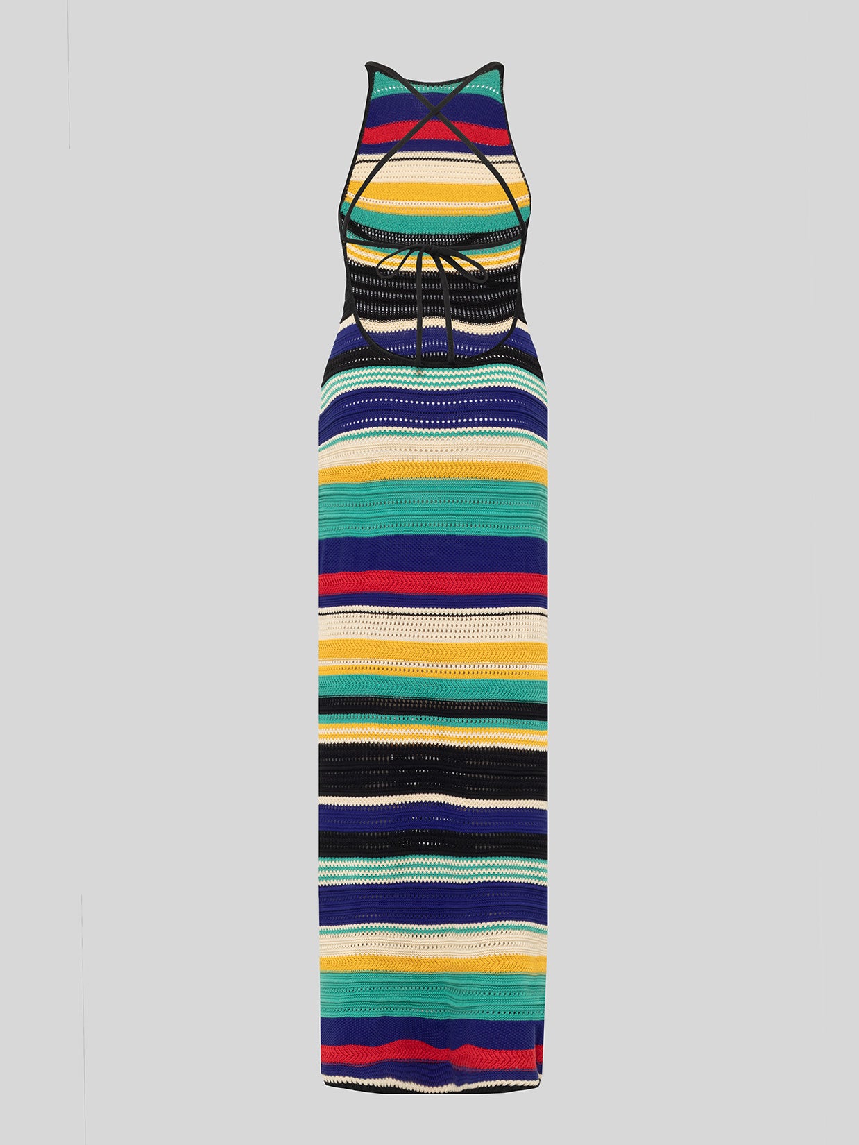 Il motivo multicolor Laneus torna in una nuova interpretazione stagionale. Questo abito smanicato in jacquard a righe presenta una vestibilità regular e una maxi lunghezza, per un equilibrio tra tradizione grafica e proporzioni contemporanee e uno ampio scollo sul retro che dona movimento al capo. Realizzato in cotone, fonde comfort visivo, morbidezza e leggerezza. Made in Italy.