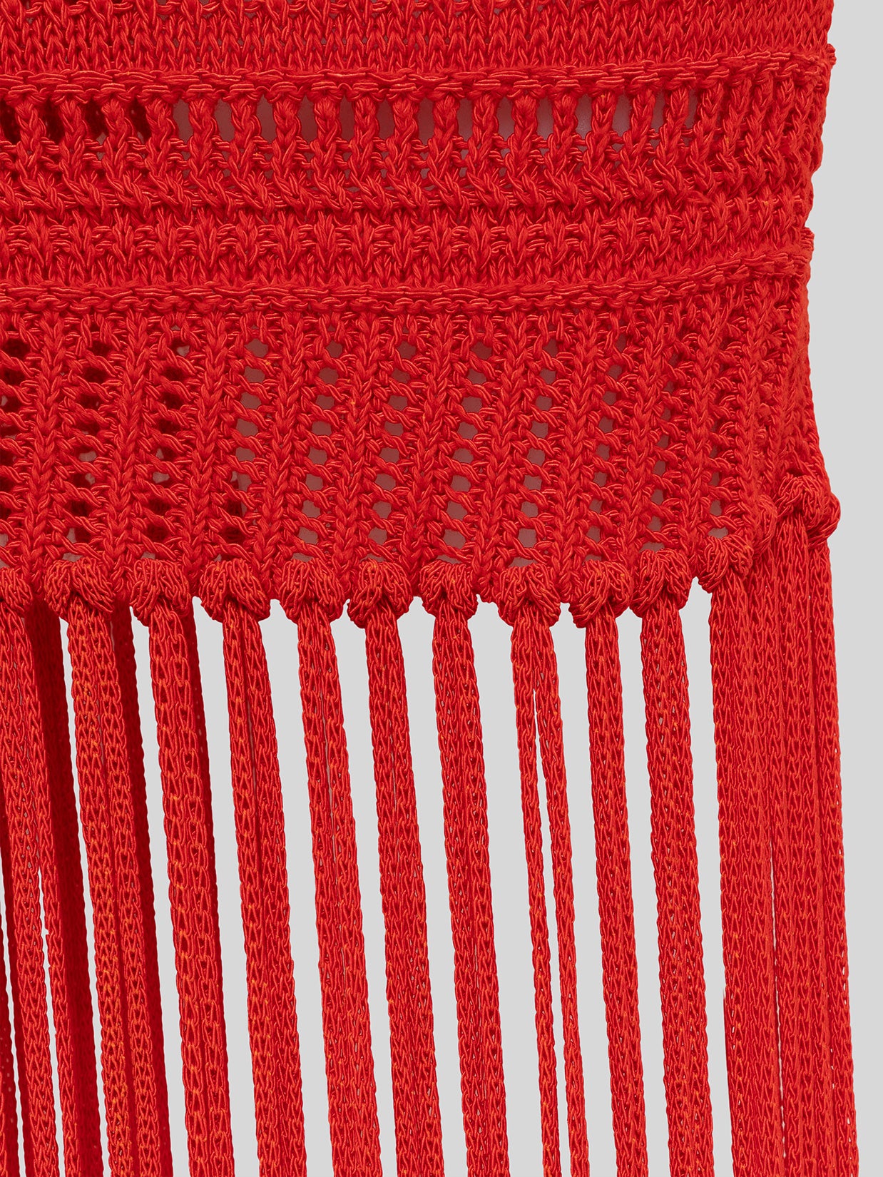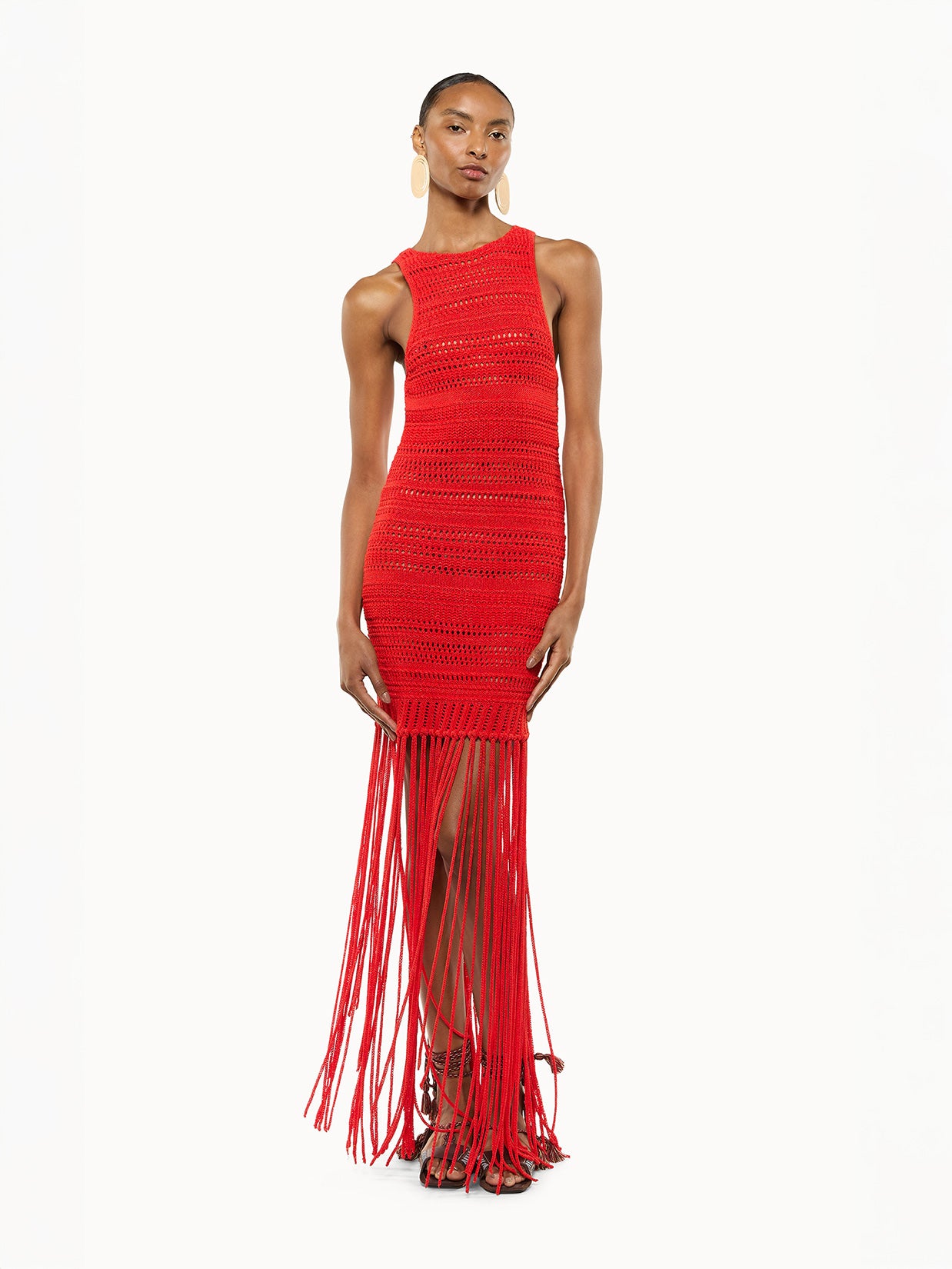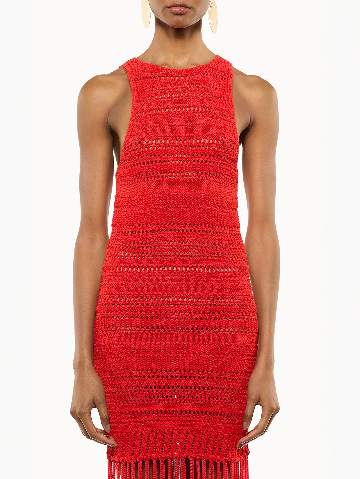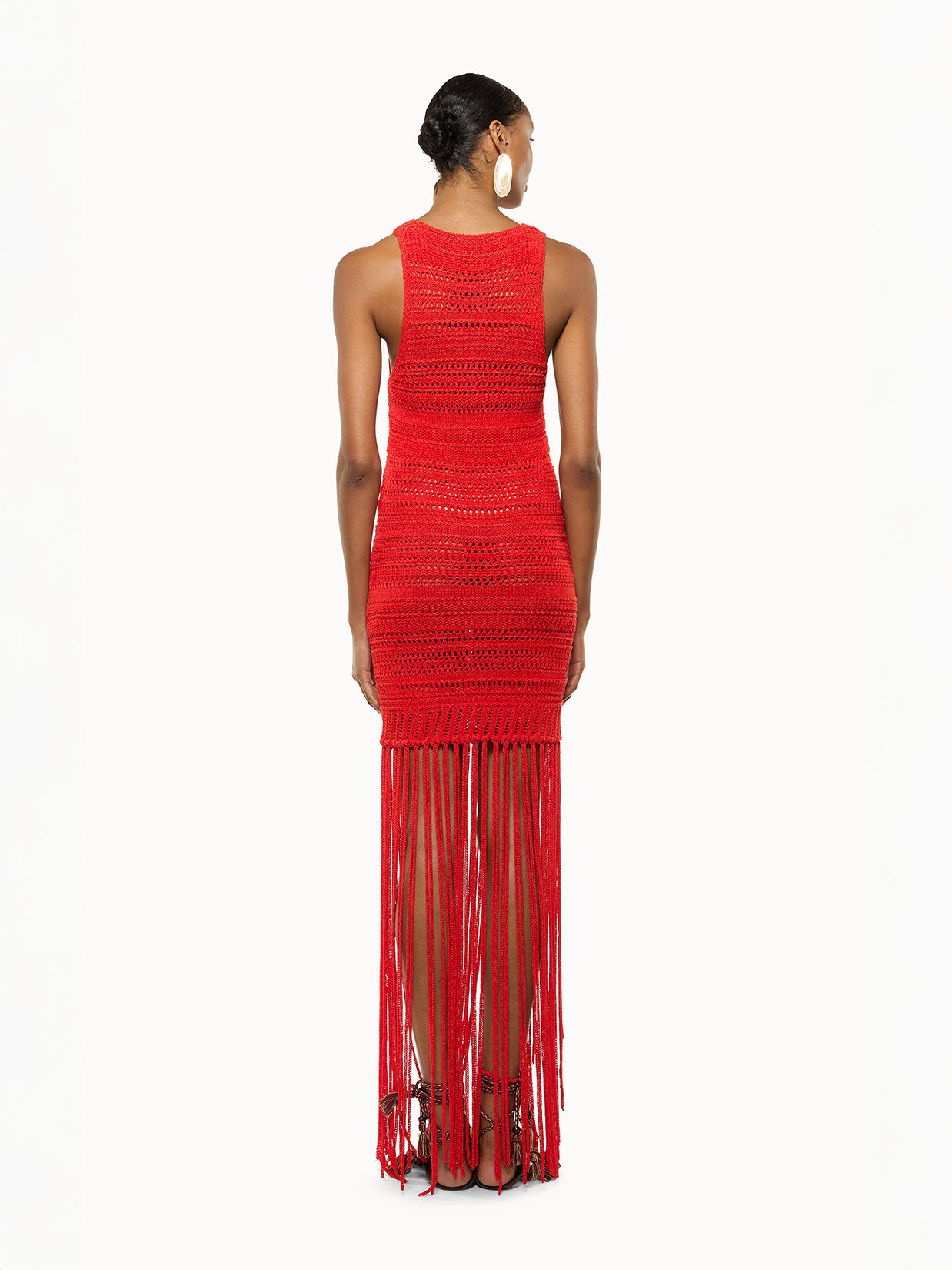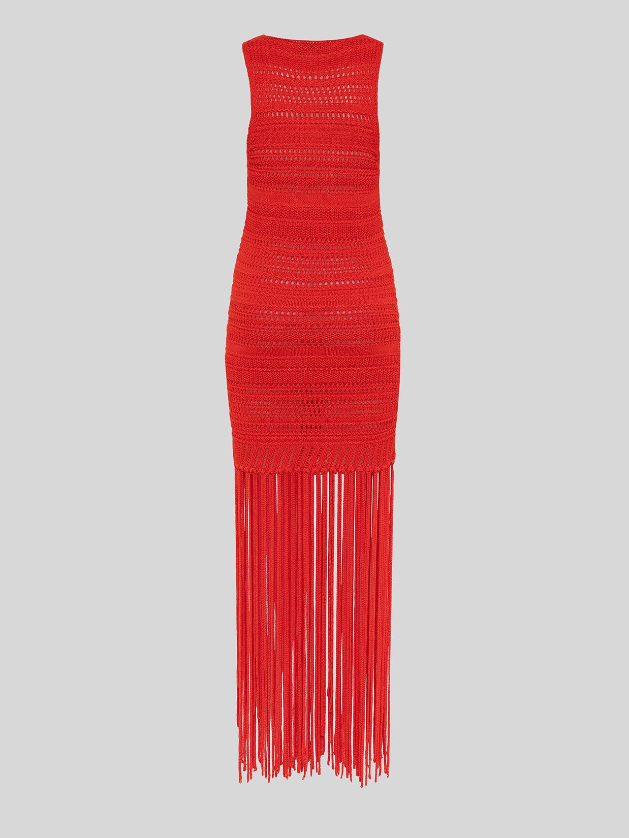 Eleganza minimale e linee pulite. Questo abito smanicato in maglia, firmato Laneus è realizzato in misto viscosa. Presenta una vestibilità regular e maxi frange sul fondo che donano movimento al capo. Made in Italy.